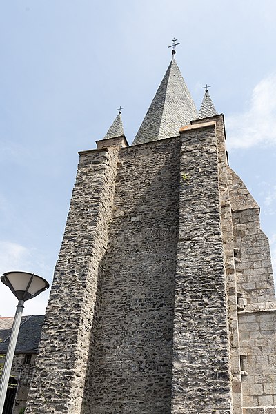 L'édifice est orienté selon l'axe est-ouest. À l'ouest se dresse un imposant clocher surmonté d'une flèche entourée de quatre clochetons et épaulé par de puissants contreforts ; la flèche a été rebâtie en 1854. La nef, dont le portail s'ouvre au sud, est flanquée de deux collatéraux dont les travées orientales forment un faux transept, et le chœur s'achève par un chevet plat. De la construction romane subsistent six piliers de la nef surmontés de chapiteaux sculptés.