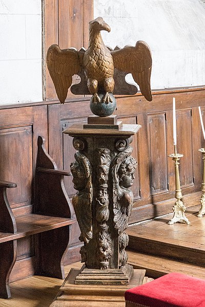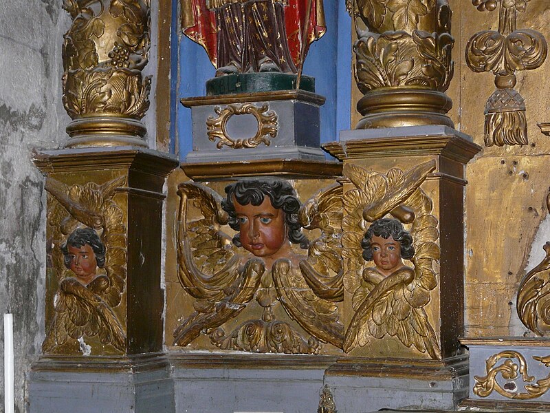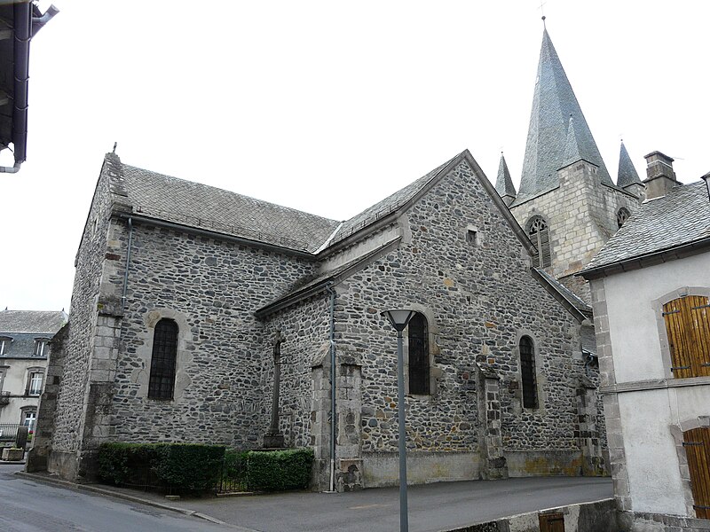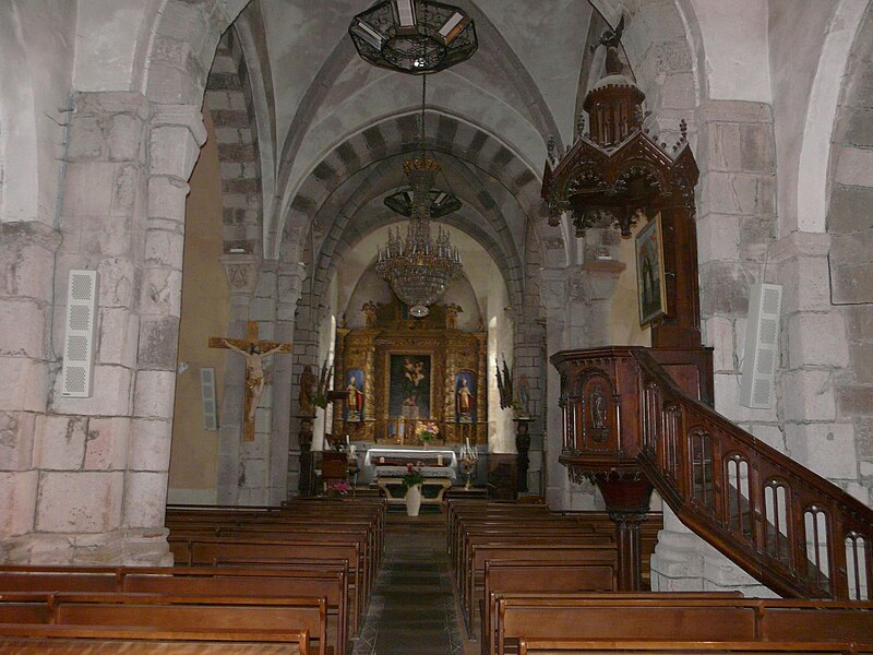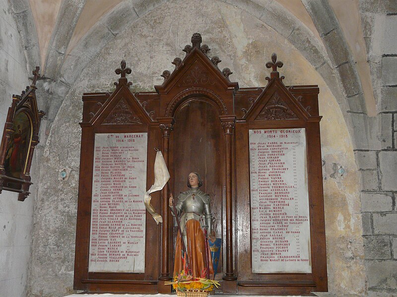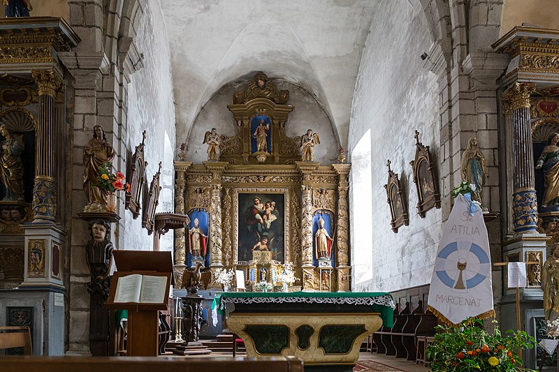 La documentation et l'iconographie mentionnent notamment le clocher, le portail, la nef, le chœur avec le retable majeur, le retable du Rosaire et l'aigle-lutrin. Pour approfondir, voir la notice sur le site de la commune de Marcenat et la liste des monuments historiques du Cantal.