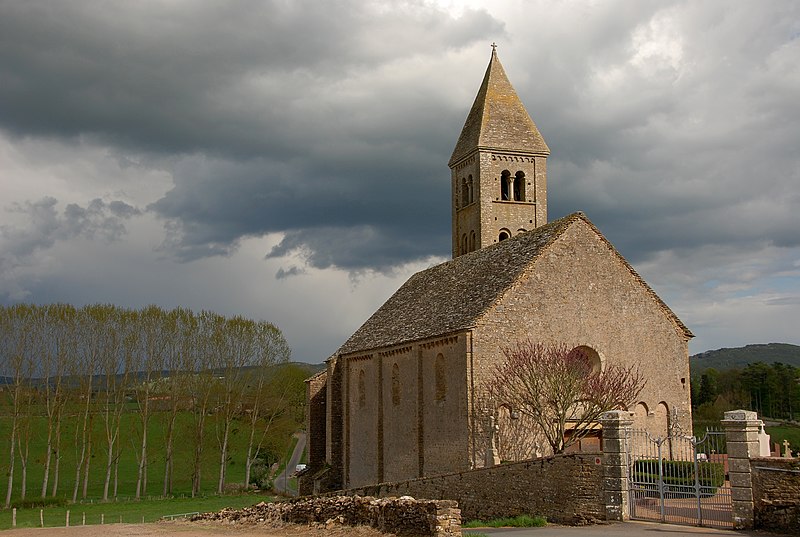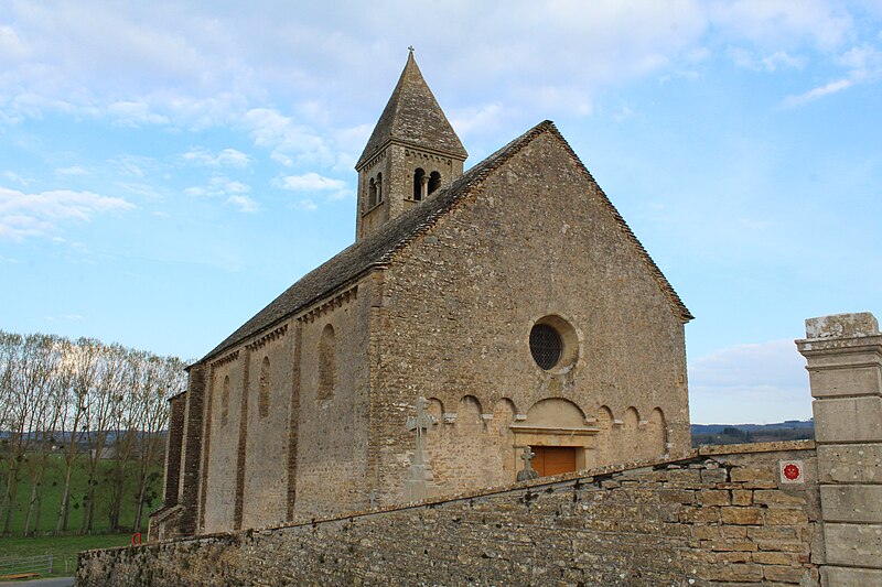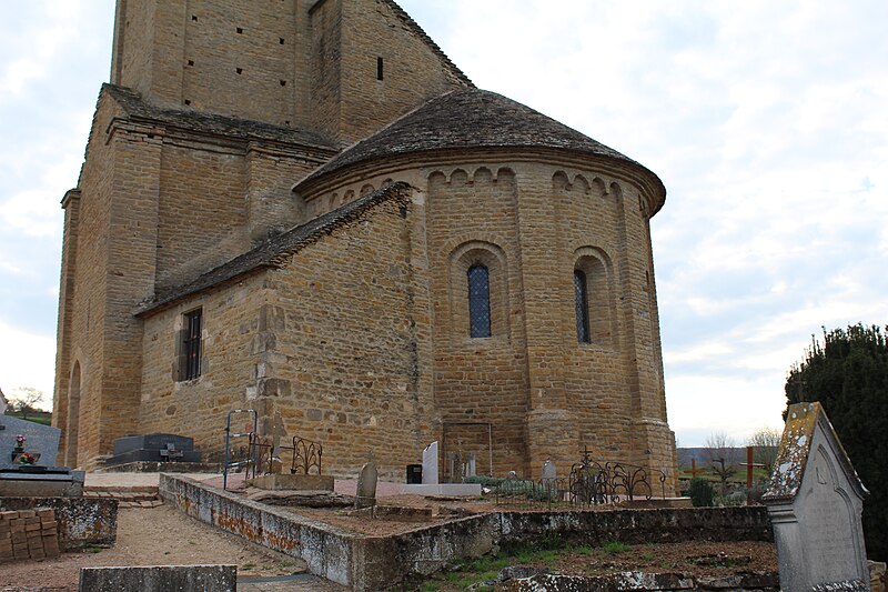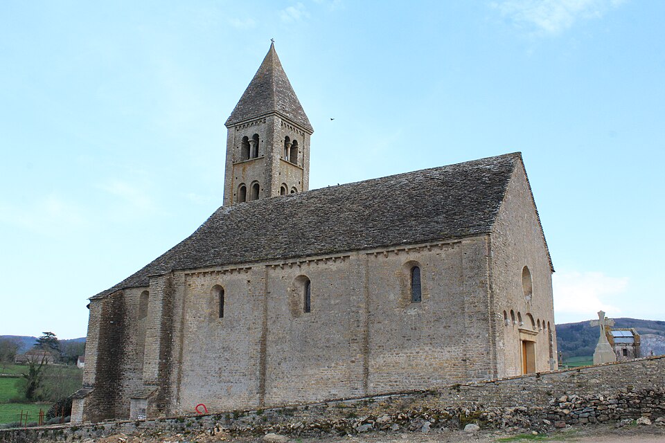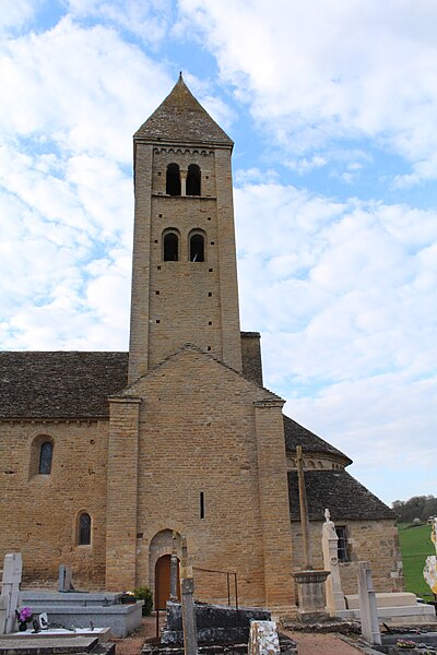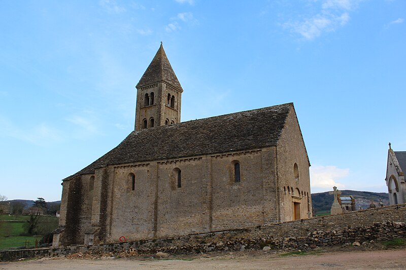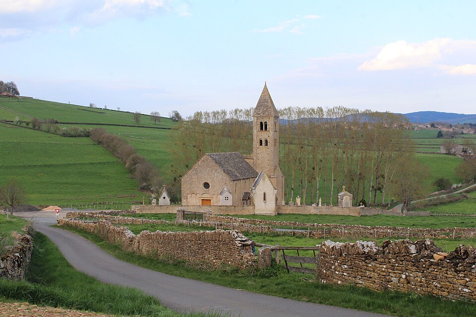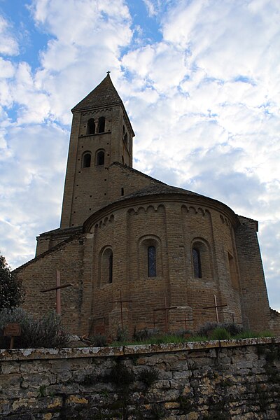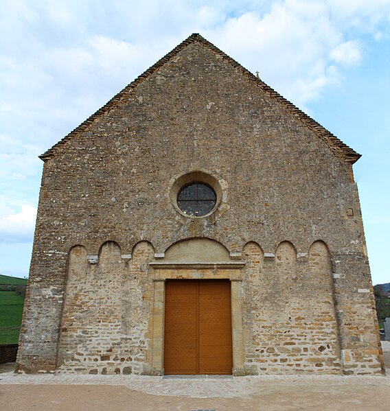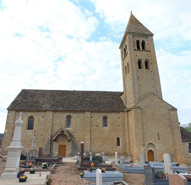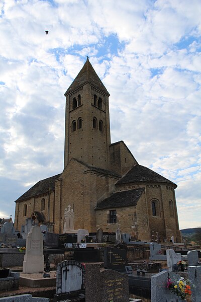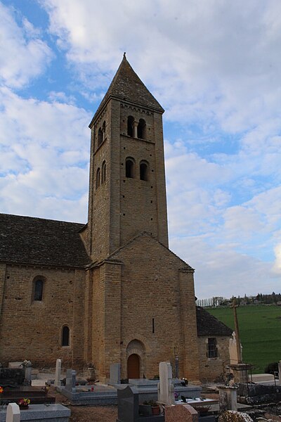 L'église Saint‑Blaise est un édifice roman situé à Mazille, en Saône‑et‑Loire, en Bourgogne‑Franche‑Comté. Implantée en contrebas du bourg, ses proportions se détachent harmonieusement sur le vallon verdoyant qui lui sert d'écrin. En 962, Adon, évêque de Mâcon, ajoute l'église de Mazille aux terres données aux moines de Cluny. L'édifice, sans doute construit peu avant et alors dédié à saint Julien, forma le centre d'un premier groupe d'habitat et correspond en partie à l'église actuelle. Classée au titre des monuments historiques par arrêté du 22 octobre 1913, l'église avait fait l'objet l'année précédente d'une demande de protection formulée par l'Académie de Mâcon auprès de la Commission des monuments historiques. L'Académie avait alors inscrit l'église de Mazille parmi une liste de douze monuments jugés parmi les plus anciens et intéressants de l'arrondissement de Mâcon. Sur le plan architectural, le chevet roman se compose d'une abside semi‑circulaire ornée de bandes lombardes, percée de fenêtres et couverte de lauzes. L'abside est surmontée d'un clocher roman percé de nombreux trous de boulin et ouvert par des baies cintrées géminées aux deux étages supérieurs. Les baies géminées de l'avant‑dernier étage sont séparées par un simple trumeau, celles du dernier étage par une colonne. L'ensemble du mobilier date principalement des XVIIIe et XIXe siècles, comprenant notamment une grille en fer forgé, un bénitier et des statues de la Vierge à l'Enfant et de sainte Philomène. L'église abritait autrefois un retable de Michel Bouillot sur le thème de l'Adoration des Bergers, désormais visible dans l'une des chapelles du collatéral nord de l'abbatiale Saint‑Philibert de Tournus.