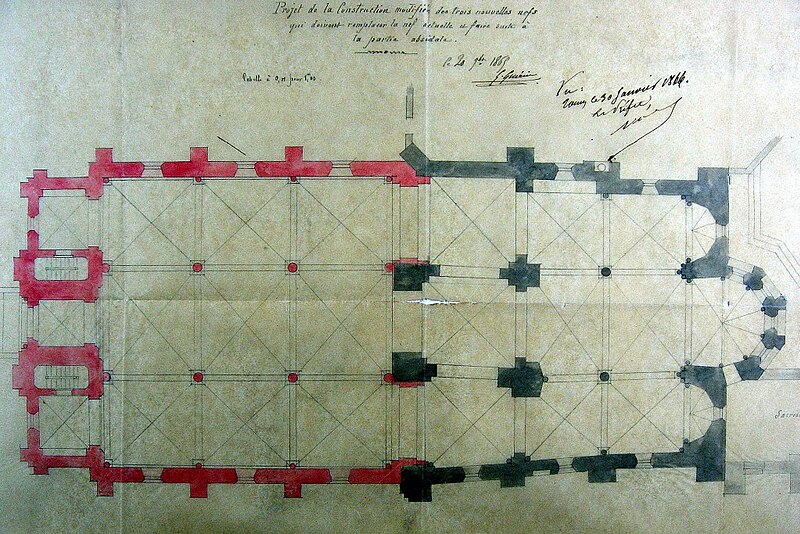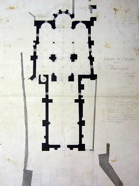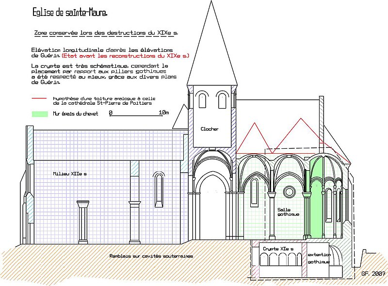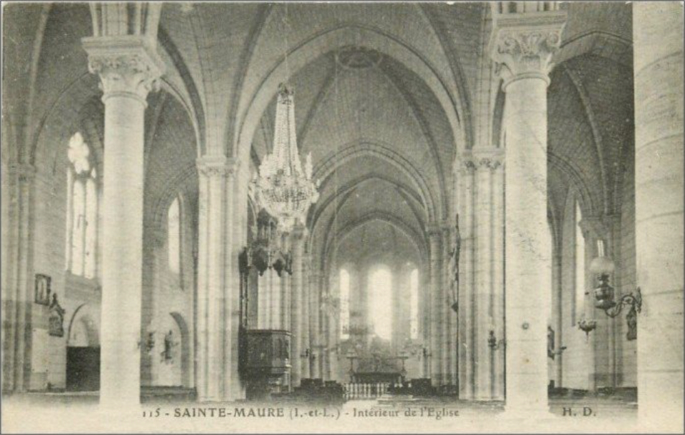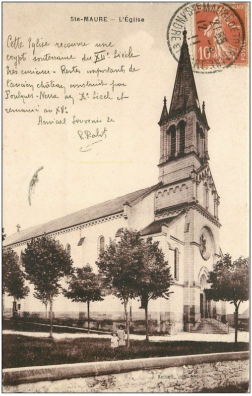 L'église paroissiale, située au centre-bourg de Sainte-Maure-de-Touraine dans le département d'Indre-et-Loire, repose sur une crypte ancienne et présente un chœur du XIIIe siècle couvert de voûtes angevines. Un premier sanctuaire aurait été édifié au VIe siècle et consacré par Euphronius, l'un des premiers évêques de Tours. À la fin du XIIe siècle, l'édifice primitif fut remplacé par une nouvelle église organisée en deux parties distinctes, séparées par un faux transept et surmontées d'un clocher central appuyé sur quatre piliers massifs, renforcés au XVe siècle. La partie orientale, plus élevée, comprenait le sanctuaire, le chœur et deux nefs latérales ; la partie occidentale, située un mètre en contrebas, comportait une grande nef du XIIe siècle qui n'était pas voûtée. Des traces sur les murs et les piliers laissent penser que cette nef occidentale avait été conçue pour être voûtée ; l'effondrement de la voûte, malgré l'ajout de contreforts, conduisit à son remplacement par un plafond sous la charpente. Au XIXe siècle, l'état de ruine et la nécessité d'agrandir l'édifice amenèrent l'architecte Gustave Guérin à proposer une reconstruction. Un projet de 1860 prévoyait de remplacer la nef romane par une salle à trois nefs de trois travées et d'intégrer un nouveau clocher en avant-corps, avec des nefs latérales plus basses et des toitures en décrochement. Finalement, la nef romane fut démolie et, en 1865, les trois nouvelles nefs furent raccordées aux trois nefs de la partie gothique, tandis que les murs gothiques conservèrent des décalages et des déviations. La phase suivante remit en grande partie la salle gothique en état : les quatre piliers du clocher furent entièrement repris pour obtenir une église-halle unifiée, la surface intérieure du mur nord fut rectifiée et de grandes baies à trois lancettes percées dans la travée de jonction. Il ne subsiste de l'église du XIIe siècle que la partie orientale, avec son abside centrale et ses absidioles intégrées dans l'épaisseur du chevet ; ce type de chevet, où l'abside centrale forme saillie alors que les absidioles sont incluses dans le mur, s'inspire du chœur de la cathédrale Saint-Pierre de Poitiers et évoque également le chevet de l'église Sainte-Radegonde de Poitiers. La crypte, redécouverte à la fin du XIXe siècle lors des travaux, comprend trois nefs voûtées en plein cintre communiquant par des ouvertures en tiers-point ; la nef centrale, qui pourrait dater du Xe ou du XIe siècle, se termine à l'est par une abside à cinq pans voûtée au XIVe siècle. Dix arcatures semblables décorent la nef et reposent sur des colonnes trapues aux chapiteaux sculptés, parfois inachevés ou abîmés ; les deux dernières arcatures, appuyées sur des amorces de plan circulaire, indiqueraient l'emplacement d'une abside détruite et remplacée lors de l'agrandissement du XIIe siècle qui a donné l'abside actuelle et les nefs latérales. Sans communication avec l'église supérieure, la crypte servit jusqu'au XIXe siècle de caveau pour les seigneurs de Sainte-Maure ; elle est aujourd'hui reliée à l'église par un double escalier intérieur et abrite un dépôt lapidaire. La crypte est classée monument historique depuis 1926.