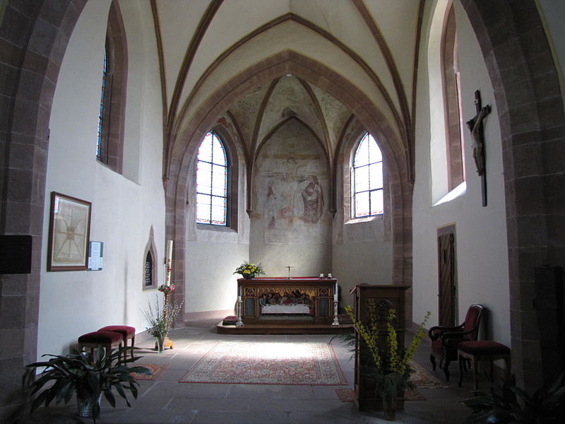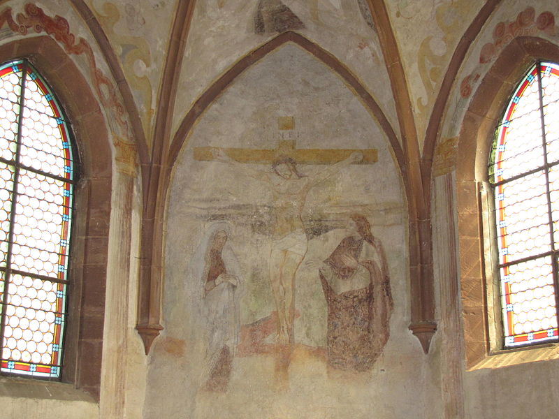 Les décors peints du chœur présentent, sur la voûte, une représentation du tétramorphe autrefois recouverte par un badigeon, ainsi que, sur le demi‑pan nord de l’abside, la figure d’un saint abbé vêtu de vert, probablement saint Benoît ; le demi‑pan sud, très dégradé, pourrait avoir figuré saint Blaise ou sainte Scholastique. Les pans nord‑ouest et sud‑ouest montrent un décor architectural avec colonnes cannelées à chapiteaux d’inspiration corinthienne, et la face orientale porte une grande crucifixion surmontée, au centre du voûtain, d’une représentation de Dieu le Père tenant le corps du Christ, encadrée par des anges portant les arma christi. Ces voûtains constituent une variante du « Trône de grâce » apparentée à des formulations de la Pietà dans l’art flamand de la fin du XVIe siècle et présentent des rapprochements stylistiques avec un triptyque de la Hofkirche de Neumarkt.