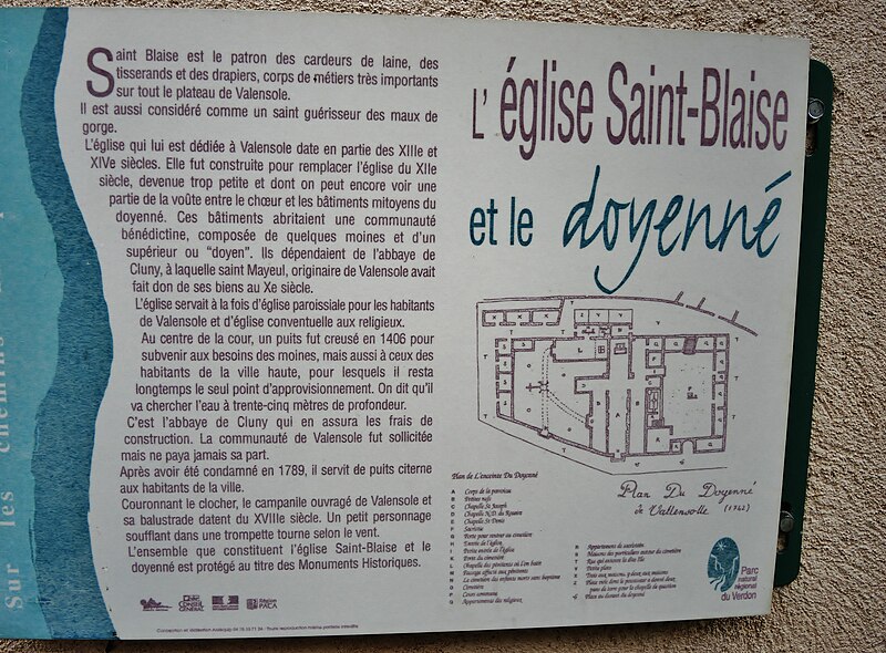 L'église paroissiale Saint-Blaise domine le village de Valensole et, avec les maisons regroupées sur son flanc sud autour d'une vaste cour, forme l'ensemble conventuel connu sous le nom de prieuré-doyenné de Saint-Mayeul. Ce prieuré bénédictin a été fondé par saint Maïeul, quatrième abbé de Cluny. De la construction clunisienne des XIe-XIIIe siècles subsiste principalement le chœur, surmonté d'un clocher carré élevé au-dessus du sanctuaire. Le chœur comporte deux travées voûtées d'ogives ; des colonnes et colonnettes engagées, aux chapiteaux sculptés de feuilles d'acanthe et de figures fantastiques, soutiennent les arcs et les croisillons de la voûte. La nef principale a été reconstruite en 1789-1790 puis profondément remaniée au XIXe siècle ; elle dessine une croix latine entre une façade occidentale romane et le vaste chœur. Les bas-côtés datent du XIVe siècle et les chapelles des croisillons ont été ajoutées à la fin du XVIe siècle et au milieu du XVIIe siècle (une date 1662 figure sur la porte d'entrée sud). Un jubé en bois sculpté a été déplacé à la Révolution ; sa clôture sert aujourd'hui de clôture des fonts baptismaux, haute d'environ 2,4 m et datée des environs de 1600, classée monument historique au titre d'objet. Le mobilier comprend également 48 stalles du XVIe siècle. Le prieuré avait autrefois un cloître aujourd'hui disparu, dont on repère encore les vestiges incorporés aux maisons voisines. L'ensemble du bâtiment et la cour attenante sont inscrits depuis le 24 janvier 1994. L'église se situe dans la commune de Valensole, dans les Alpes-de-Haute-Provence, en région Provence-Alpes-Côte d'Azur.