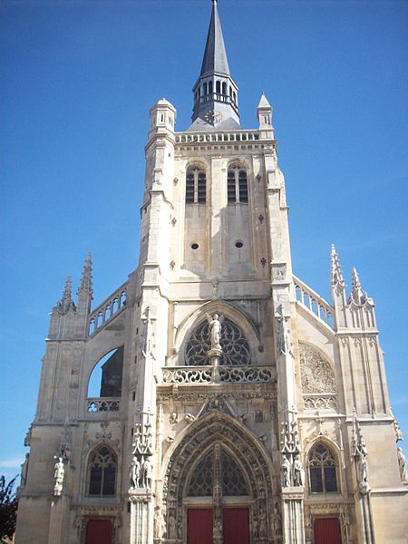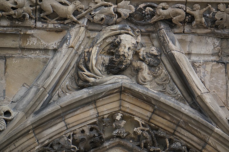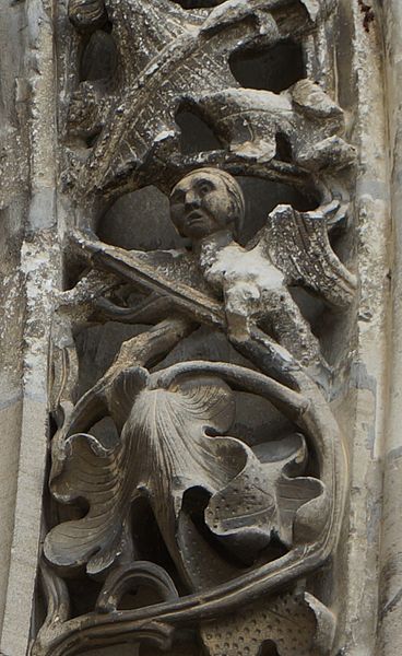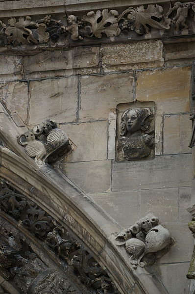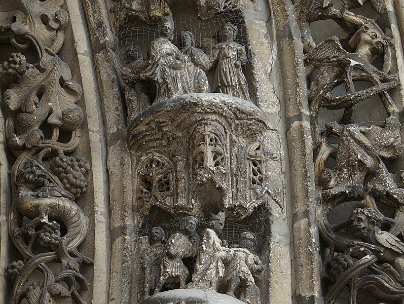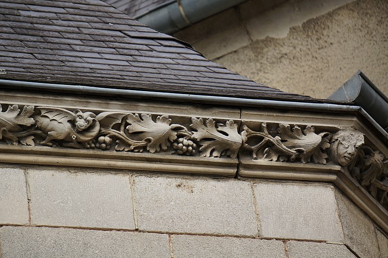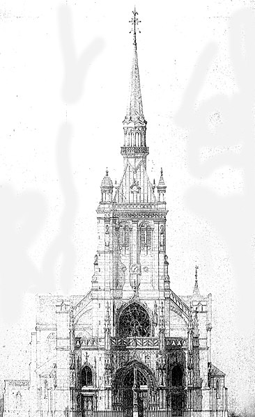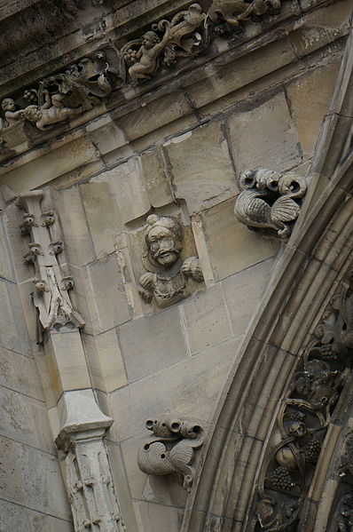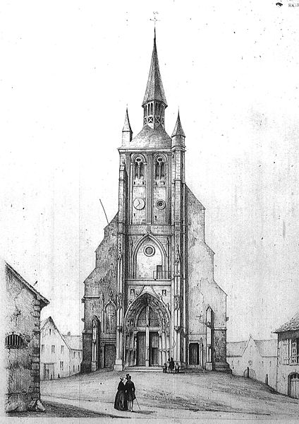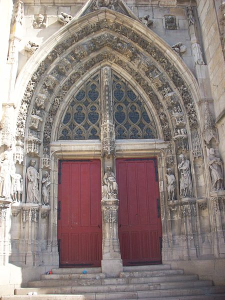 La façade occidentale est richement sculptée et ornée de nombreuses statues. La porte principale est surmontée d'une archivolte à triple nervure, dont la nervure centrale relate la vie de Brice de Tours et les deux autres présentent des scènes dans les vignes avec des animaux fabuleux. Le tympan montre une figure masculine à gauche, une figure féminine à droite et, entre les deux, une représentation de Dieu ; une balustrade protège la rosace, incluse dans un arc brisé. Parmi les sculptures figurent des scènes de la vie de Brice, une vouivre et un vigneron à l'angle supérieur droit de la porte de droite, un ange devant la rosace et la Vierge devant le pilier central, ainsi qu'une figure au centre du tympan. Les deux portes latérales reprennent le même modèle : une porte rectangulaire surmontée d'un vitrail dans un arc brisé, encadrée par une frise mêlant motifs de vigne ou de chêne, vignerons et animaux fabuleux ; une frise court presque tout autour du bâtiment sous le toit.