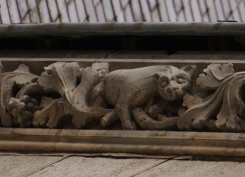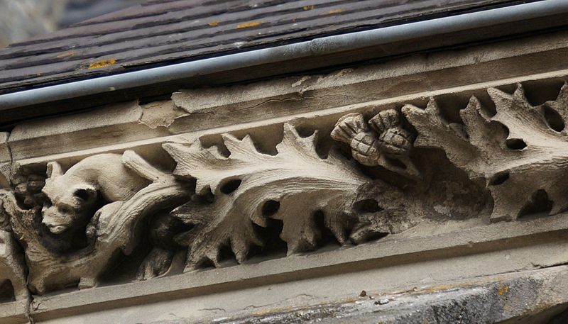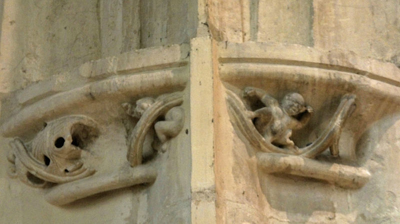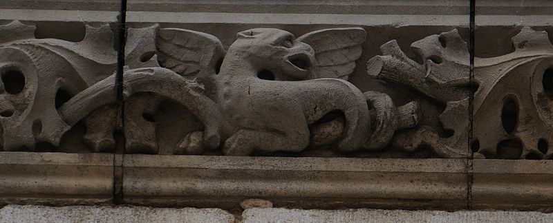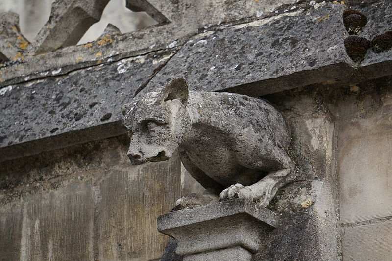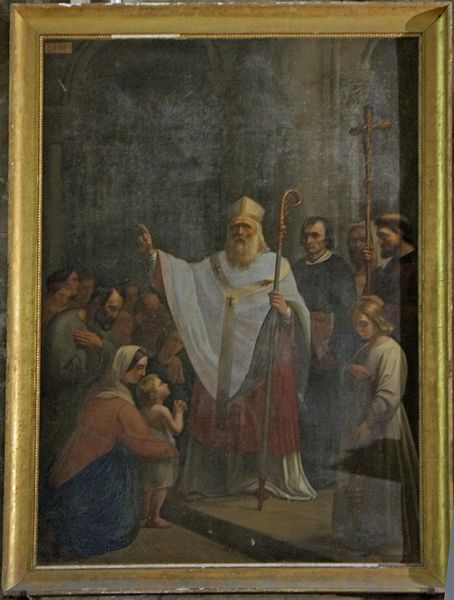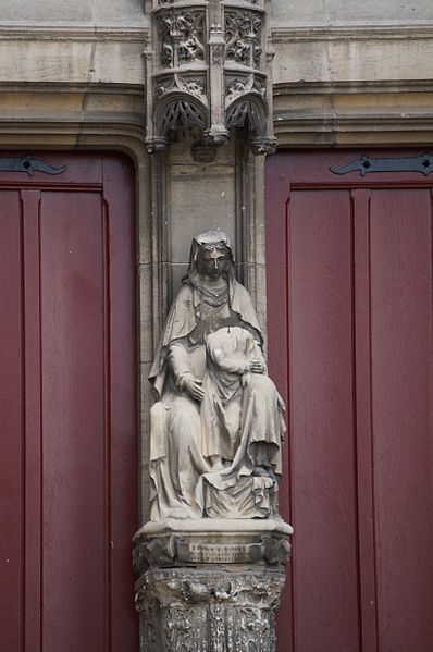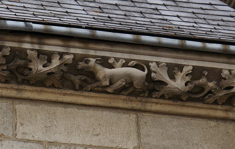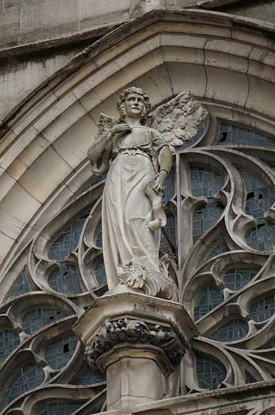 La façade occidentale est richement sculptée et ornée de nombreuses statues. La porte principale est surmontée d'une archivolte à triple nervure, dont la nervure centrale relate la vie de Brice de Tours et les deux autres présentent des scènes dans les vignes avec des animaux fabuleux. Le tympan montre une figure masculine à gauche, une figure féminine à droite et, entre les deux, une représentation de Dieu ; une balustrade protège la rosace, incluse dans un arc brisé. Parmi les sculptures figurent des scènes de la vie de Brice, une vouivre et un vigneron à l'angle supérieur droit de la porte de droite, un ange devant la rosace et la Vierge devant le pilier central, ainsi qu'une figure au centre du tympan. Les deux portes latérales reprennent le même modèle : une porte rectangulaire surmontée d'un vitrail dans un arc brisé, encadrée par une frise mêlant motifs de vigne ou de chêne, vignerons et animaux fabuleux ; une frise court presque tout autour du bâtiment sous le toit.