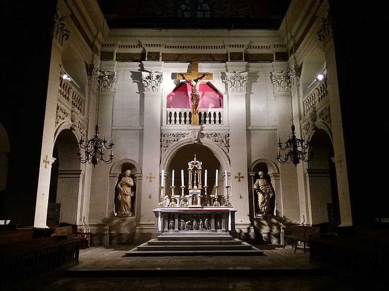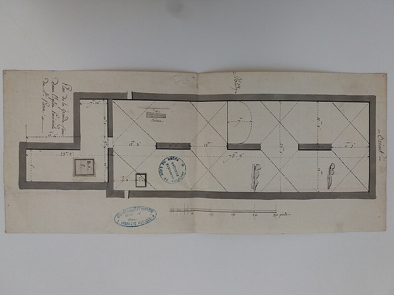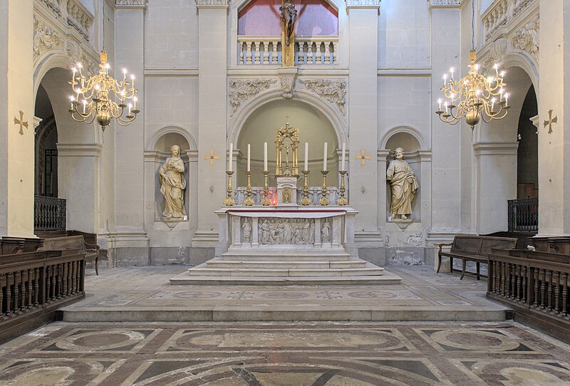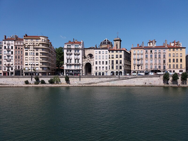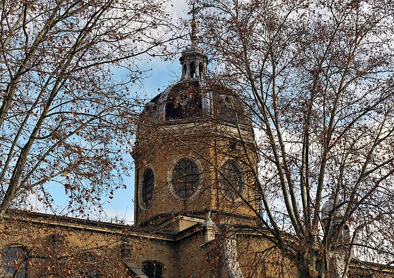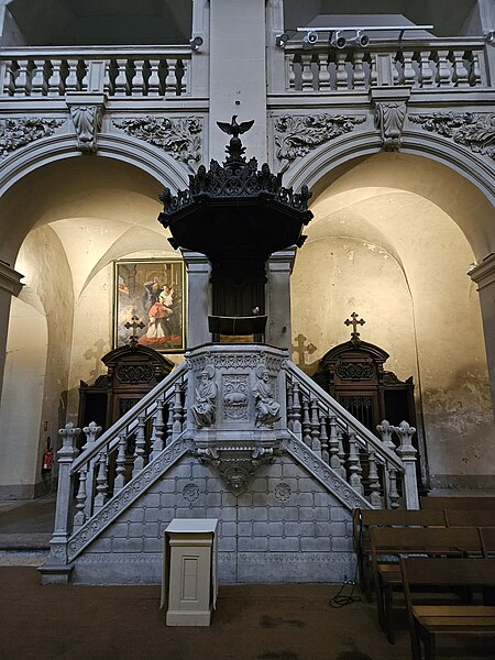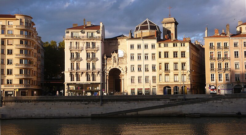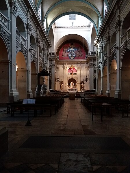 L'édifice présente un parti basilical malgré des transepts peu débordants, avec une nef centrale rythmée par huit colonnes de style toscan et deux bas‑côtés. La croisée du transept est surmontée d'une coupole sur tambour qui s'ouvre sur un chœur en hémicycle, flanqué de deux chapelles de plan carré prolongeant les collatéraux. Le clocher et la sacristie, situés à l'arrière du chœur, occupent un emplacement traditionnel des XVIIe et XVIIIe siècles. L'éclairage est principalement haut : dix fenêtres plein‑cintre en vis‑à‑vis prennent naissance au‑dessus de l'entablement et pénètrent dans la voûte en berceau, une demi‑lune orne le mur occidental et quatre fenêtres abaissées éclairent la coupole, tandis que les collatéraux, le chœur et leurs chapelles restent aveugles. Le porche, désaxé pour respecter l'alignement du quai, présente une façade sculptée dont l'abondance décorative contraste avec la sobriété intérieure.