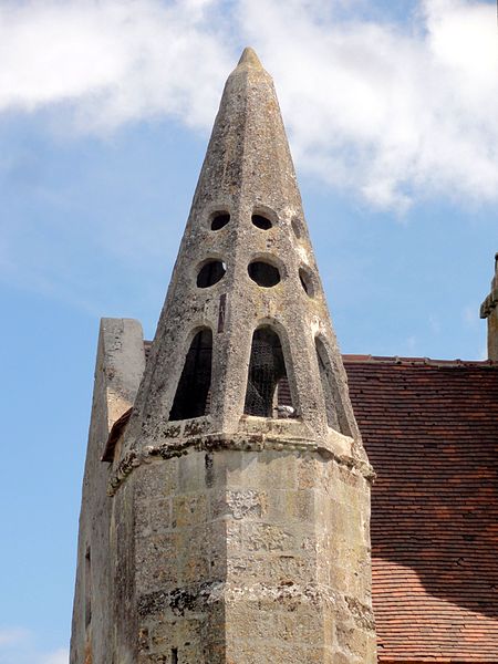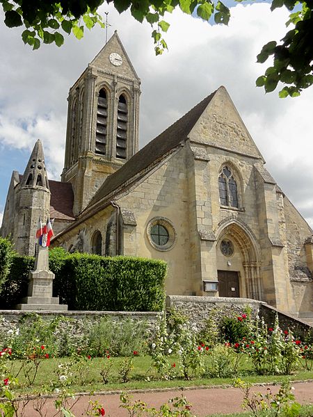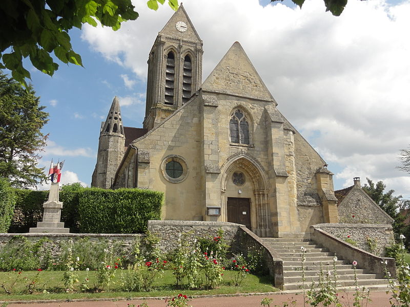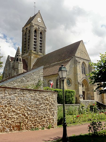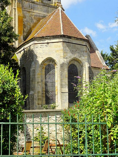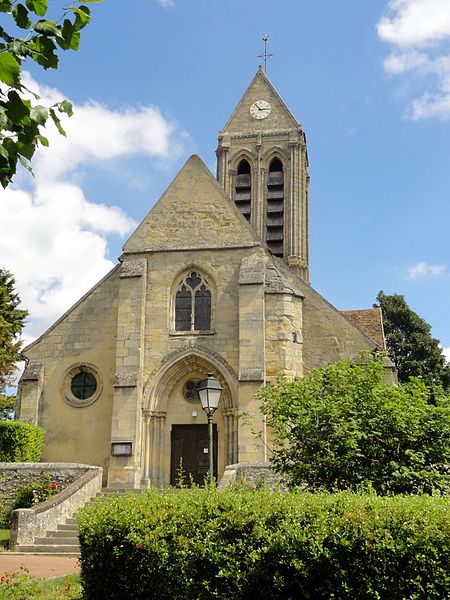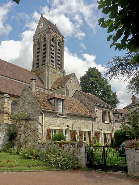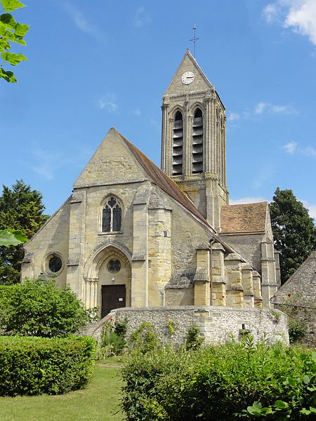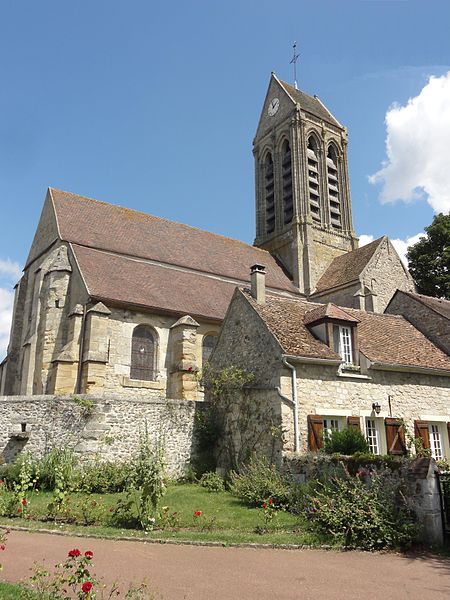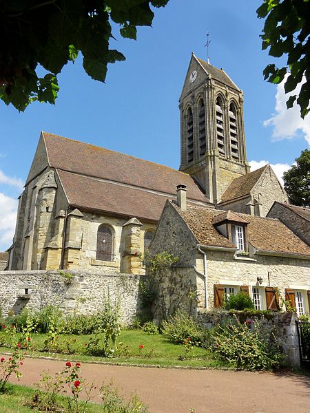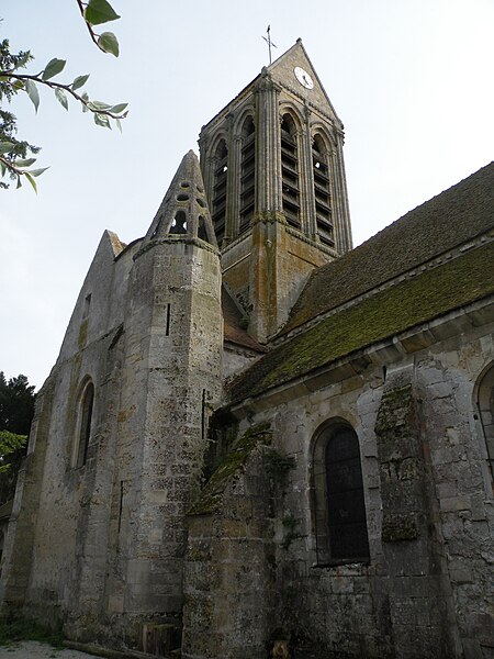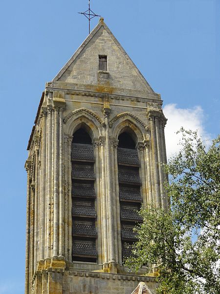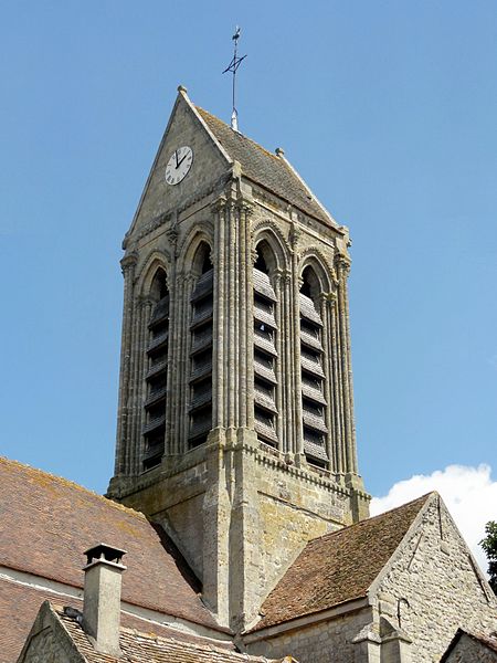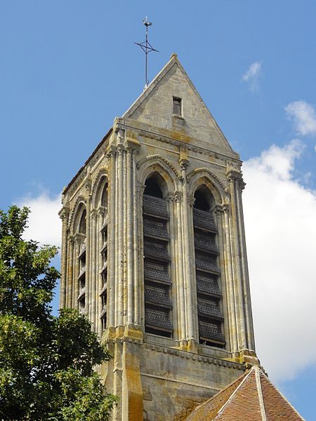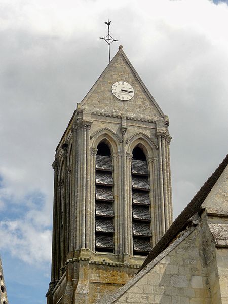 Le clocher est l'élément le plus remarquable : son étage élevé offre sur chaque face deux baies gémelées en arc brisé encadrées et divisées par de fines colonnettes au nombre total de vingt-huit, des archivoltes à double colonnettes, un cordon en dents de scie et une corniche de corbeaux; il est considéré comme l'apogée de l'art gothique dans le Vexin local. Ce clocher a cependant posé des problèmes de stabilité, d'où la pose d'un contrefort biais au sud-est et la construction d'un arc de décharge dans le mur occidental du croisillon sud.
