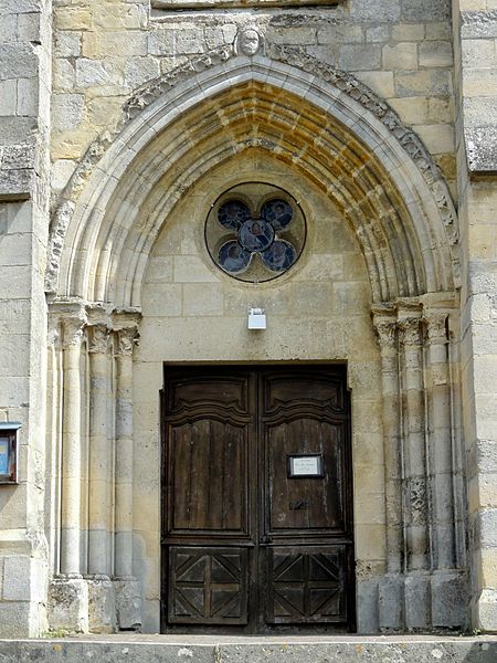 La façade occidentale, scandée par trois contreforts verticaux, s'ouvre par un portail en tiers-point à triple archivolte torique ornée d'une frise de feuillages et d'une tête sculptée sur la clé de voûte supérieure; le tympan ajouré en quatre-feuilles, le linteau et les piédroits sont modernes, les vantaux bois datent de la période classique. Au‑dessus du portail une fenêtre gothique flamboyant à deux lancettes éclaire la nef; la façade du bas-côté nord est percée d'un oculus à cordon en pointe-de-diamant, disposition d'origine retrouvée dans les fenêtres hautes attendues de la nef. La nef a perdu ses baies hautes lors du rehaussement des toits des bas-côtés, oculi et petites fenêtres aujourd'hui obturées restant visibles en intérieur et dans les combles; ce type de transformation est fréquent au XVIe siècle dans la région. Le bas-côté sud, rebâti au XVIe siècle avec des baies en plein cintre et des contreforts munis de chaperons, montre une restitution sobre sans décors renaissants marquants, tandis que le bas-côté nord conserve ses contreforts d'origine et une corniche de modillons cubiques.
