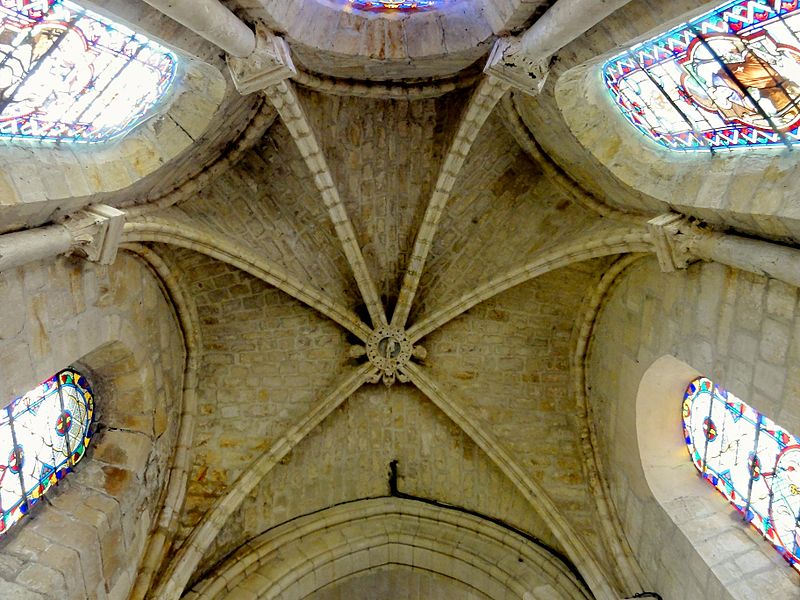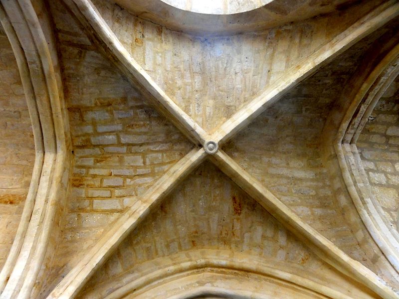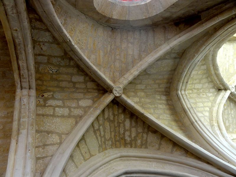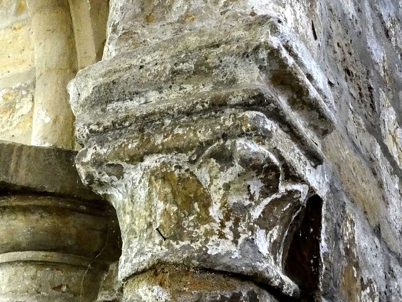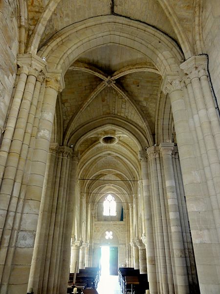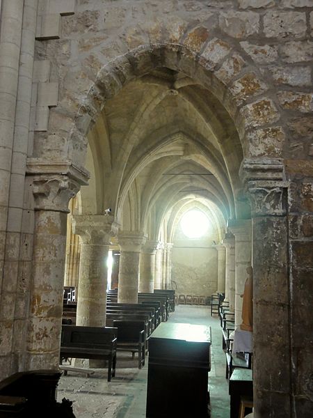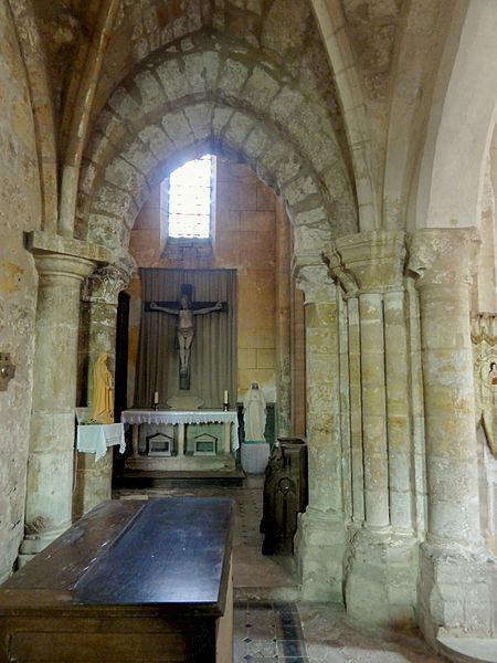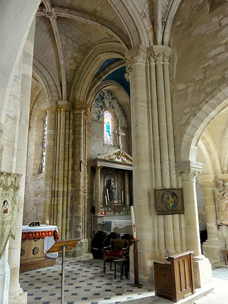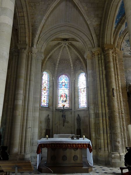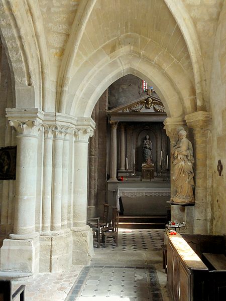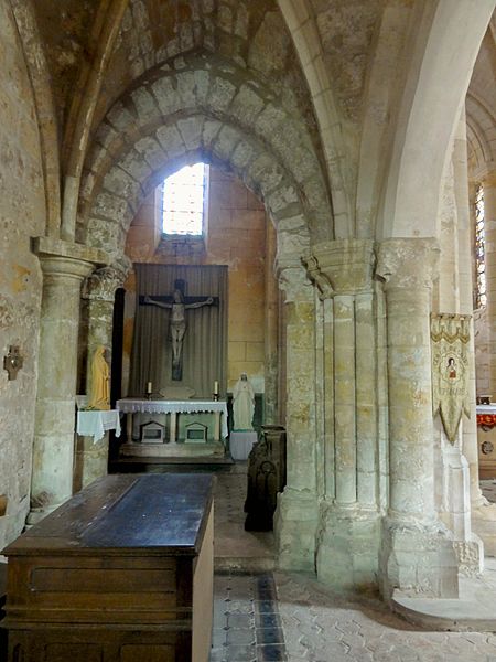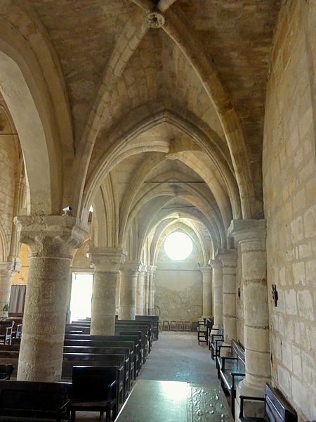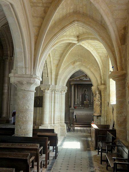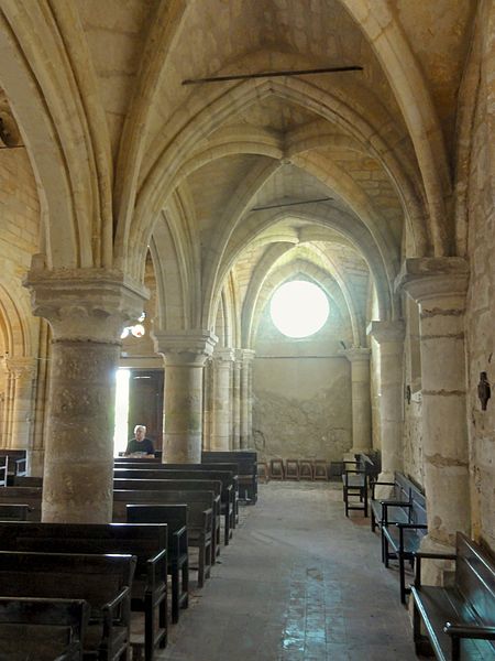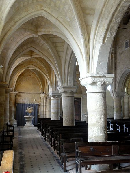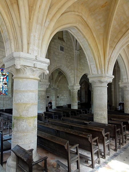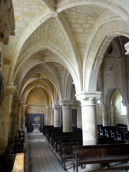 L'intérieur, sombre faute de fenêtres hautes, se caractérise par la régularité des proportions et la sobriété du gothique primitif ; les moellons et pierres de taille restent apparents, probablement précédemment enduits et peints. La nef présente de grandes arcades en tiers-point reposant sur de robustes piles et des groupes de trois colonnettes identiques qui reçoivent la retombée des ogives et doubleaux, profilés dans des arêtes arrondies basées sur le tore; certaines moulures ont été retouchées au ciment. Les bas-côtés, de même longueur que la nef, conservent les voûtes et les grandes arcades d'origine, mais leurs supports latéraux ont été refaits et les fenêtres nord repercées; les formerets ont été en grande partie remplacés lors des reprises en sous-œuvre. La croisée du transept s'ouvre par de hautes arcades en tiers-point dont la mouluration rejoint celle des grandes arcades; les piles comportent un noyau cruciforme entouré de demi-colonnes et de colonnettes qui reçoivent la plupart des nervures, et la clé de voûte ajourée est décorée de têtes humaines et animales avec traces de polychromie. Les croisillons reprennent le profil des ogives de la nef mais présentent aux extrémités une simplification des supports et des niches peu profondes, tandis que les murs nord et sud conservent des décors distincts dont un badigeon bleu étoilé, aujourd'hui très dégradé.
