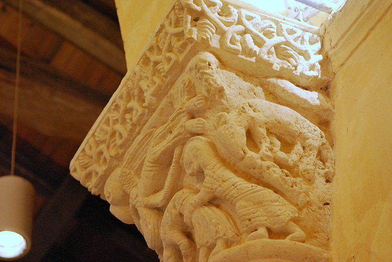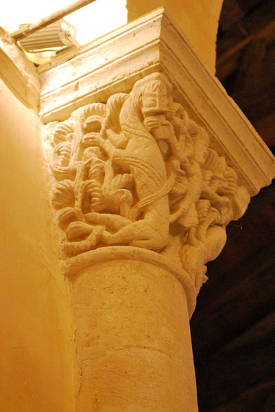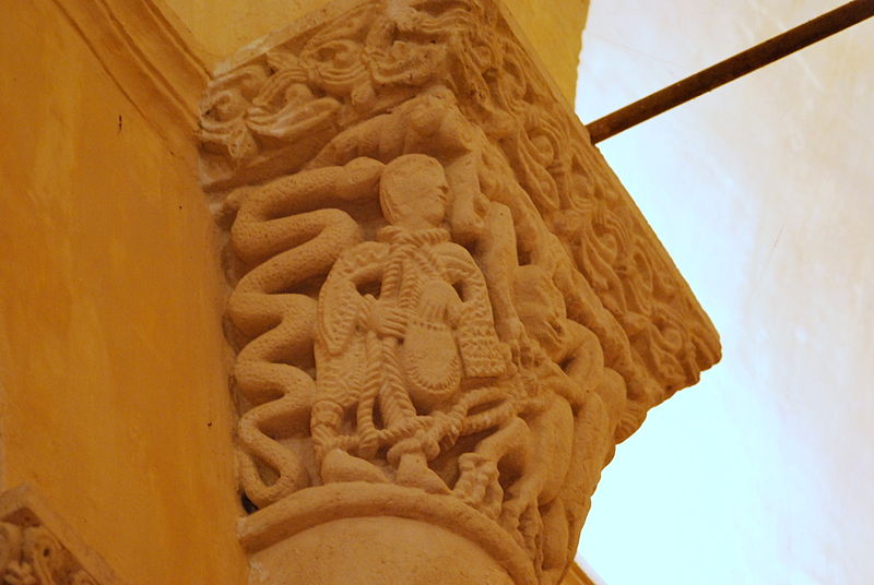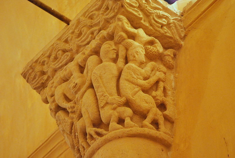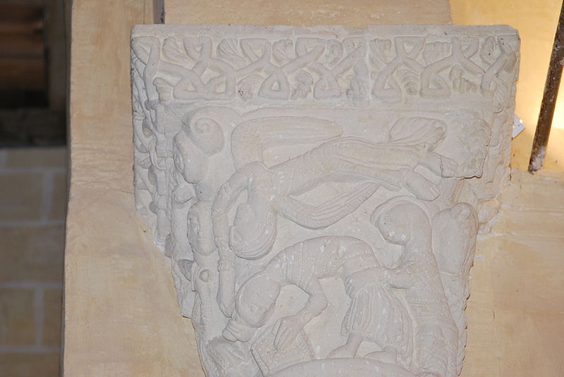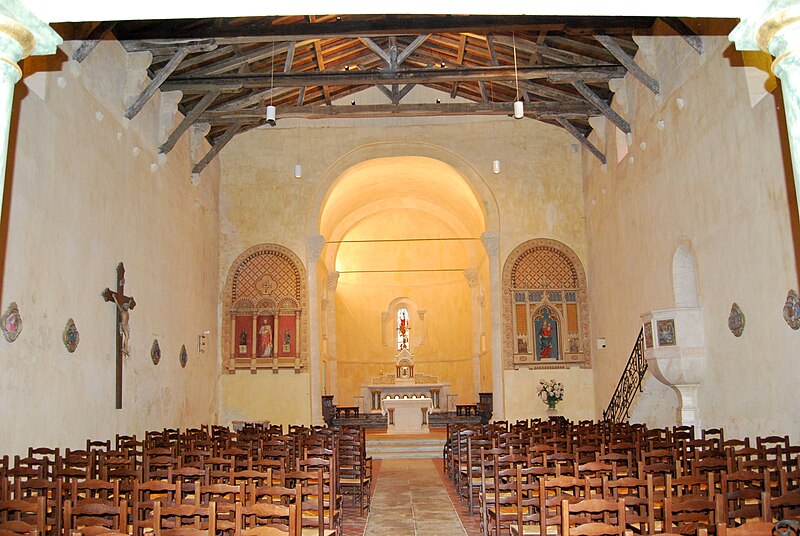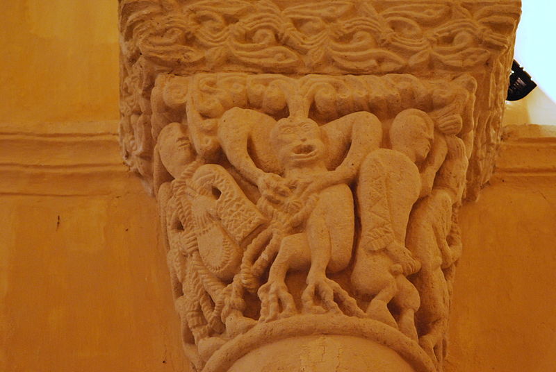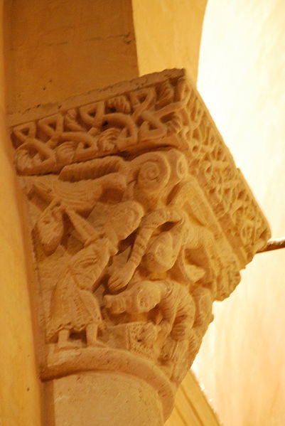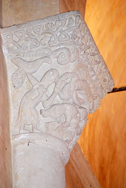 L'église se distingue par une iconographie romane remarquable : huit chapiteaux historiés dans le presbytérium et une série extérieure de 45 modillons sous la corniche du chevet. Les huit chapiteaux du presbytérium, destinés au clergé, comprennent quatre grands chapiteaux aux retombées des arcs doubleaux et quatre plus petits ornant les colonnettes des fenêtres; ils datent du milieu du XIIe siècle et développent un thème religieux axé sur l'obéissance, la pauvreté et la chasteté. L'arc triomphal nord représente le sacrifice d'Isaac : Abraham, tenant Isaac au-dessus d'un autel, lève son glaive tandis qu'un ange intervient pour retenir son bras. Une créature non humaine, identifiée comme l'émissaire de Satan Sammaël, apparaît derrière Isaac et un bélier est dissimulé dans un roncier, rappelant le Midrach selon lequel Sammaël aurait caché le substitut sacrificiel. L'arc triomphal sud met en scène l'indiscipline et la désobéissance par la figure d'un petit homme en équilibre entre deux lions dont il saisit les langues, entouré d'une végétation luxuriante symbolisant la tentation. Le chapiteau nord de l'arc du chœur illustre l'avarice : le Diable, assis en majesté, tient une corde attachée aux passions et enchaîne un riche cupide, tandis qu'un serpent chuchote à son oreille et qu'un assassinat est représenté à proximité, renvoyant à la Psychomachie. Le chapiteau sud de l'arc du chœur montre deux reptiles qui, formant un X, avalent par les pieds une femme et un homme nus, allusion probable au péché de fornication ou d'adultère.