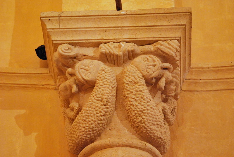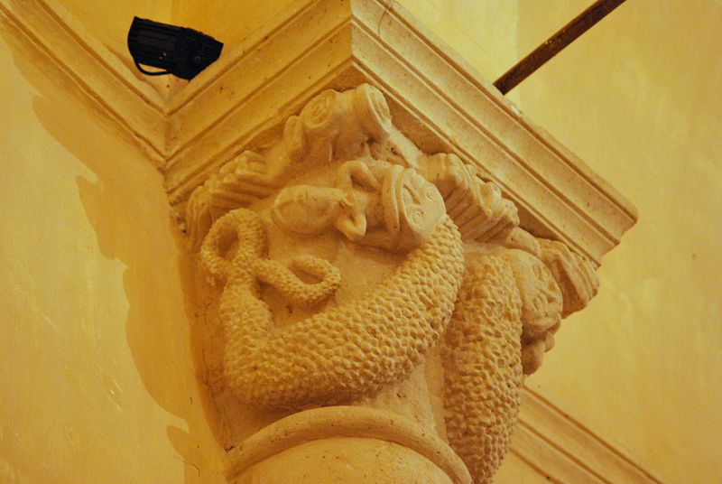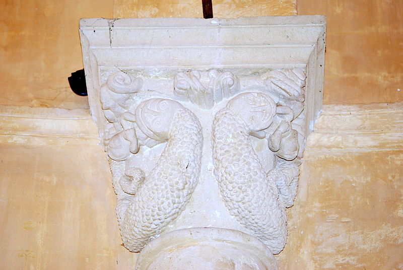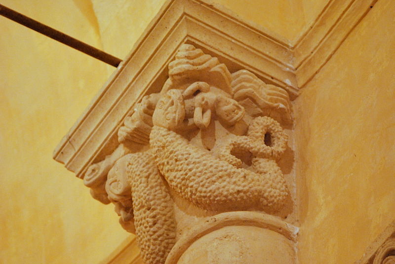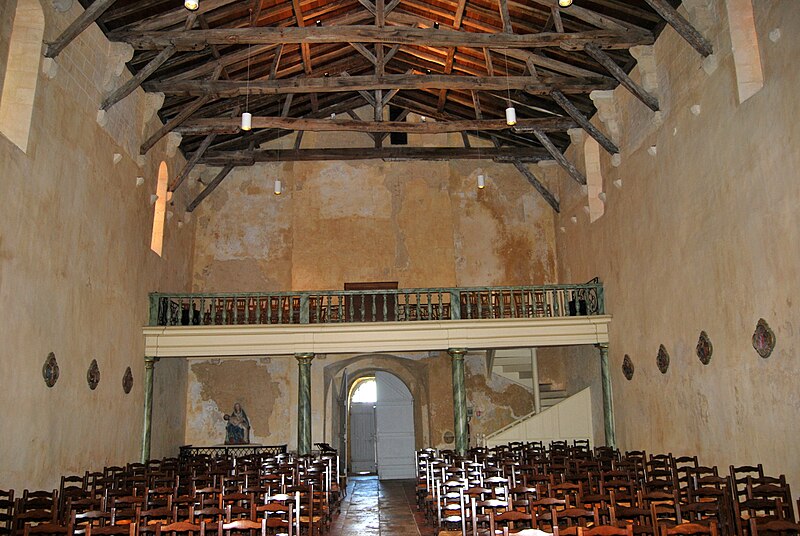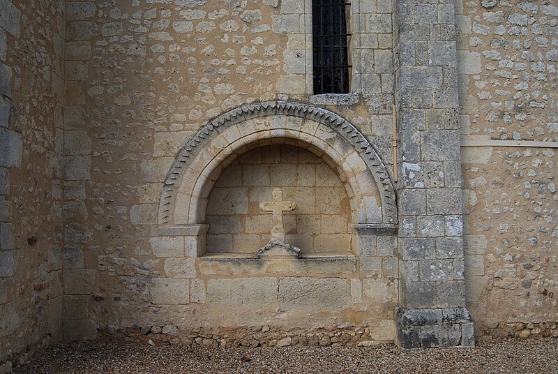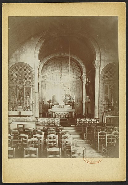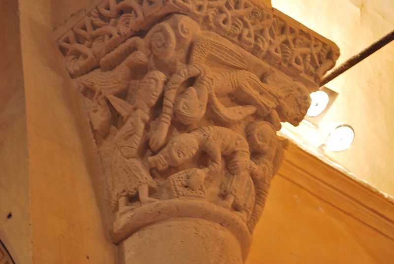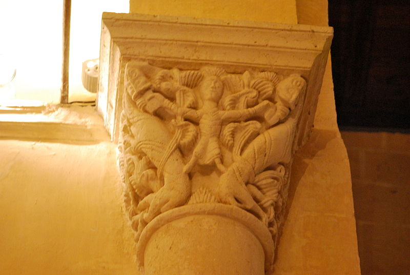 L'église se distingue par une iconographie romane remarquable : huit chapiteaux historiés dans le presbytérium et une série extérieure de 45 modillons sous la corniche du chevet. Les huit chapiteaux du presbytérium, destinés au clergé, comprennent quatre grands chapiteaux aux retombées des arcs doubleaux et quatre plus petits ornant les colonnettes des fenêtres; ils datent du milieu du XIIe siècle et développent un thème religieux axé sur l'obéissance, la pauvreté et la chasteté. L'arc triomphal nord représente le sacrifice d'Isaac : Abraham, tenant Isaac au-dessus d'un autel, lève son glaive tandis qu'un ange intervient pour retenir son bras. Une créature non humaine, identifiée comme l'émissaire de Satan Sammaël, apparaît derrière Isaac et un bélier est dissimulé dans un roncier, rappelant le Midrach selon lequel Sammaël aurait caché le substitut sacrificiel. L'arc triomphal sud met en scène l'indiscipline et la désobéissance par la figure d'un petit homme en équilibre entre deux lions dont il saisit les langues, entouré d'une végétation luxuriante symbolisant la tentation. Le chapiteau nord de l'arc du chœur illustre l'avarice : le Diable, assis en majesté, tient une corde attachée aux passions et enchaîne un riche cupide, tandis qu'un serpent chuchote à son oreille et qu'un assassinat est représenté à proximité, renvoyant à la Psychomachie. Le chapiteau sud de l'arc du chœur montre deux reptiles qui, formant un X, avalent par les pieds une femme et un homme nus, allusion probable au péché de fornication ou d'adultère.