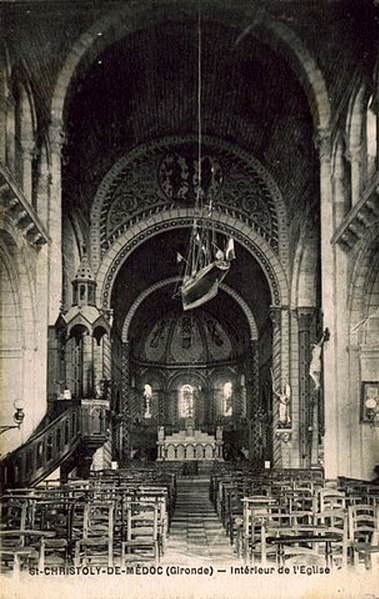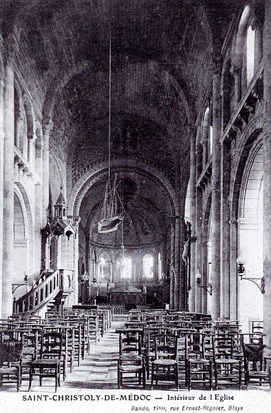 L'église Saint-Christoly se trouve à Saint-Christoly-Médoc, dans le département de la Gironde. Le chœur est daté du XIIe siècle. La nef et la façade occidentale ont été réalisées au début du quatrième quart du XIXe siècle par E. Bonnore. Une inscription porte la mention : "EDOUARD BONNORE, ARCHITECTE 1875 E. LARDILLEY MAIRE". Les deux absidioles ont été inscrites au titre des monuments historiques le 21 décembre 1925. Des ressources en ligne complètent la documentation : Mérimée, Clochers de France et l'Observatoire du patrimoine religieux, ainsi que des portails thématiques (catholicisme, architecture chrétienne, Gironde, monuments historiques).