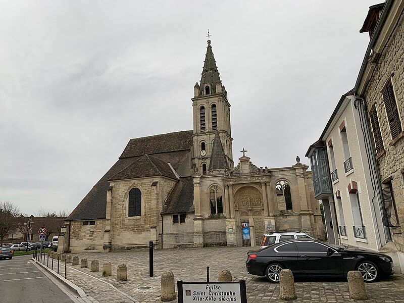L'église Saint-Christophe, située dans le quartier du village de Cergy (Val-d'Oise), se signale par un portail Renaissance tourné vers le village et par un clocher roman à deux étages, l'un des plus anciens du département. Le portail monumental, commencé par Nicolas Le Mercier, ouvre sur un vestibule à ciel ouvert qui laisse voir des vestiges de la nef inachevée et donne à l'édifice l'allure partiellement ruinée que suggèrent ses arrachements de maçonnerie. La nef romane, jugée vétuste, a été démolie en 1904 pour permettre la consolidation du clocher l'année suivante ; la façade occidentale actuelle et les murs fermant le bas-côté sud datent de ces travaux. L'intérieur présente un plan presque carré de trois travées sur trois, homogène à l'exception de la base du clocher qui conserve des caractères romans. L'édifice abrite l'une des plus anciennes voûtes d'ogives conservées dans la région, six chapiteaux historiés datés des années 1130–1140 et une arcade orientale attribuée à la seconde moitié du XIe siècle. Des fouilles menées en 2002–2003 ont mis au jour l'état antérieur du site : une petite chapelle cimetièriale à chevet plat puis une chapelle carolingienne agrandie par une abside en hémicycle, ainsi que les différentes campagnes de construction qui ont abouti à la seconde église romane. La majeure partie de l'édifice est de style gothique, résultat d'une transformation importante au début du XIIIe siècle qui a donné au chœur et à ses collatéraux un ensemble voûté et homogène. Malgré des hauteurs sous voûtes modestes, l'absence de remplage et une sculpture parfois maladroite, l'intérieur séduit par son grand volume voûté, comparable aux chœurs-halle de la vallée de l'Oise. Classée au titre des monuments historiques depuis 1913, l'église conserve de nombreux éléments de mobilier protégés, dont des plaques funéraires et des plaques de fondation. Bien qu'elle ne soit plus au centre de la vie paroissiale depuis l'ouverture de nouvelles églises dans la ville nouvelle, au moins deux messes y sont toujours célébrées chaque semaine.