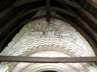 Le portail datant de la première moitié du xiie siècle est protégé par un auvent en charpente du XVIe siècle, au gâble aigu. Le porche en arc en plein cintre est encadré de voussures au décoré de lignes brisées. Il est surmonté d'un tympan sculpté représentant le Christ en majesté au milieu du Tétramorphe (représentation symbolique des quatre Évangélistes).