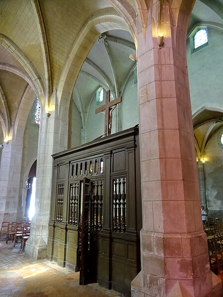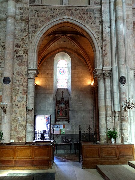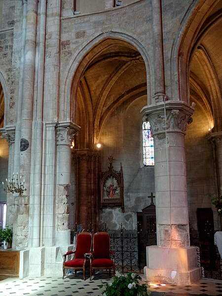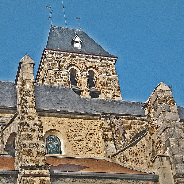 Le clocher, placé sur le côté sud, comprend deux étages séparés par une frise en dents-de-scie ; un escalier de quarante et une marches est logé dans une tourelle rectangulaire attenante, le tout couvert d’ardoise. Il abrite la cloche Antoinette, fondue en bronze en 1643 et sonnant en ré, classée monument historique depuis le 27 avril 1944, ainsi que la cloche Clotilde, fondue en acier en 1870 et sonnant en fa. Le maître-autel, de forme sarcophage et taillé dans du marbre rouge, porte un médaillon en marbre blanc représentant la Vierge de profil ; il fut offert par Napoléon Ier et l’impératrice Joséphine en 1806 et est classé depuis 1983. Les fonts baptismaux, en marbre rouge datés de 1697 et couverts de cuivre, sont classés parmi les objets depuis 1983. La chaire en bois, datée de 1742, est classée depuis le 3 décembre 1984, et la statue en chêne de la Vierge à l’Enfant, du XVIIe siècle, est classée depuis le 10 juillet 1912.