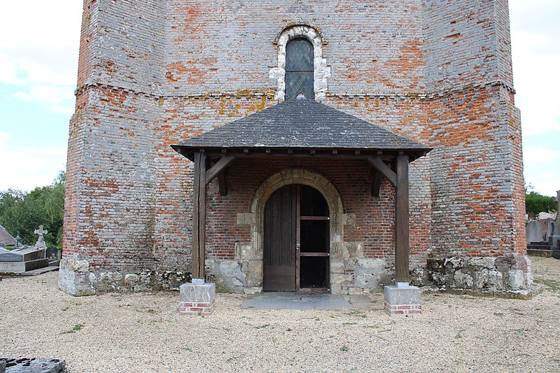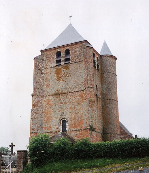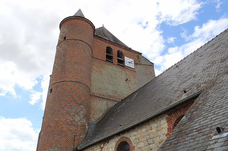 La partie fortifiée occupe le flanc occidental : un massif de briques forme un clocher carré, éclairé par deux ouvertures cintrées sur chaque face, flanqué à l'un de ses angles d'une tourelle ronde contenant un escalier et soutenu par des contreforts. Le porche intérieur, voûté en plein cintre, porte la date de 1619 sur sa clé et le portail occidental en pierre moulurée est surmonté d'armoiries gravées associées à René du Bec et Isabeau de Coucy. Le donjon, entièrement en briques à l'exception des encadrements du portail et des fenêtres, peut être daté des années 1619-1620 et est présenté comme le prototype des donjons de Prisces, Rogny et Burelles.