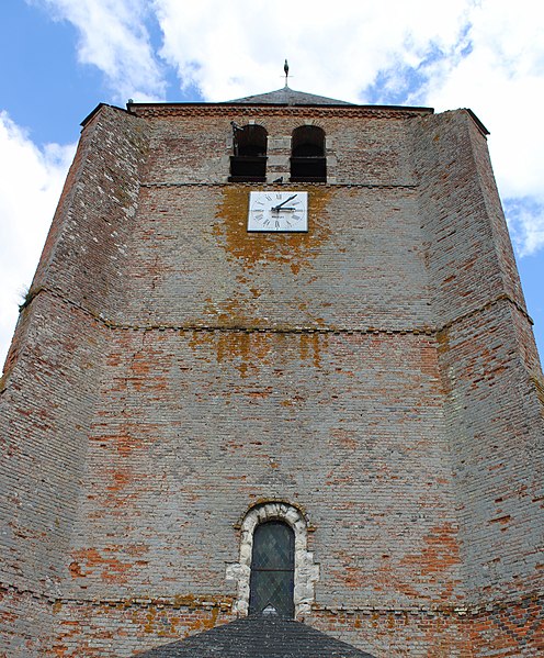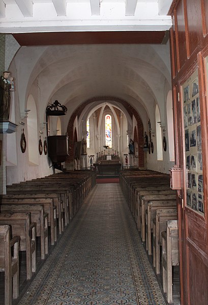 La nef, non voûtée et masquée par un lambris, a été profondément remaniée, vraisemblablement au XVIIe siècle : un bas-côté nord a été supprimé et les baies du mur méridional reprises. Les murs de la nef sont en moellons avec, au sud, des chaînes de tuiles et, au nord, trois grandes arcades ogivales en briques reposant sur des piliers carrés, vestiges probables d'un bas-côté primitif ou projeté. Le transept présente une voûte en plein cintre avec arceaux diagonaux et des chapelles latérales à voûte écrasée doublée de nervures diagonales.