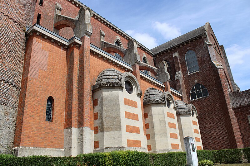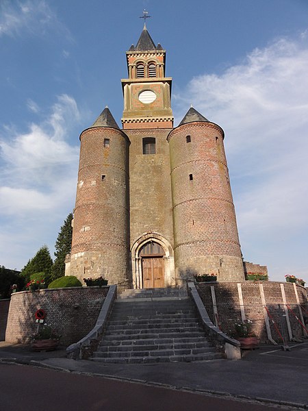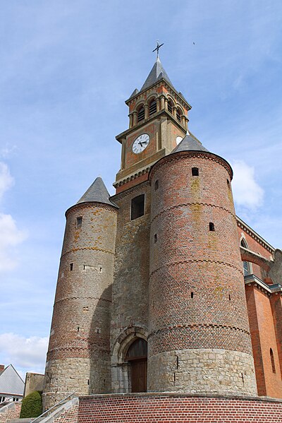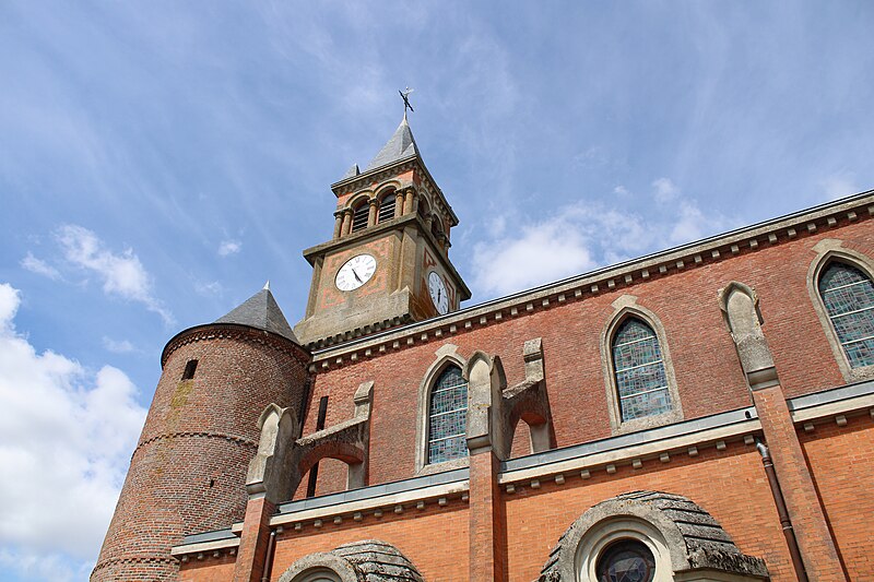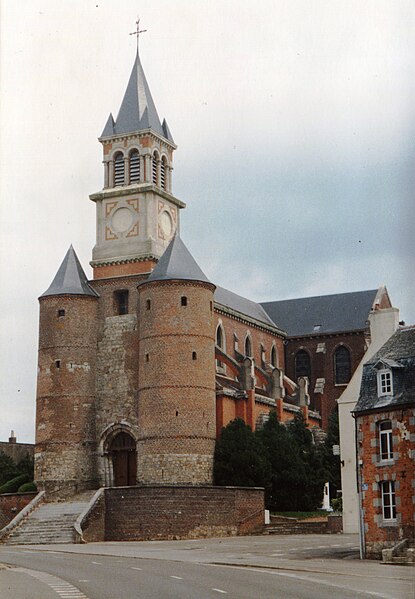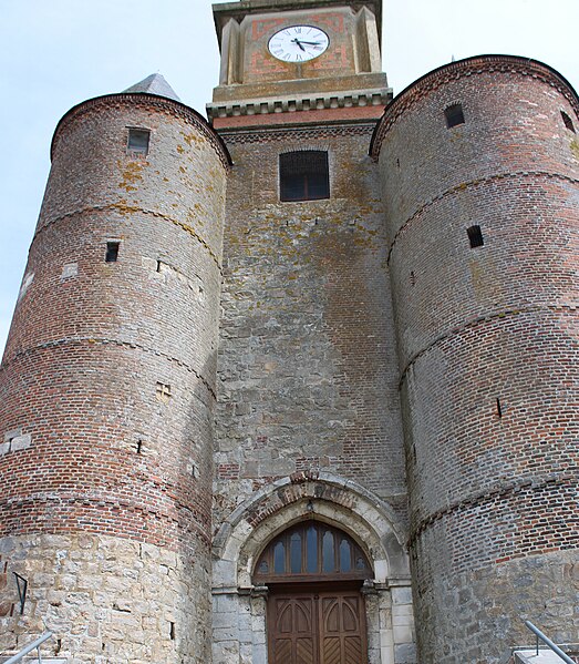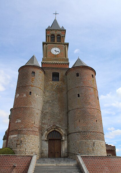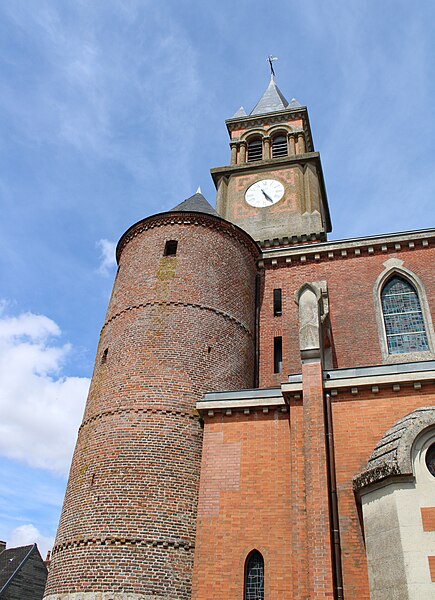 L'église Saint-Cyr-et-Sainte-Julitte, située à Origny-en-Thiérache dans l'Aisne, est une église fortifiée dédiée aux martyrs chrétiens saint Cyr et sa mère sainte Julitte. La façade présente un donjon rectangulaire en pierre, restauré en briques, flanqué de deux tours en briques dont le soubassement en grès a environ cinq mètres de diamètre au ras du sol et est surmonté d'un toit à quatre pans. Le plan de l'édifice forme une croix: la nef, en pierre blanche, est bordée de bas-côtés en moellons et briques ; le bas-côté gauche s'arrête derrière le donjon où subsiste un petit mâchicoulis au-dessus d'une porte aujourd'hui obturée. Une arcade ogivale murée occupe l'angle du donjon et une brique porte la date de 1606 ; dans le parement ont été enchâssées deux croix de consécration d'origine romane. L'entrée principale, entre les tours, s'ouvre par deux archivoltes concentriques à profil carré formant une ogive et retombant sur trois pieds-droits ; un cordon saillant borde l'archivolte supérieure. Les fenêtres hautes de la nef sont en plein cintre tandis que les baies des bas-côtés et certaines parties en briques datent des remaniements du XVIIe siècle ; le pignon du bras opposé du transept conserve deux baies ogivales juxtaposées surmontées d'un petit oculus à quatre lobes. Le chevet carré présente, sous un oculus, trois fenêtres ogivales et au pignon deux longues baies en plein cintre éclairant les combles ; ce mélange de plein cintre et d'ogives traduit la période de transition entre roman et gothique. Les contreforts, à section carrée, montrent des profils variés qui se rapprochent de types illustrés autour de 1220 ou du milieu du XIIIe siècle. Le porche voûté en pierre repose sur des arcs en tore qui se croisent ; un cul-de-lampe triangulaire, attribué au début du XIIIe siècle, subsiste et la clef de voûte porte un écu couronné aux armes accolées. À l'intérieur, des trous ménagés dans les pieds-droits servaient à recevoir une barre de chêne pour verrouiller les vantaux lorsque le clocher était utilisé comme refuge. Un escalier ajouté au moment de l'élévation des tours donne accès à l'étage qui communique avec celles-ci ; on y remarque des cheminées et la cage des cloches, les cloches ayant été fondues en 1811. Une meurtrière à large ébrasement s'ouvre sur la paroi septentrionale du donjon, rappelant des dispositifs adoptés entre 1250 et 1350 selon Viollet-le-Duc. Trois arcades ogivales séparent les bas-côtés de la nef ; la nef et les bas-côtés ne sont pas voûtés, tandis que la croisée et le chœur possèdent des voûtes d'arête ogivales en pierre reposant sur des nervures dont les colonnettes disparues sont signalées par deux chapiteaux à crochets. Les bras du transept sont voûtés en bois en berceau ogival dont le lambris apparent, les couvre-joints moulurés et le faîtage orné de fleurons restituent la structure de la charpente. L'emploi de la brique dans la région remonte aux premières années du XVIIe siècle ; la date gravée de 1606 permet d'attribuer à cette époque les tours, les bas-côtés, le pignon méridional du transept et certaines restaurations du donjon, tandis que les parties principales de l'église semblent avoir été élevées entre 1150 et 1200. Le chœur est entièrement revêtu de boiseries de style Louis XV, moulurées et sculptées d'angelots, d'écussons en coquille, de palmettes, de guirlandes et d'attributs monastiques ; deux têtes en médaillon, un moine et une religieuse en extase, sont interprétées respectivement comme saint Bernard et sainte Thérèse, compte tenu de l'origine cistercienne des boiseries provenant de l'abbaye de Foigny. Deux panneaux en relief représentent saint Matthieu et saint Marc ; l'ensemble est peint en gris rehaussé de dorures, le coloriage des motifs figurés étant d'exécution moderne. Une trabe décorée, de facture plus récente, porte un crucifix au-dessus du chœur et un autel du bras droit du transept supporte une statue de la Vierge à l'Enfant en bois peint, probablement du XVIIe siècle. Les fonts baptismaux, monolithes du XVIe siècle, sont composés d'un pied octogonal et d'une cuve décorée ; Pigneau de Behaine, natif d'Origny, y a été baptisé. Contre la porte du collatéral gauche un bénitier en marbre noir porte l'inscription indiquant que Pierre Bocquet l'a donné en 1617. Diverses pierres tombales et dalles funéraires se conservent : devant le chœur la pierre de Me Jean Foday, curé de Wimy, décédé le 24 novembre 1734, une dalle murée rappelant Jean de Bosenoë, seigneur d'Origny, et son épouse Isabelle, et, à l'extérieur contre le bras droit du transept, la stèle de demoiselle Marie-Joseph Pigneau (1747-1823) mentionnant également ses parents et plusieurs membres de sa famille. La nef a été refaite après la Première Guerre mondiale et le clocher actuel, reconstruit de 1929 à 1931 à l'instigation du conseil diocésain de Saïgon, reprend la silhouette de la cathédrale Notre-Dame de Saïgon et présente un décor en brique polychrome inspiré des temples vietnamiens, témoignant des liens entre la commune et la ville où a exercé Pierre Pigneau de Behaine. L'église est inscrite au titre des monuments historiques par l'arrêté du 24 octobre 1927. En 1937, le curé de la paroisse était l'abbé Divry.