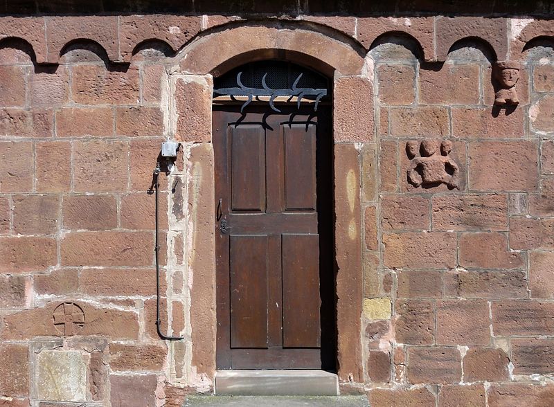 Édification du clocher en grès avec des éléments caractéristiques de l'architecture romane.