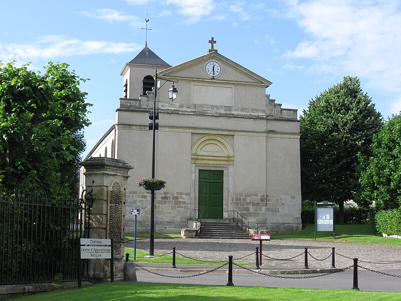 Les origines paroissiales remontent à un rapport ancien avec l'abbaye de Saint-Denis, attesté par un diplôme du roi Eudes, et le patronage de saint Denys explique le nom du village anciennement évoqué comme Ermenouville. La première église semble exister au moins depuis le XIe siècle; au XIIe siècle l'autel est donné au prieuré Saint-Martin-des-Champs et cette situation est confirmée par plusieurs bulles papales et par des actes locaux. Les plans anciens montrent que l'édifice médiéval était situé en amont dans la vallée du Petit Rosne et régulièrement orienté ; il avait été qualifié au XVIIIe siècle d'édifice « fort commun » et parfois réparé. Sous l'impulsion du comte de Machault, une reconstruction est entreprise, retardée par sa disgrâce en 1757 et menée finalement par Jean-Baptiste Chaussard après la mort des architectes initiaux; l'église nouvelle est achevée en 1782.
