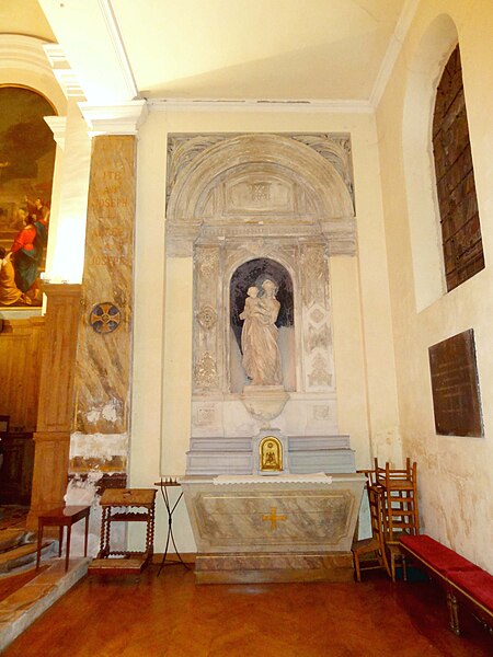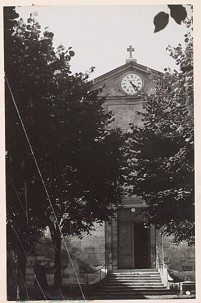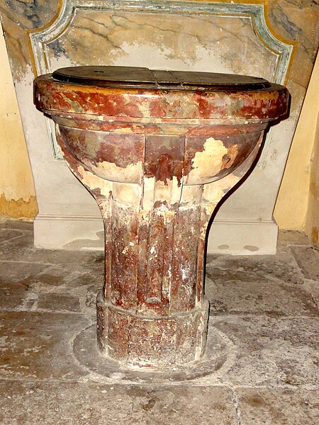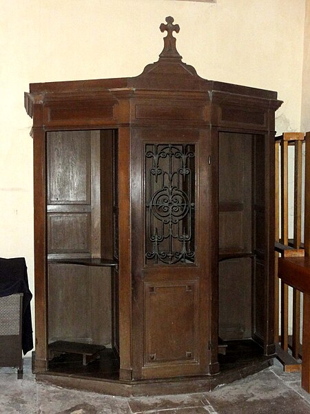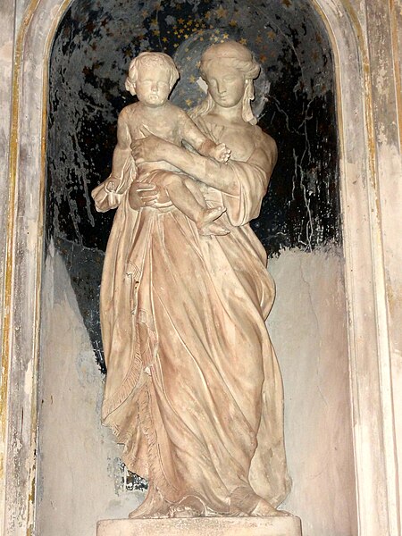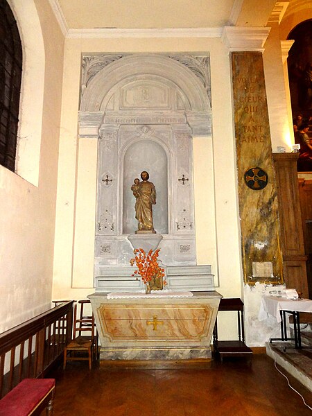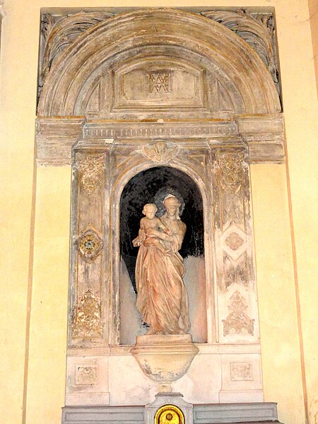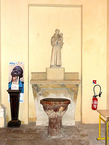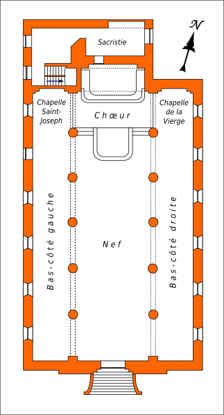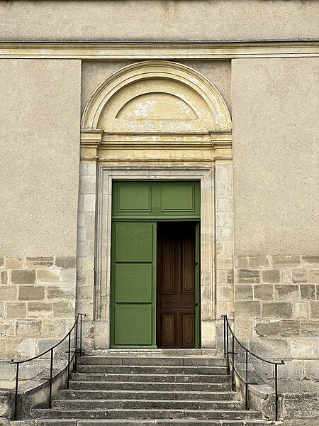 Construite essentiellement en brique enduite, la façade est la seule élévation richement traitée tandis que le reste de l'édifice présente un « discours architectural pauvre », selon Dominique Foussard. La façade s'organise en deux registres : un corps principal avec portail encadré de pilastres et fronton en arc de cercle, et une attique centrale flanquée de deux demi-pignons sur les bas-côtés, le tout couronné d'un fronton triangulaire. Le portail, à porte rectangulaire à double vantail, est entouré d'un large bandeau et couronné par un entablement mouluré; une fenêtre en demi-lune factice occupe le fronton plaqué.