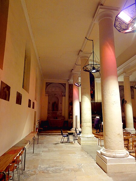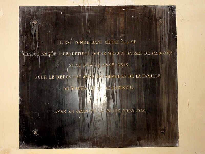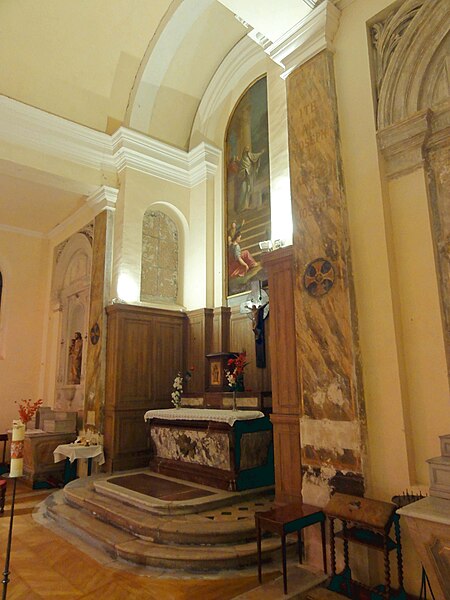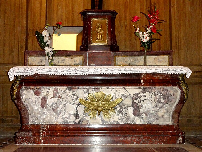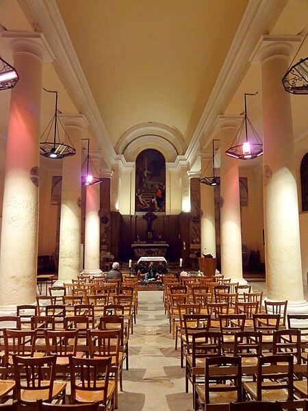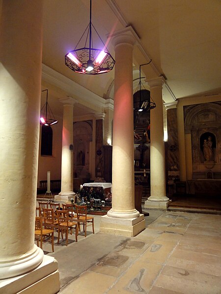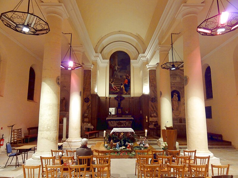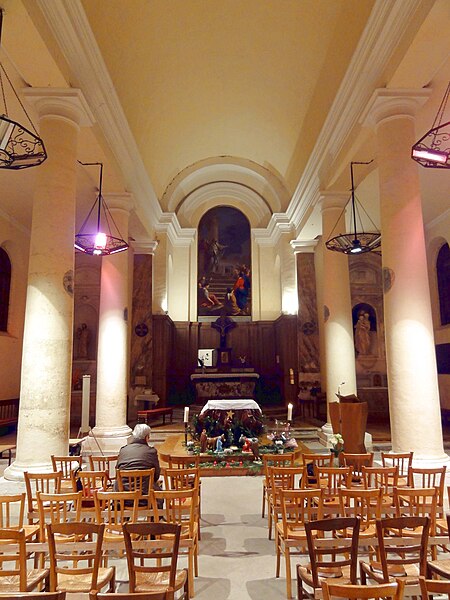 Le retable du maître-autel se résume à un grand tableau cintré de Larriel représentant saint Denys prêchant aux portes de Paris, tandis que deux retables latéraux sont consacrés à saint Joseph et à la Vierge Marie. Le mobilier est peu abondant mais en grande partie contemporain de l'édifice : on note un tambour de porte orné de pilastres cannelés, des bénitiers en forme de coquille, des fonts baptismaux traités en faux-marbre rouge et quelques pierres tombales anciennes intégrées au dallage. Le maître-autel ancien, en forme de tombeau galbé et traité en faux-marbre gris et rouge, provient de la chapelle du château ; son tabernacle porte un monogramme AM et la représentation du pélican mystique. Le confessionnal, dépourvu d'ornements remarquables sauf une grille en fer forgé, et douze vitraux hagiographiques des bas-côtés signés Claudius Lavergne complètent le mobilier. L'ensemble dégage un effet puissant grâce aux diamètres importants des piliers et à la concentration de la décoration sur les multiples strates de la modénature, rapprochement que Dominique Foussard établit avec certaines réalisations néo-classiques de la fin du XVIIIe siècle.