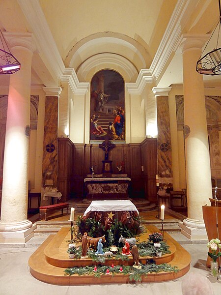 L'église adopte un plan rectangulaire simple et symétrique, avec une abside rectangulaire saillante qui forme la base du clocher. L'intérieur suit un plan basilical : trois vaisseaux et six travées sont délimités par deux colonnades d'ordre dorique, sans cannelures, composées de cinq colonnes de chaque côté et de deux pilastres. La fausse voûte en berceau du vaisseau central lui confère une hauteur supérieure à celle des collatéraux, qui sont coiffés de plafonds plats; la sacristie, située devant le chevet, occupe un étage et atteint la hauteur des collatéraux. La décoration intérieure est concentrée sur l'entablement et la modénature ; le chœur, mis en valeur par l'abside et son grand retable, est traité par une superposition de plans qui accroît la profondeur visuelle. Les collatéraux, plus sobres, abritent toutefois des retables latéraux ordonnés d'après le portail et rompant avec la nudité des murs ailleurs.