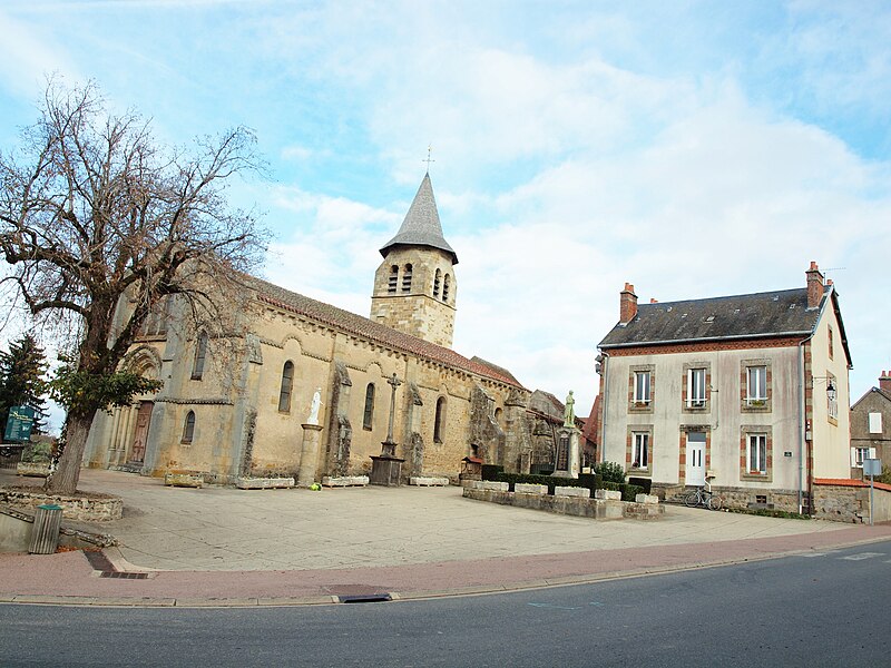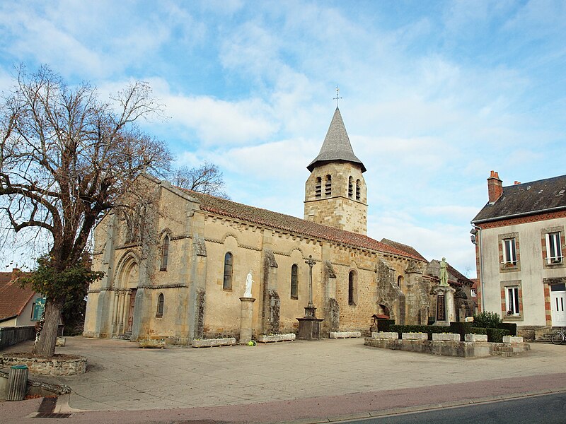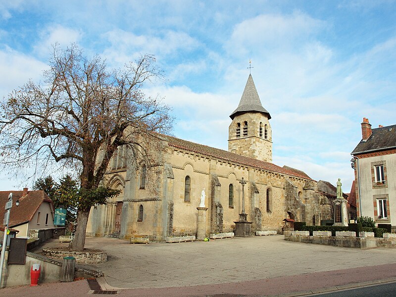 L’église Saint-Denis, de style roman, se trouve au centre du bourg de Deux-Chaises (Allier), au croisement de la rue Jean-Charles Varennes et de la D231 (rue des Tilleuls) qui conduit vers Tréban ; une petite place au sud, entre l’édifice et le carrefour, accueille le monument aux morts et une croix de mission est adossée au flanc sud. La paroisse dépendait de l’abbaye de Saint-Denis, ce qui explique le vocable de l’église. L’édifice résulte de deux campagnes romanes : l’abside et les absidioles en hémicycle datent de la fin du XIe ou du début du XIIe siècle et ont été restaurées en 1867 ; elles sont précédées de longues travées droites voûtées en berceau et reliées par des ouvertures en plein cintre. De la même période datent les murs gouttereaux et les colonnes sur desserets, pourvues de chapiteaux et de bases, qui reçoivent les doubleaux. La nef et les bas-côtés ont été entièrement repris dans la seconde moitié du XIIe siècle ; ils sont couverts de berceaux brisés et percés de grandes arcades du même tracé, ouvertes entre des piles rectangulaires flanquées de colonnes. Les chapiteaux des piliers de la nef sont sculptés de feuillages et de motifs d’oiseaux buvant dans des coupes. À l’extérieur, le pignon de façade, restauré en 1878, n’a conservé de sa décoration primitive que la croix pommetée sommitale. Le clocher carré, élevé sur la croisée, présente un étage percé sur chaque face de deux baies en plein cintre encadrées de boudins ; la flèche de pierre qui devait le couronner a été remplacée par une toiture. L’église Saint-Denis, de caractère roman et datée du XIIe siècle, est classée au titre des monuments historiques depuis 1943.