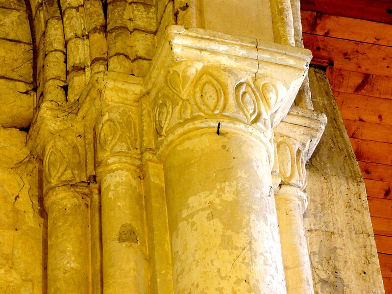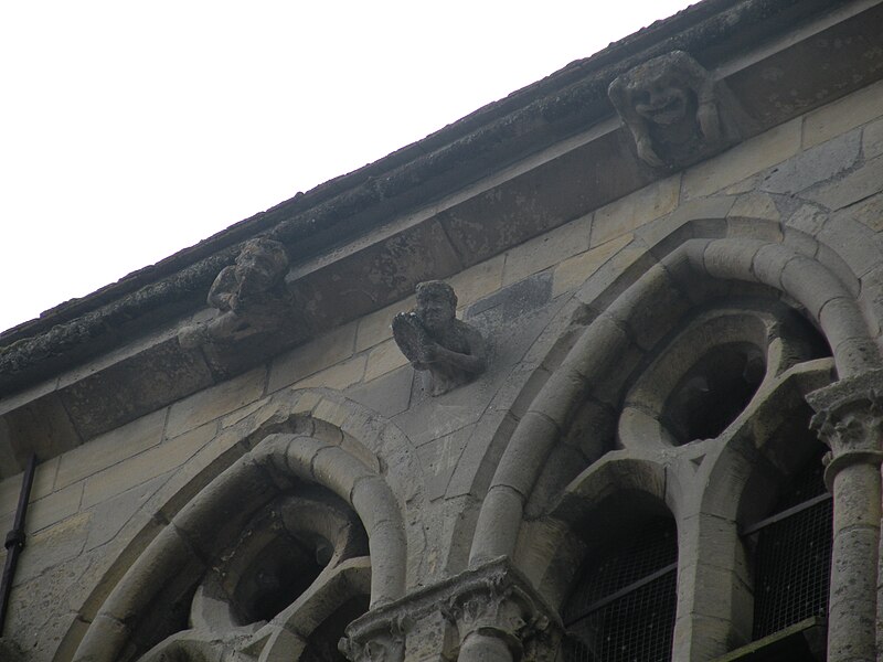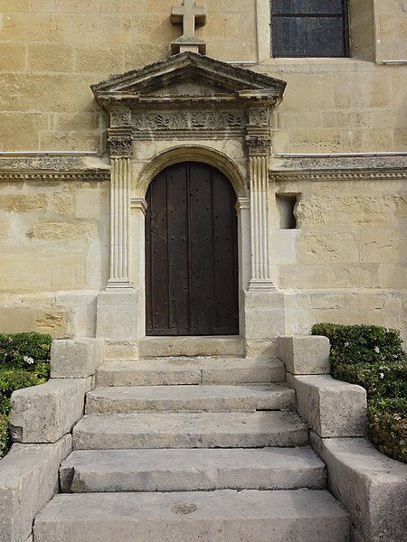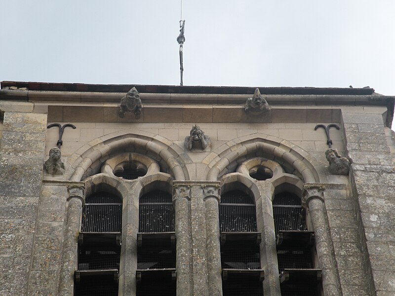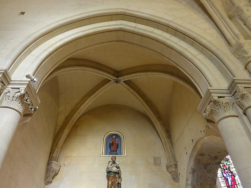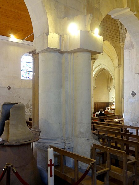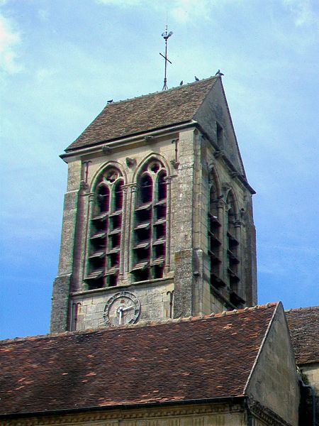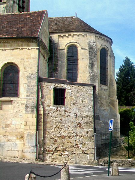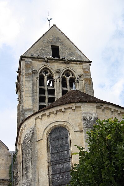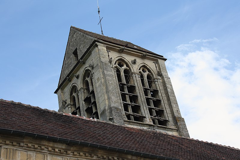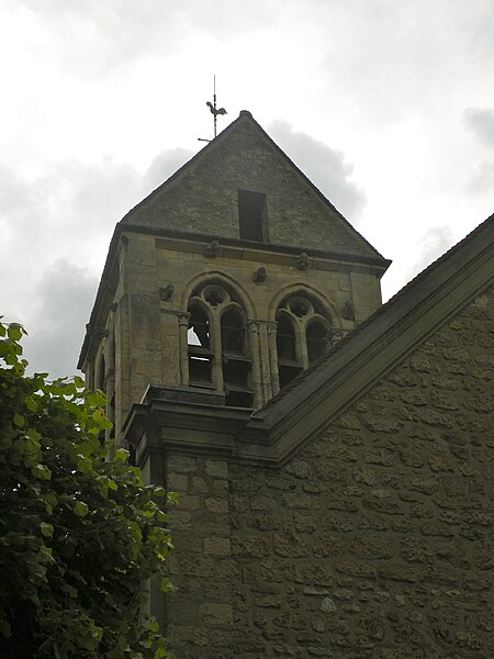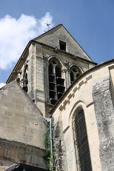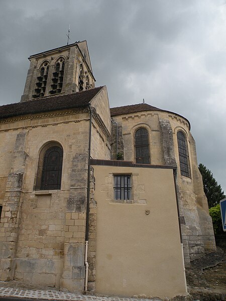 Les deux croisillons et leurs chapelles montrent des variations décoratives : le croisillon sud est d'une austérité marquée, tandis que le croisillon nord et la chapelle orientée nord comportent des chapiteaux à feuilles d'acanthe et quelques figures animales, souvent resculptés à l'époque moderne. La présence d'une arcade bouchée à l'ouest de la chapelle orientée nord suggère un aménagement ancien qui n'a pas donné lieu à un bas-côté nord. À l'extérieur, l'élévation méridionale traduit la superposition de campagnes : l'abside du XIIe siècle reste lisible, le bas-côté et la façade Renaissance datent du XVIe siècle et la façade occidentale a été remaniée au XIXe siècle. Le clocher en bâtière, en pierre de taille, présente des baies de beffroi à deux lancettes surmontées d'un quatre-feuilles, des colonnettes à chapiteaux, des profils de remplage et un décor de têtes humaines qui rappelle certains clocher du Vexin.