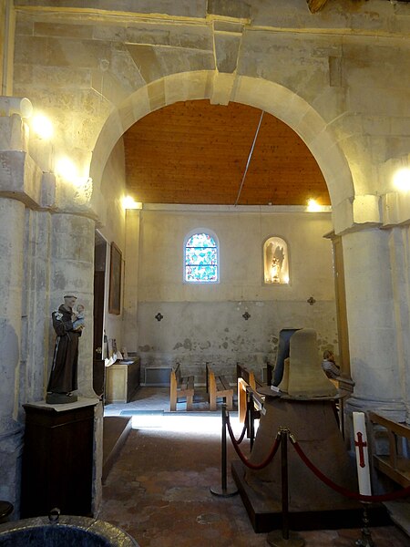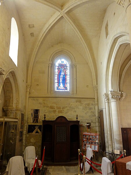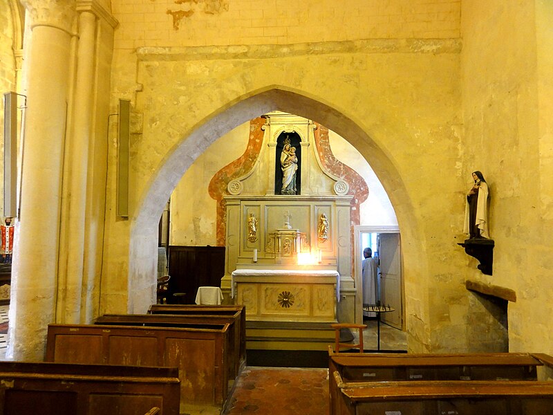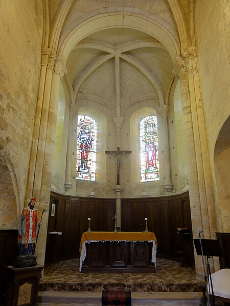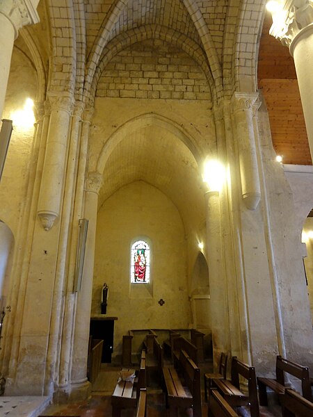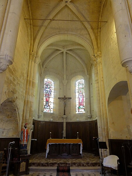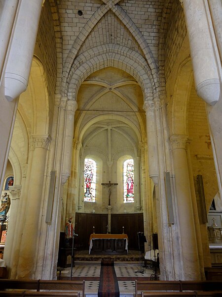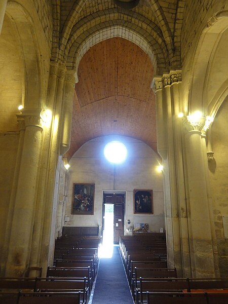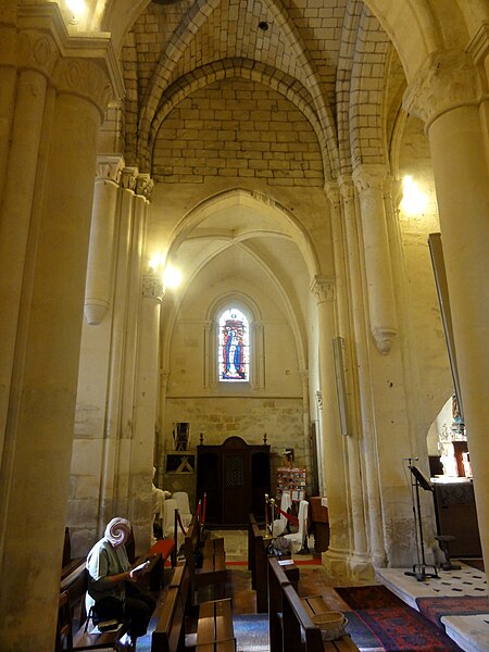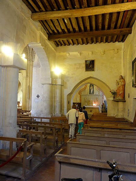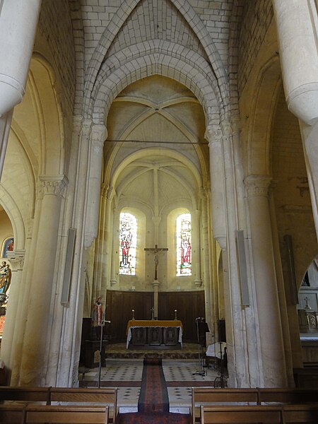 Le plan de l'édifice, globalement cruciforme mais irrégulier, comprend une nef de deux travées accompagnée d'un unique bas-côté au sud, un transept aux deux croisillons dissemblables, un clocher au droit de la croisée, deux chapelles orientées et un chœur formé d'une travée droite et d'une abside en hémicycle à pans coupés ; la sacristie et une cage d'escalier sont des adjonctions postérieures. L'intérieur présente un plafond lambrissé dans la nef, un plafond plat dans le bas-côté, une voûte en berceau brisé dans le croisillon sud, des berceaux plein cintre dans la chapelle orientée sud et des voûtes d'ogives dans les autres travées, l'abside étant voûtée par cinq ogives. La nef, d'allure sobre, est peu ornée ; elle reçoit deux tableaux, deux vitraux posés en mai 2014 et une niche abritant une Vierge à l'Enfant ; les grandes arcades en pierre de taille sont non moulurées et leurs chapiteaux restent essentiellement cubiques et non sculptés. La croisée du transept et la travée droite du chœur, datées des années 1150-1190, constituent les éléments les plus intéressants sur le plan archéologique, avec leurs arcades en tiers-point, leurs faisceaux de colonnettes et des clés de voûte et chapiteaux sobres. L'abside conserve des caractères proches de l'architecture romane, avec formerets toriques, fenêtres en cintre surbaissé et une corniche appuyée sur corbeaux, bien que l'exécution du voûtement présente quelques maladresses.