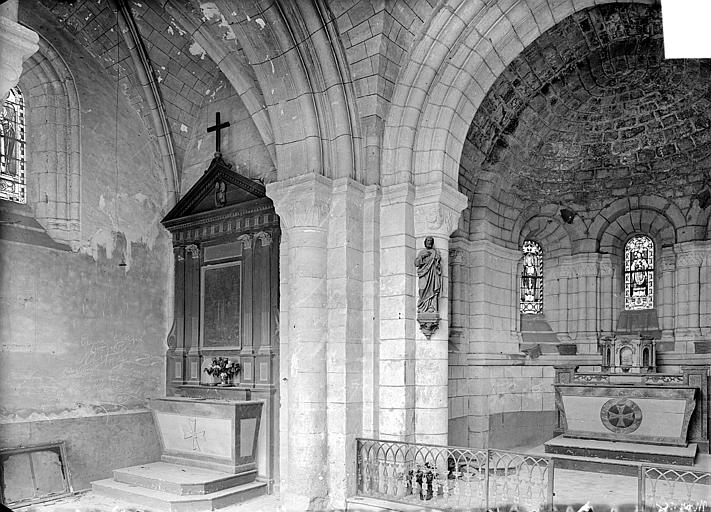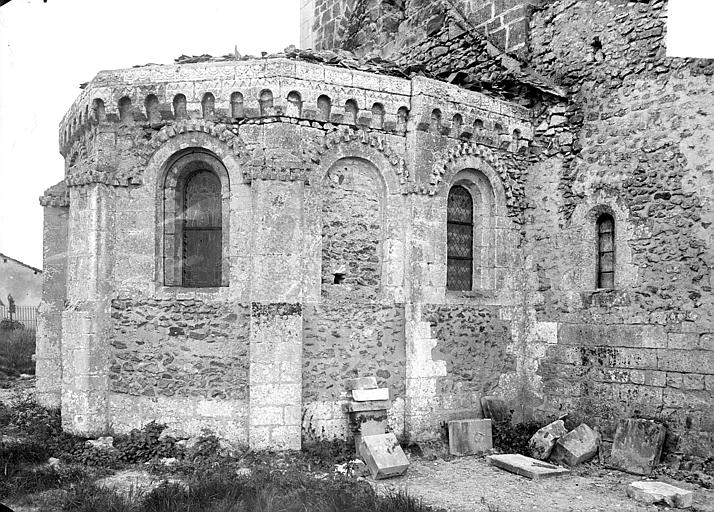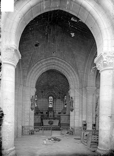 Le chœur voûté est vaste et bien éclairé. L'abside en cul-de-four comporte des fenêtres à colonnettes et chapiteaux ; extérieurement, elle est soulignée par des bandes lombardes sous la corniche qui surplombe des fenêtres dont une sur deux est aveugle. L'église conserve des vitraux du début du XVIe siècle et une dalle funéraire en pierre du XIVe siècle, non identifiée, classée au titre d'objet.