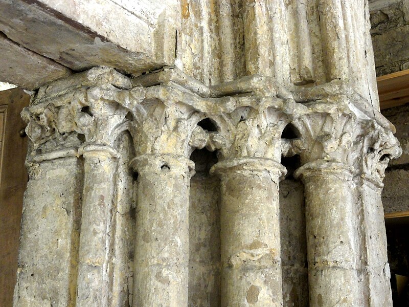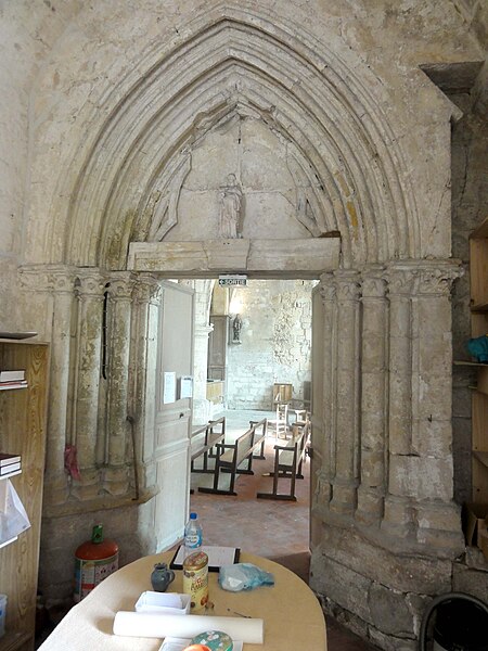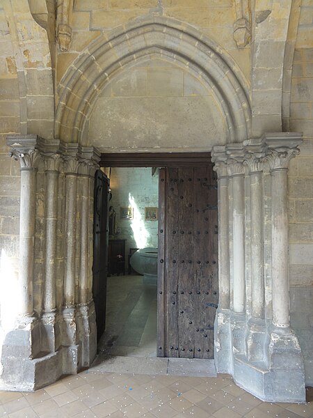 Le porche, initialement subdivisé en trois travées, a été réduit à une travée depuis la création de la sacristie et abrite l'unique portail encore en service, cantonné de groupes de colonnettes et d'archivoltes toriques ; le porche voûté combine une voûte d'ogives médiévale et des sections de berceau, tandis que la sacristie voûtée en berceau présente des doubleaux et des supports sommairement moulurés d'allure tardive. L'ancien portail occidental de la chapelle sud sert aujourd'hui d'accès depuis la sacristie et porte un tympan orné d'une arcature trilobée.