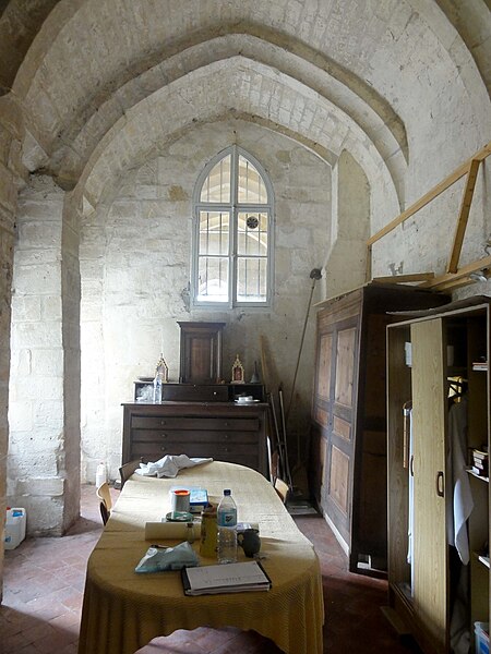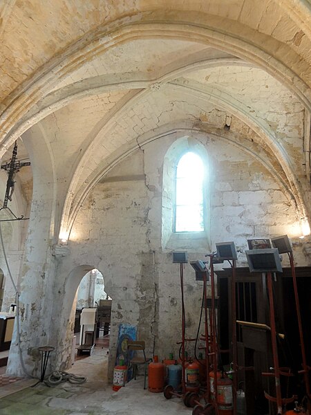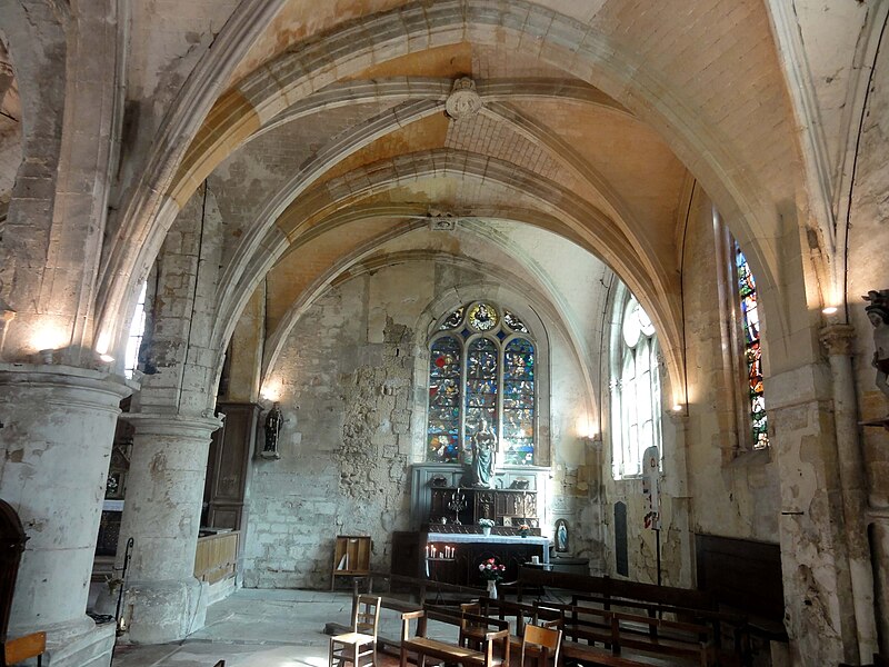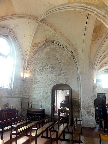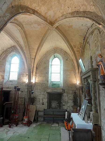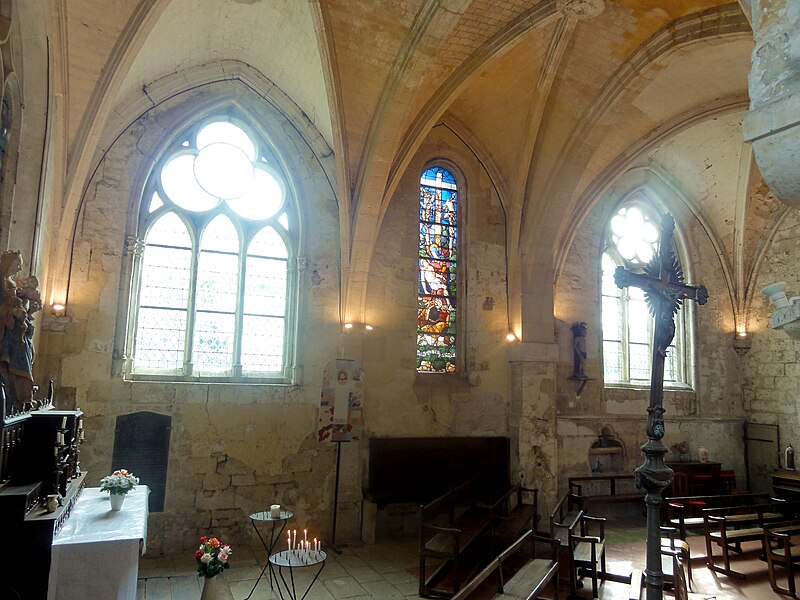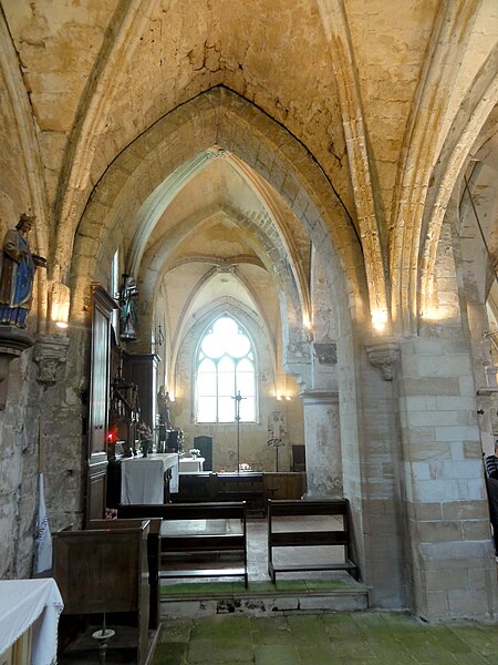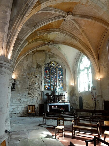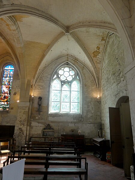 La chapelle latérale nord, édifiée à la fin du XIIe ou au début du XIIIe siècle, comporte deux travées de profondeur inégale, des lancettes simples et des traces de peintures murales au chevet ; ses voûtes retombent sur faisceaux de colonnettes et cul‑de‑lampes sculptés de crochets. La chapelle latérale sud, organisée en trois travées inégales, présente deux larges fenêtres rayonnantes au réseau élaboré et une fenêtre de la Renaissance en plein cintre ; le premier doubleau, plus massif, et certains éléments de profil témoignent d'une construction en deux temps et d'apports renaissants. Cette chapelle conserve une piscine liturgique sous arcature trilobée, une piscine de style Renaissance et des clés de voûte variées, dont une représentation rare d'un portrait féminin traité en homme‑vert et des décorations de type renaissant dans la dernière travée.