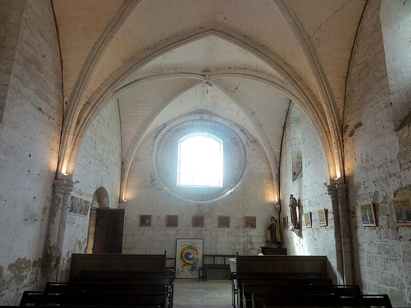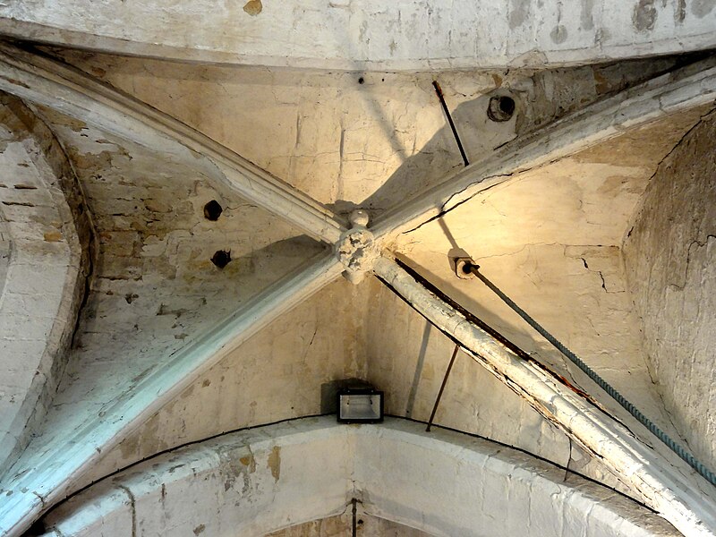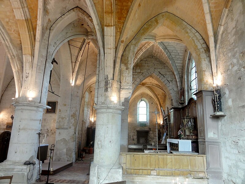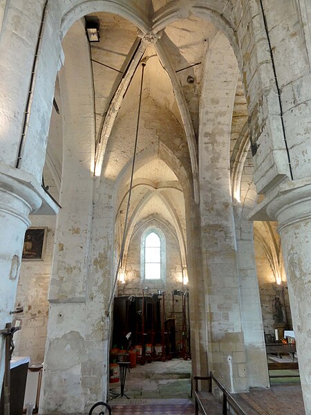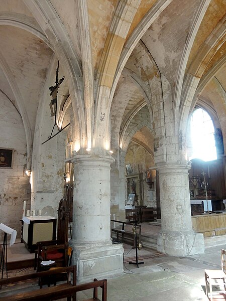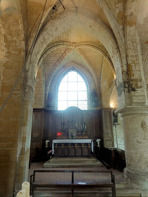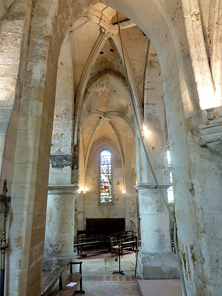La base du clocher, barlongue dans le sens nord‑sud, communique par d'épaisses arcades en tiers‑point chanfreinées avec les travées voisines ; ces arcades, non moulurées, montrent des reprises en sous‑œuvre au milieu du XIIIe siècle. La seconde travée du chœur est plus profonde que large ; sa grande baie orientale, en tiers‑point, a perdu son remplage rayonnant et la partie inférieure est aujourd'hui murée, mais les vestiges indiquent un ancien remplage à trois lancettes. Des piles cylindriques de facture Renaissance et des cul‑de‑lampes sculptés ponctuent l'espace du chœur.