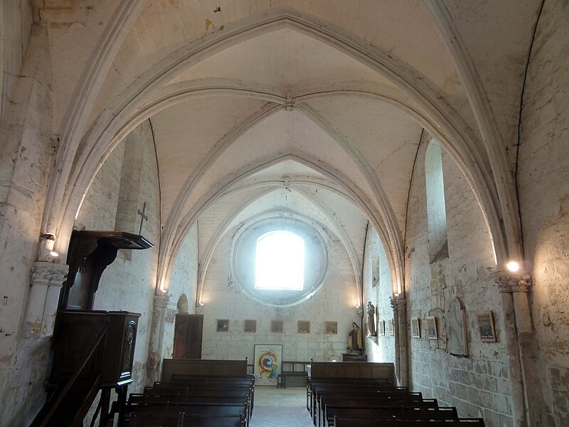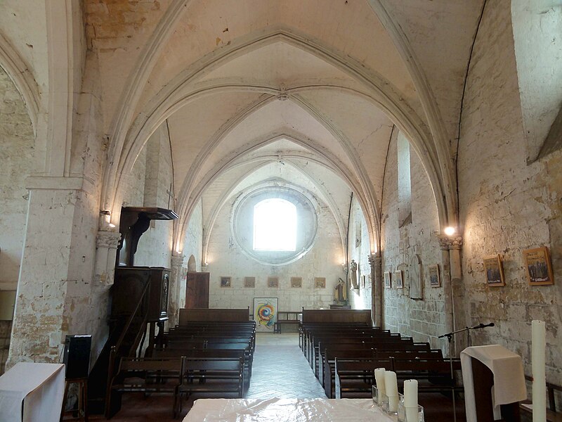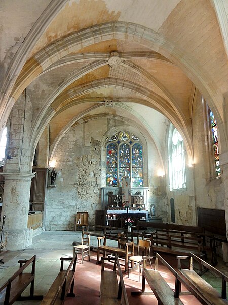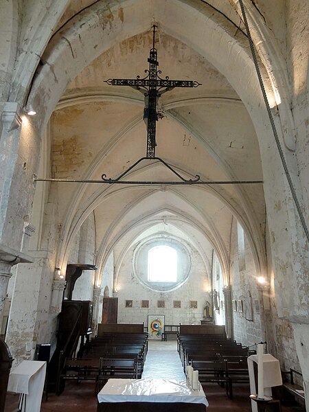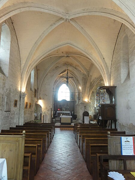 La nef, initialement une salle rectangulaire non voûtée, est plus large que la base du clocher ; elle communique avec la chapelle nord par un passage berrichon et reçoit son éclairage principal par trois fenêtres en plein cintre hautes au nord. Le voûtement d'ogives, mis en place au XIIIe siècle, repose sur des faisceaux de colonnettes et des tailloirs à trois becs, avec chapiteaux sculptés de crochets ou de feuillages ; les ogives au profil de tore aminci présentent des clés arborant des couronnes de feuillages et des têtes humaines, témoignant d'un haut niveau esthétique propre à la période rayonnante. La façade occidentale, percée d'une fenêtre en anse de panier actuellement, conserve le souvenir d'une ancienne rosace désormais murée.