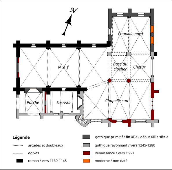Le plan est irrégulier, fruit des campagnes successives : une nef de trois travées dont les deux premières sont bordées au sud par le porche et la sacristie, la base du clocher formant la première travée du chœur, une seconde travée de chœur terminée par un chevet plat, une chapelle latérale nord de deux travées et une chapelle latérale sud de trois travées communicantes avec la dernière travée de la nef et les deux travées du chœur. La première travée de la chapelle sud se présente comme un faux croisillon, avec pignon et toit perpendiculaire, et les élévations orientales offrent une enfilade de pignons de profils différents. L'ensemble intérieur est voûté d'ogives, mais plusieurs voûtes et arcatures sont des reprises postérieures à la construction primitive de certaines travées.