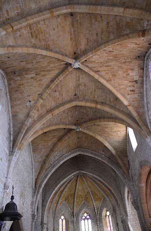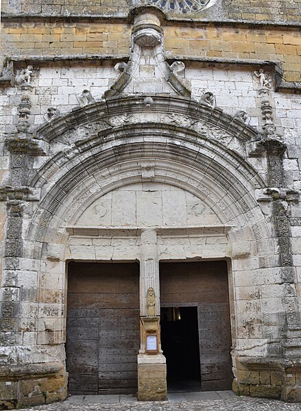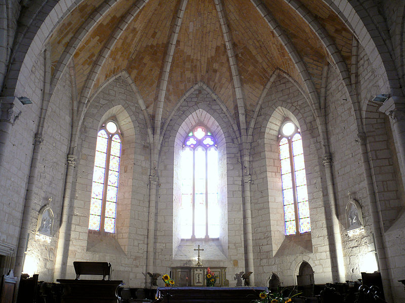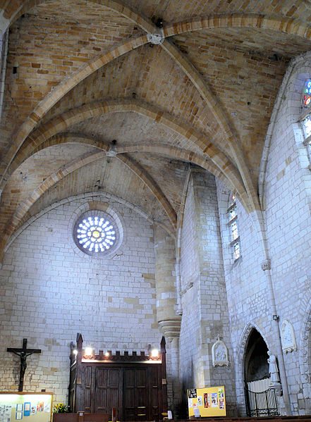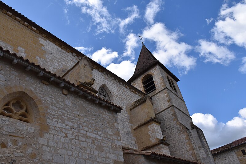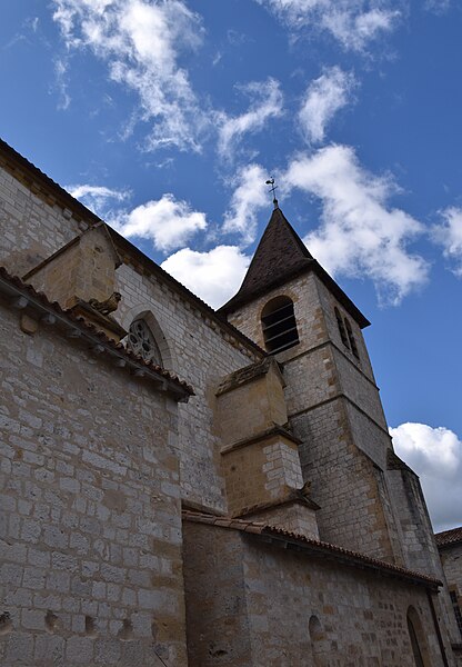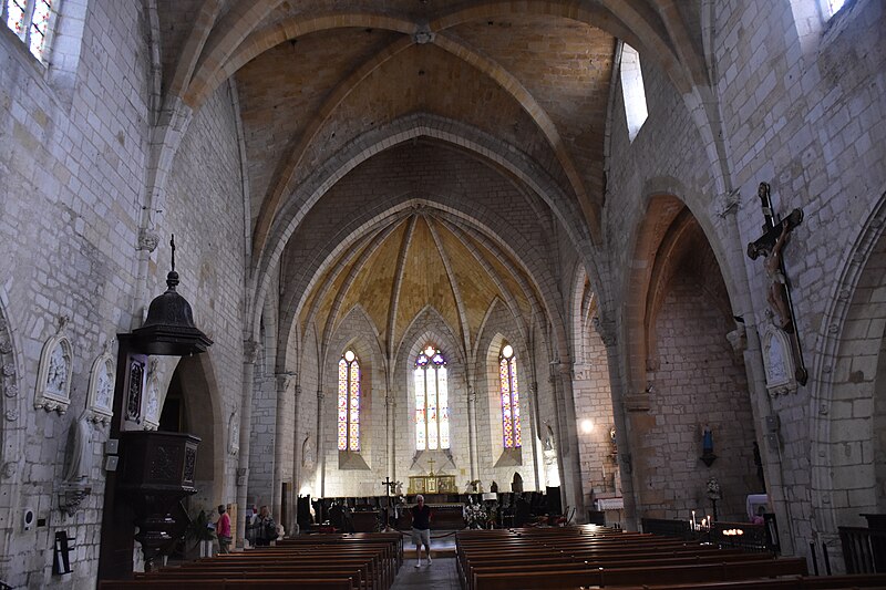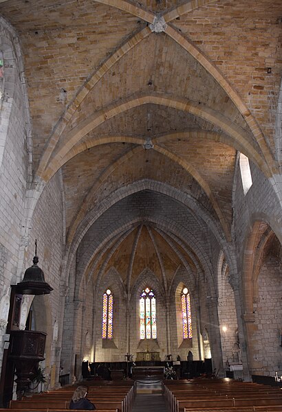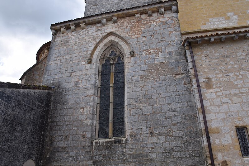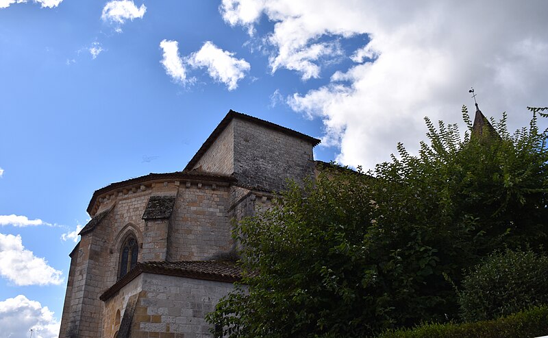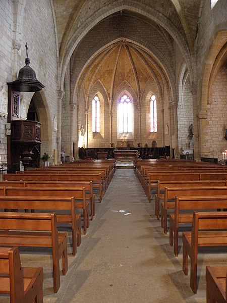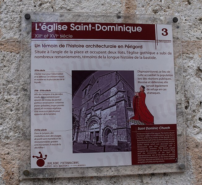 L'église Saint-Dominique est une église catholique située à Monpazier, dans le département de la Dordogne. Après la mort d'Alphonse de Poitiers, les changements de souveraineté liés aux traités du XIIIe siècle aboutissent, par un paréage conclu en 1285 avec les barons de Biron, à la fondation de la bastide de Monpazier. Pour favoriser son développement, la nouvelle ville reçoit une charte accordant aux habitants des statuts particuliers ; initialement dotée de deux bayles, elle n'en conserve qu'un après un accord de 1293, le bayle nommant six consuls chaque année à la fête de la Purification de la Vierge. À la source du Dropt existait alors le village de Capdrot, doté d'une collégiale et d'un chapitre. L'église est mentionnée en 1286 dans une convention avec les consuls et le roi d'Angleterre ordonne en 1289 un rapide achèvement des travaux, ce qui permet de situer sa construction à la fin du XIIIe et au début du XIVe siècle. La région, frontalière entre domaines anglais et français, subit de fortes perturbations pendant la guerre de Cent Ans : la ville est prise, reprise et pillée, et la paix ne revient qu'après la bataille de Castillon en 1453 ; les habitants prêtent ensuite fidélité au roi Louis XI. L'église fait l'objet de réparations et d'une surélévation des murs après 1450, sa nef est voûtée en croisées d'ogives, Géraud Maurichon exécute la charpente et la couverture en 1462, et une nouvelle cloche est donnée en 1476. La collégiale de Capdrot, ruinée par les destructions de la guerre, voit son chapitre transféré à Monpazier après une ordonnance de l'évêque de Sarlat Pons de Salignac en date du 14 juillet 1490. Contrairement à certaines affirmations, il n'y a pas eu construction d'un nouveau chœur en 1506, mais un aménagement du chœur liturgique et l'installation des stalles, travaux qui font l'objet d'un partage des frais établi par sentence arbitrale. Plusieurs chapelles sont ajoutées à la fin du XVe siècle et une dernière fondation est attestée en 1521 dans la première travée de la nef, au nord. Pendant les guerres de Religion, un évêque est consacré à Monpazier en 1558 et un nouveau portail est construit pour l'occasion ; la ville est ensuite prise par Geoffroy de Vivans le 21 juin 1574, Henri de Navarre y séjourne le 12 septembre 1579, et le traité du Fleix de 1580 prévoit le démantèlement de Monpazier. En 1596 le roi cède Monpazier à Jacques Nompar de Caumont, mettant fin au paréage de 1285 ; la région connaît également des révoltes de paysans dites Croquants et d'autres soulèvements locaux. Le dernier seigneur cité est Armand Louis de Gontaut-Biron. La Révolution a peu d'effets sur la ville ; seule une inscription au tympan de l'église en garde le souvenir. L'église possédait une relique de la Vraie Croix dont la dévotion fut relayée par des feuilles imprimées racontant des prodiges attribués à la relique. Dans le chœur se trouvent des stalles en chêne finement sculptées, réalisées à l'origine pour la collégiale de Capdrot fondée en 1318 et transférées à Monpazier après 1490 ; il en subsiste 35, mais les hauts-dossiers et les couronnements ont disparu, et elles ont été restaurées en 1978. Les stalles et les fonts baptismaux du XIVe siècle ont été classés objets mobiliers le 7 avril 1971, et une statue en bois représentant la Vierge à l'Enfant, datée du XVIIe siècle, a été inscrite le 30 août 1974. L'édifice est classé au titre des monuments historiques depuis 1862. Les vitraux du chevet comprennent une verrière représentant le Sacré-Cœur de Jésus entouré de saint Paul et de saint Pierre, réalisée par Jean Besseyrias, et une autre figurant saint Dominique recevant le Rosaire de l'Enfant Jésus et de la Vierge.