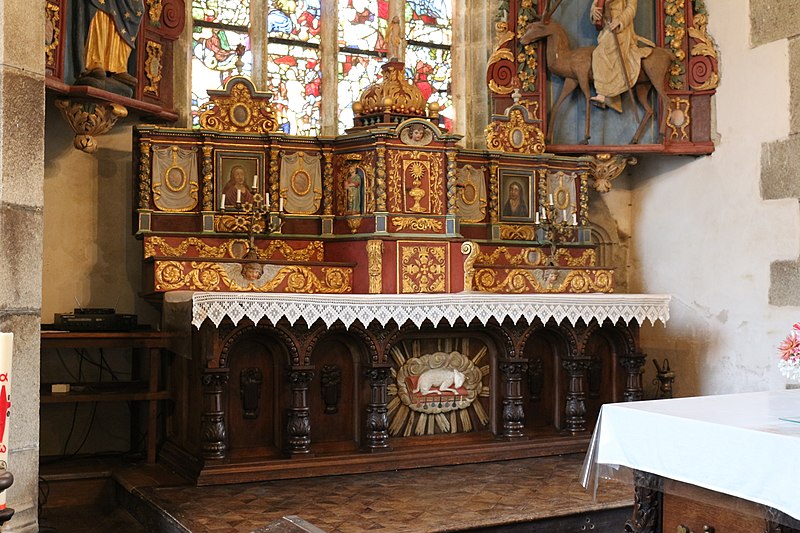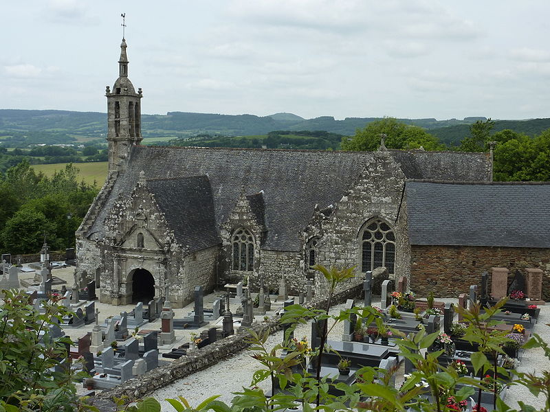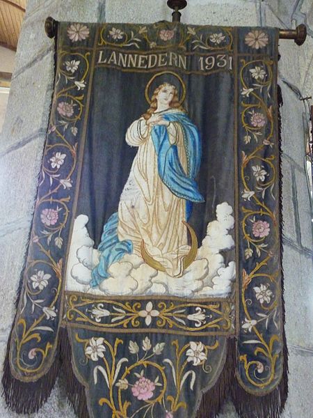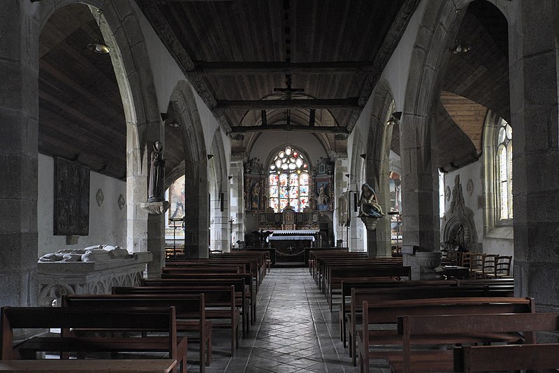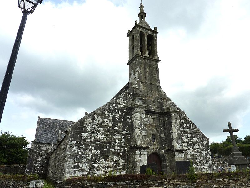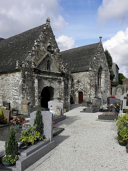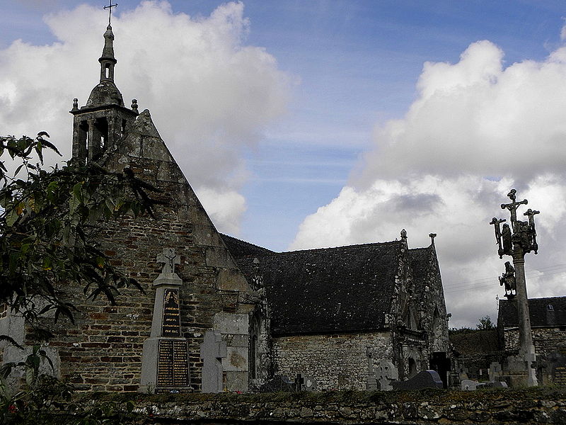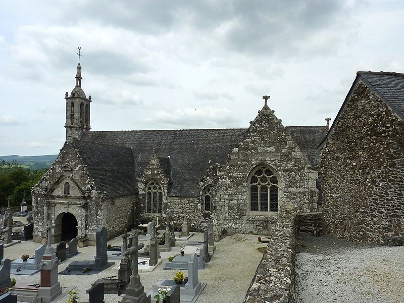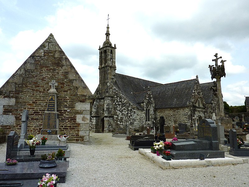 L’église Saint-Edern, située dans l’enclos paroissial de Lannédern (Finistère, Bretagne), date du XVIe siècle. L’édifice se compose d’une triple nef couverte par des voûtes en bois. Le chevet conserve une verrière de l’époque de construction et un vitrail du bas-côté représentant la Vierge à l’Enfant et Sainte-Barbe. Dans la nef se trouve le tombeau de Saint-Edern ; la vie du saint est relatée en bas-relief sur un panneau de bois conservé dans l’ossuaire. L’ensemble de l’enclos paroissial, remarquable par la qualité architecturale de ses éléments, a été classé monument historique par arrêté du 2 avril 1915. Le clocher, sommé d’un clocheton, est daté de 1606, et le porche de 1662 est considéré par Waquet comme l’un des vingt-six grands porches classiques du diocèse de Quimper et Léon. L’ossuaire, au sud-ouest de l’église, présente une façade harmonieuse en grand appareillage de granit, une porte de style Renaissance et quatre baies en plein cintre coiffées de putti et encadrées de bas-reliefs ornés de têtes de mort. Le calvaire du cimetière, daté par Couffon au XVIIe siècle, porte à mi-fût la statue de Saint-Edern sur son cerf. Un plan de l’enclos datant de 1813 est conservé. Parmi les objets remarquables figure une croix de procession en argent réalisée par François Lapous, portant l’inscription « FET LE JOUR 19 D Avril 1620 » et les armes de la famille de Legormel ; cette croix est classée au titre des monuments historiques depuis le 14 juin 1898, et l’une de ses clochettes a été dérobée en 1972. On trouve également plusieurs statues anciennes, dont Saint-Edern chevauchant son cerf et une Piéta en granit, le tombeau de Saint-Edern daté du XIVe siècle, ainsi que le retable du Rosaire dont le tableau central porte la signature de Y. Quintin et la date de 1660.