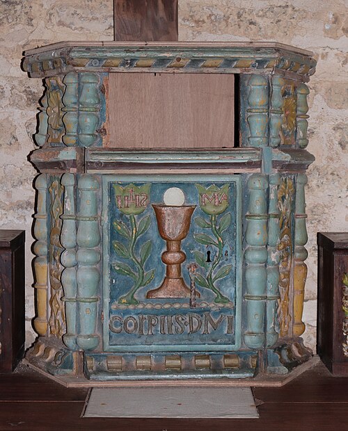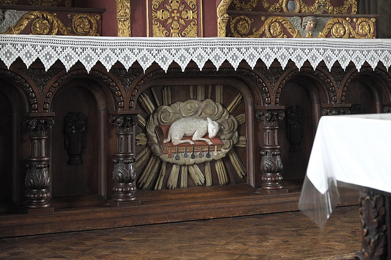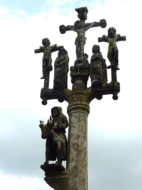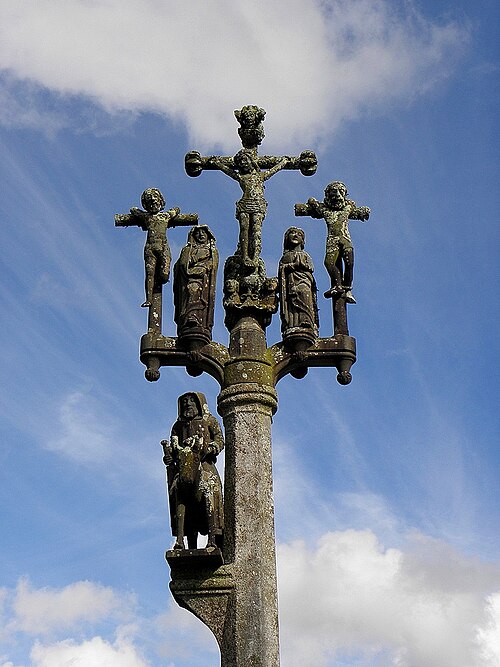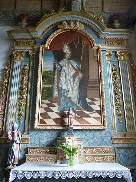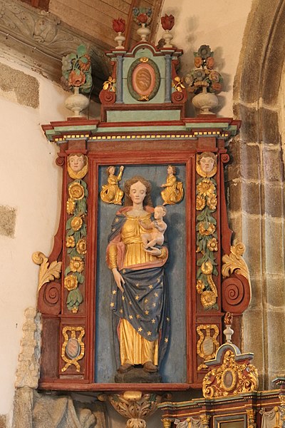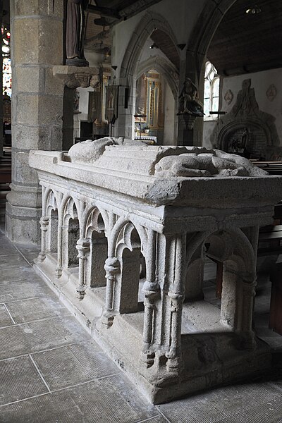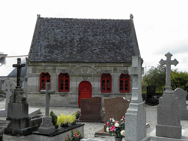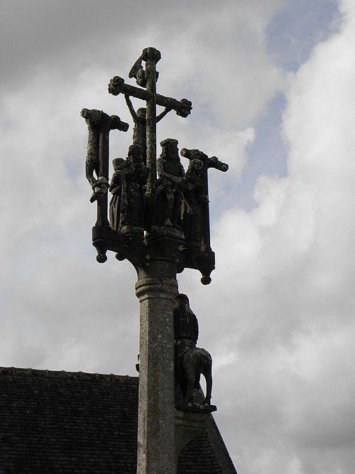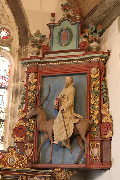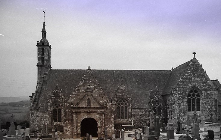 L’église Saint-Edern, située dans l’enclos paroissial de Lannédern (Finistère, Bretagne), date du XVIe siècle. L’édifice se compose d’une triple nef couverte par des voûtes en bois. Le chevet conserve une verrière de l’époque de construction et un vitrail du bas-côté représentant la Vierge à l’Enfant et Sainte-Barbe. Dans la nef se trouve le tombeau de Saint-Edern ; la vie du saint est relatée en bas-relief sur un panneau de bois conservé dans l’ossuaire. L’ensemble de l’enclos paroissial, remarquable par la qualité architecturale de ses éléments, a été classé monument historique par arrêté du 2 avril 1915. Le clocher, sommé d’un clocheton, est daté de 1606, et le porche de 1662 est considéré par Waquet comme l’un des vingt-six grands porches classiques du diocèse de Quimper et Léon. L’ossuaire, au sud-ouest de l’église, présente une façade harmonieuse en grand appareillage de granit, une porte de style Renaissance et quatre baies en plein cintre coiffées de putti et encadrées de bas-reliefs ornés de têtes de mort. Le calvaire du cimetière, daté par Couffon au XVIIe siècle, porte à mi-fût la statue de Saint-Edern sur son cerf. Un plan de l’enclos datant de 1813 est conservé. Parmi les objets remarquables figure une croix de procession en argent réalisée par François Lapous, portant l’inscription « FET LE JOUR 19 D Avril 1620 » et les armes de la famille de Legormel ; cette croix est classée au titre des monuments historiques depuis le 14 juin 1898, et l’une de ses clochettes a été dérobée en 1972. On trouve également plusieurs statues anciennes, dont Saint-Edern chevauchant son cerf et une Piéta en granit, le tombeau de Saint-Edern daté du XIVe siècle, ainsi que le retable du Rosaire dont le tableau central porte la signature de Y. Quintin et la date de 1660.