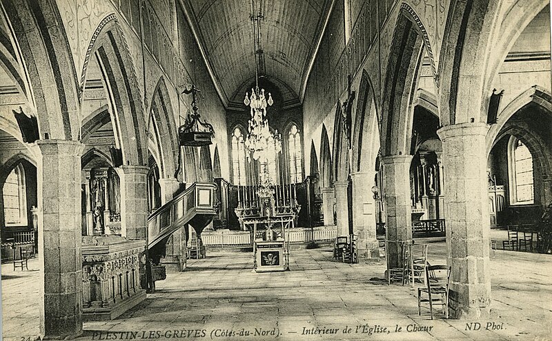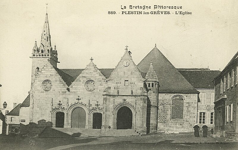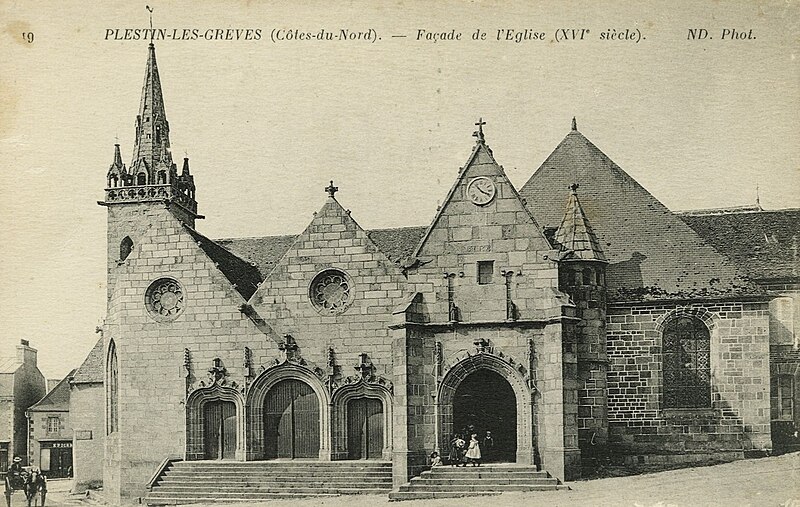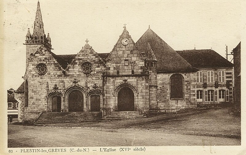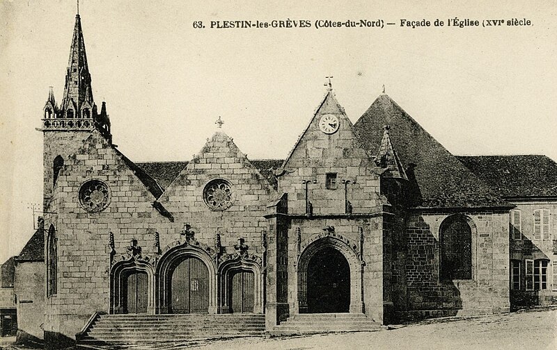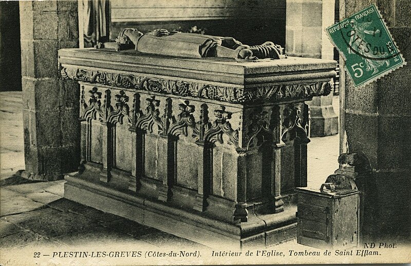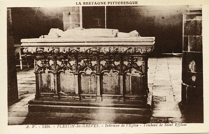 L'église Saint‑Efflam est une église catholique implantée à Plestin‑les‑Grèves, dans le département des Côtes‑d'Armor. Elle est dédiée à saint Efflam et conserve ce qui est présenté comme son tombeau. L'inscription portée sur le pignon du porche indique l'année 1576. Les reliques attribuées à saint Efflam ont été découvertes dans l'église le 26 juin 1819 ; l'abbé Tresvaux rapporte les avoir trouvées sous une pierre plate à trois pieds de profondeur, en présence de plusieurs ecclésiastiques, du curé F. Nayrod, du maire François Moriou et d'autres témoins. Le procès‑verbal énumère divers débris d'ossements — clavicule droite, vertèbres cervicales et dorsales, os du métatarse et du métacarpe, une phalange, fragments de côtes, portions du calcaneum et de l'os occipital, fragment de tête de tibia — qui furent reconnus comme reliques du saint. L'édifice est inscrit au titre des monuments historiques depuis 1908. Il a été édifié sur l'emplacement d'une chapelle du XVe siècle, comme l'atteste l'inscription du porche, et a connu des remaniements jusqu'à la Seconde Guerre mondiale. Le porche méridional est orné de statues des douze apôtres, disposées de part et d'autre et accompagnées des signes de leur martyre ou de leur mission, ainsi que d'une statue de saint Yves placée au fronton dans une niche disproportionnée ; ces sculptures en kersantite sont l'œuvre du sculpteur Roland Doré. L'édifice a été remanié et élargi à différentes époques, au point d'être aujourd'hui plus large que long et de compter au total cinq nefs. Le clocher présente des caractères du XIIIe siècle et plusieurs de ses pierres portent des marques de tâcherons, tandis que le porche méridional est riche et semble appartenir à la fin de la période ogivale. Le tombeau de saint Efflam, daté des XVe ou XVIe siècles, a probablement remplacé un tombeau antérieur édifié lors de la translation des reliques en 994. La documentation photographique ancienne et récente illustre la façade sud, le porche méridional et son intérieur, les portails, les statues des apôtres, le clocher et le clocheton. Pour en savoir plus, consulter les listes des monuments historiques et des églises des Côtes‑d'Armor ainsi que les sources mentionnées en notes et références.