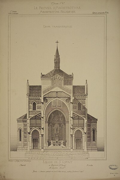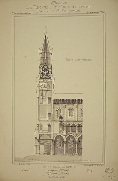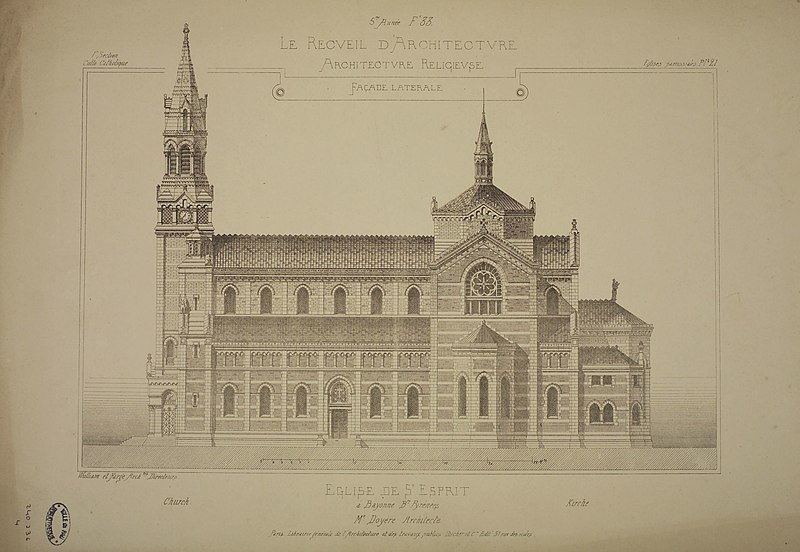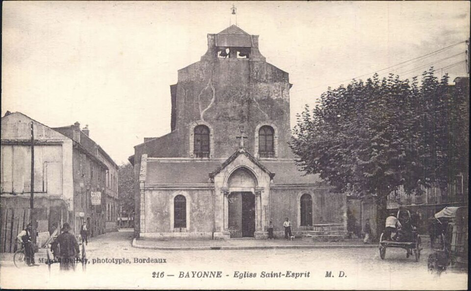 L'église Saint-Esprit est une église catholique située à Bayonne, dans le quartier du même nom, en face de la gare SNCF. Elle dépend de la paroisse Saint-Vincent-de-Paul/Saint-Étienne du diocèse de Bayonne et fait l'objet d'une inscription au titre des monuments historiques en 2008. À la fin du XIIe siècle, l'ordre de Saint-Jean de Jérusalem s'installe dans le futur quartier pour y établir un prieuré-hôpital destiné aux pèlerins de Saint-Jacques-de-Compostelle; en 1243, ce prieuré est remplacé par l'ordre du Saint-Esprit, qui donnera son nom au quartier. Au XVe siècle, sous Louis XI, la chapelle romane est remplacée par une église reconstruite et élevée en collégiale, adoptant des voûtes de style gothique flamboyant. L'édifice conserve cependant des éléments plus anciens, notamment un chevet plat et des fragments de vitraux du XIIIe siècle. Le bâtiment est fortement remanié au XVIe siècle, et certains détails d'influence antiquisante militent en faveur d'une datation partielle à cette époque plutôt qu'à la fin du XVe. Le chapitre collégial est dissous à la Révolution et l'église devient paroissiale en 1792. Au XIXe siècle, avec le développement du quartier lié à l'arrivée du chemin de fer, l'architecte Émile Loupot agrandit l'édifice en ajoutant un bas-côté sud, en construisant un porche d'entrée à colonnes aux chapiteaux néo-romans et en réalisant la tribune d'orgue à l'ouest; ces travaux, conduits en partie à l'initiative du chanoine archéologue Menjoulet, introduisent des accents romano-byzantins dans la restauration. Le plan est rectangulaire, la façade occidentale est percée d'un clocher-mur et précédée d'un porche; la nef débouche sur un chœur voûté dans le goût flamboyant, orné de liernes, de tiercerons et de décor sculpté. Parmi les éléments remarquables figurent un relief polychrome du XVe siècle représentant la Vierge et l'Enfant lors de la Fuite en Égypte, des reliques de sainte Irène conservées depuis 1868 et des verrières fournies en 1906 par l'atelier Mauméjean de Biarritz. Des fragments de vitraux de la chapelle d'origine, représentant l'arbre de Jessé, ont été découverts en 1959 et déposés dans la réserve du musée basque et de l'histoire de Bayonne. L'ensemble témoigne d'une histoire architecturale complexe, mêlant éléments romans conservés, reconstruction flamboyante et réaménagements modernes.