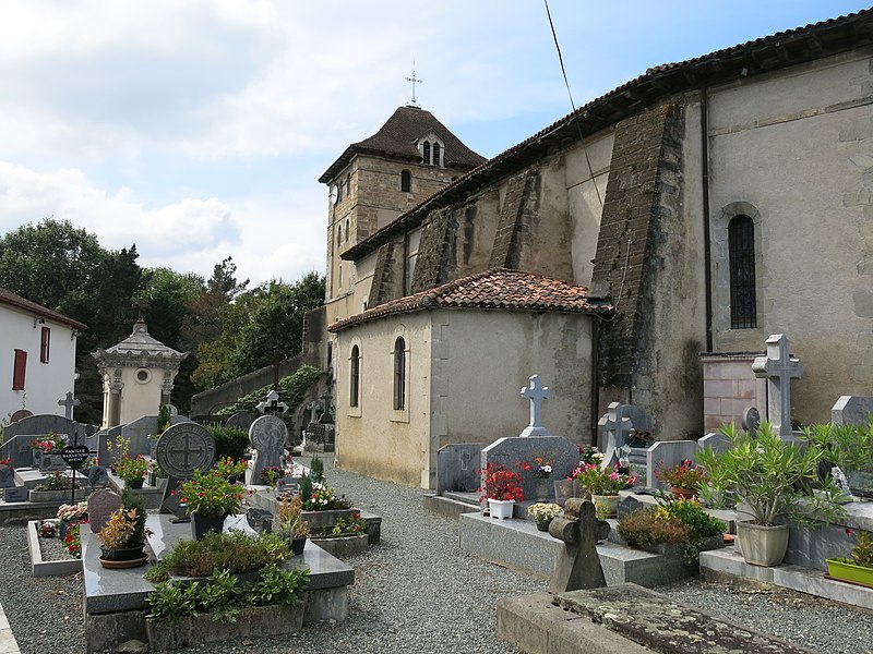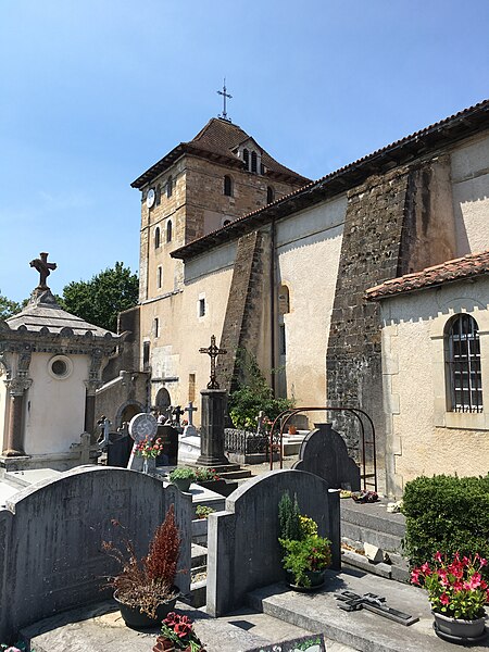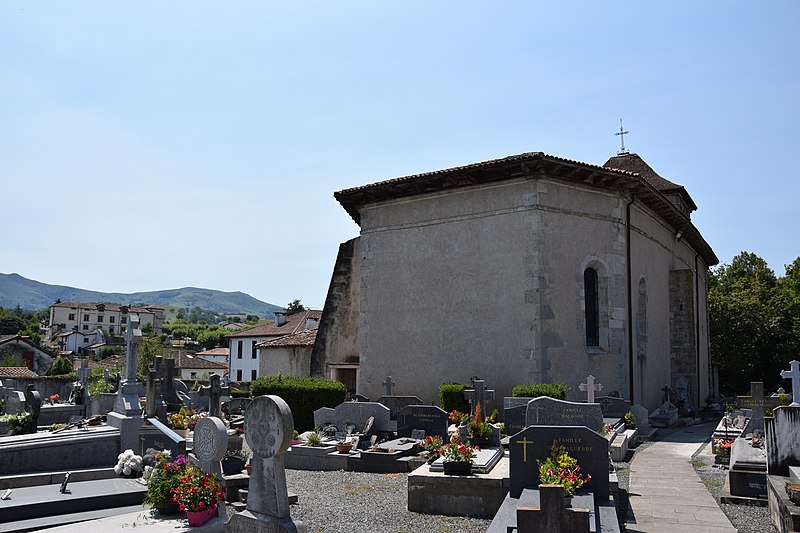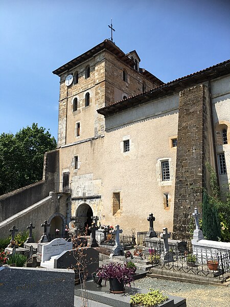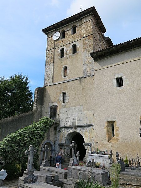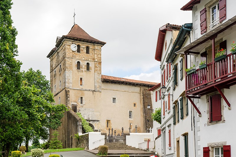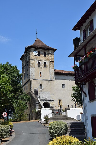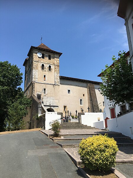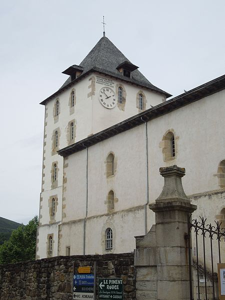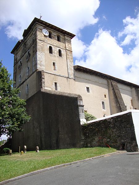L'église Saint-Étienne d'Espelette, dans le Pays basque français (Pyrénées-Atlantiques), se situe sur la route des pèlerins de Compostelle et dépend du diocèse de Bayonne. Typique du Labourd, elle présente l'aspect d'une forteresse et les caractères propres aux églises basques : une longue nef bordée de galeries sur trois faces, poteaux sculptés et balustrades à balustres tournés. Remplaçant une église plus ancienne, l'édifice relève principalement du XVIIe siècle, la nef étant déjà achevée en 1593. Il s'appuie sur des contreforts et comporte un clocher-porche à l'allure de donjon (1667) ainsi qu'un portail de style Renaissance (1627). L'intérieur est richement décoré autour d'un retable baroque en bois doré du XVIIIe siècle, à deux registres rythmés par des colonnes et surmonté de quatre grandes statues : saint Jean‑Baptiste, saint Jacques, saint Pierre et saint Paul. Le tabernacle est encadré de petits bas‑reliefs dorés représentant l'arrestation et la lapidation de saint Étienne, thème repris par le tableau principal du retable. Les murs latéraux et la contrefaçade sont parcourus de trois étages de galeries en bois, installées lorsque la population a augmenté à partir du XVIe siècle ; jusqu'au début des années 1970 ces galeries étaient réservées aux hommes, les femmes et les enfants priant dans la nef. Parmi les œuvres conservées, on note un tableau intitulé Saint Jérôme entend les trompettes du Jugement dernier, offert par le baron d'Ezpelata en 1884 et attribué à Ribera, classé en 1991. L'église a également été le lieu de baptêmes et d'ordinations marquants : y furent baptisés le Père David, botaniste et zoologiste missionnaire en Chine, et le futur cardinal Etchegaray, qui y fut ordonné prêtre et offrit L'Adoration des bergers pour le retable de l'autel latéral droit. L'édifice a été inscrit aux monuments historiques le 19 mai 1925, puis classé dans son ensemble en 2014. On y remarque notamment les galeries, le portail, la Vierge à l'Enfant du retable, La Lapidation de saint Étienne, l'autel latéral côté Évangile et le Saint Jérôme attribué à Ribera.