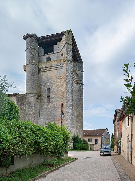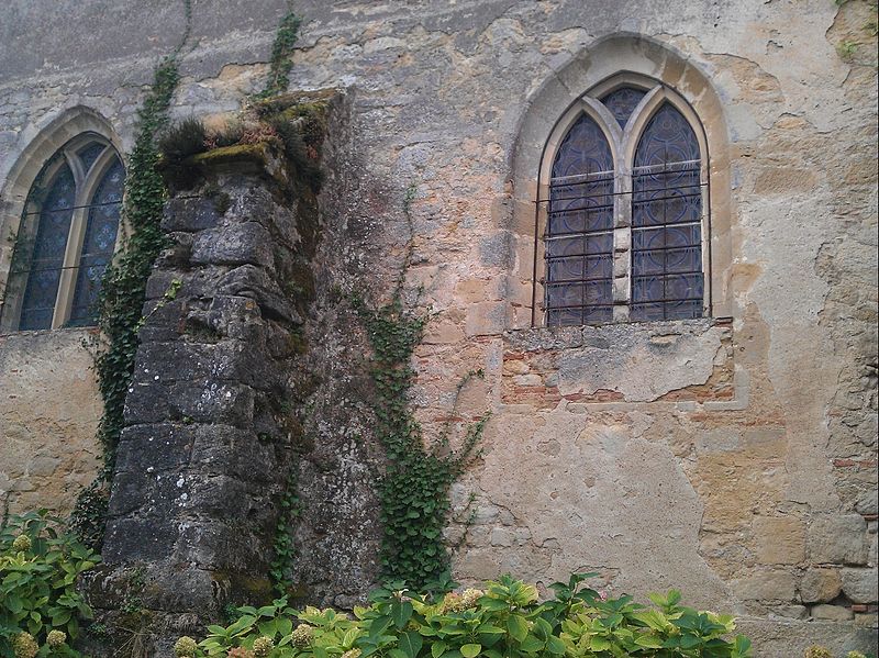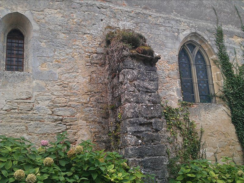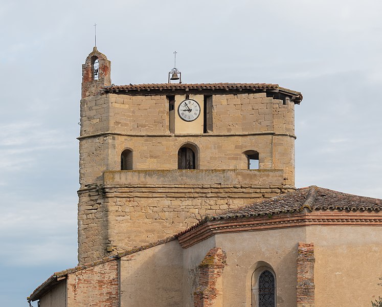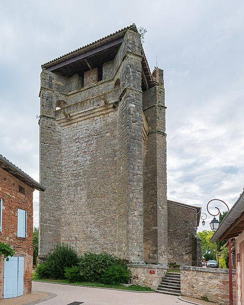 Le clocher, de plan carré et construit en grès, est une structure fortifiée plus ancienne que le reste de l'édifice, datée du XVe siècle. Il est épaulé par quatre contreforts ; celui de la face nord se prolonge en tourelle d'escalier circulaire à partir du premier étage. Le rez-de-chaussée et le premier étage sont voûtés d'ogives, tandis que le second étage abrite les cloches, dont l'une porte la date de 1518. À ce niveau existait une galerie de circulation, en partie logée dans l'épaisseur des murs et en partie portée par trois encorbellements continus, traversant les contreforts.