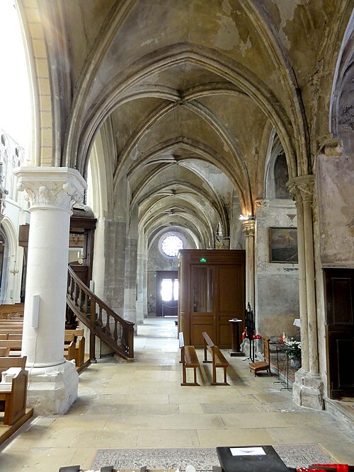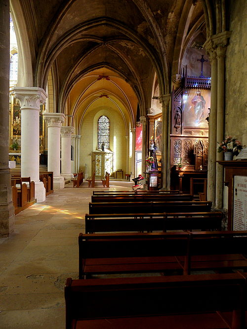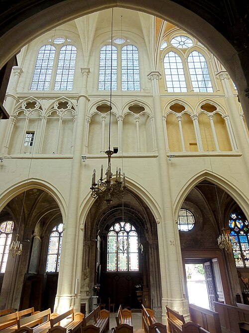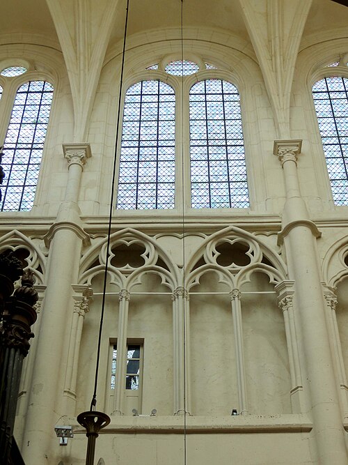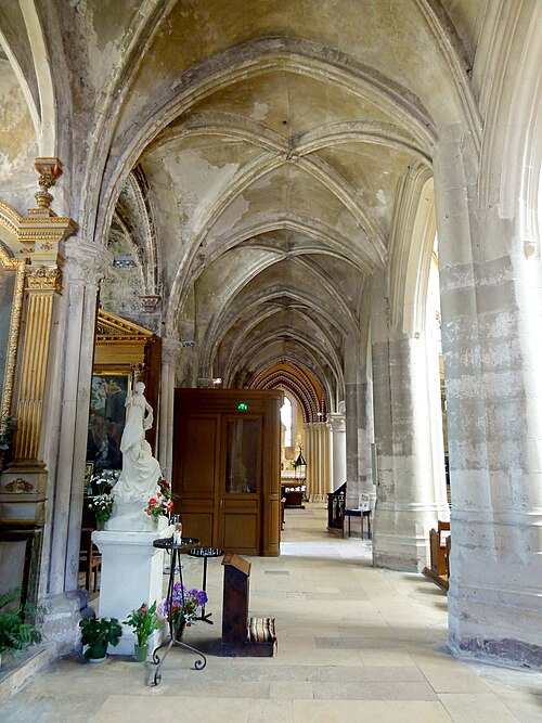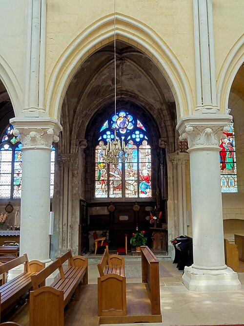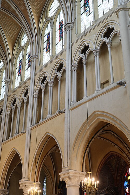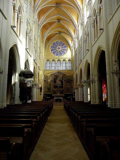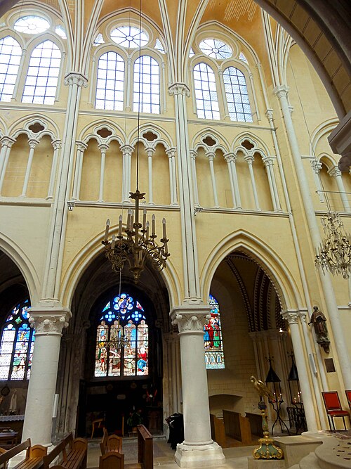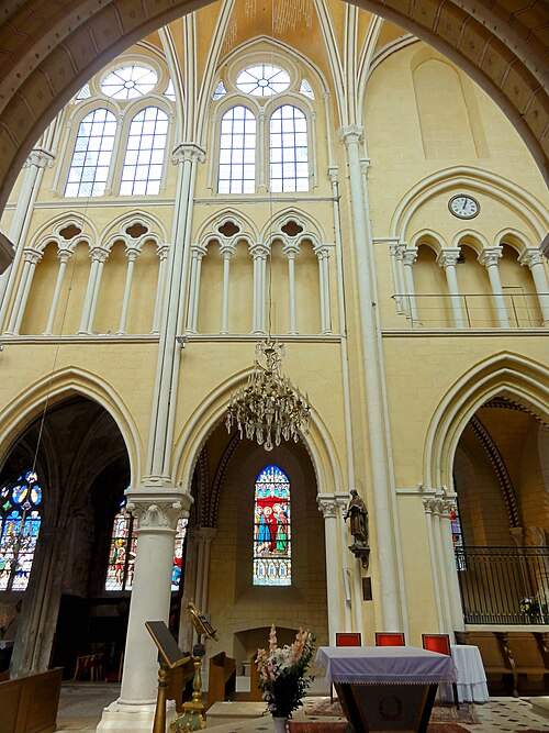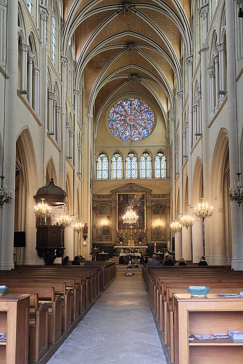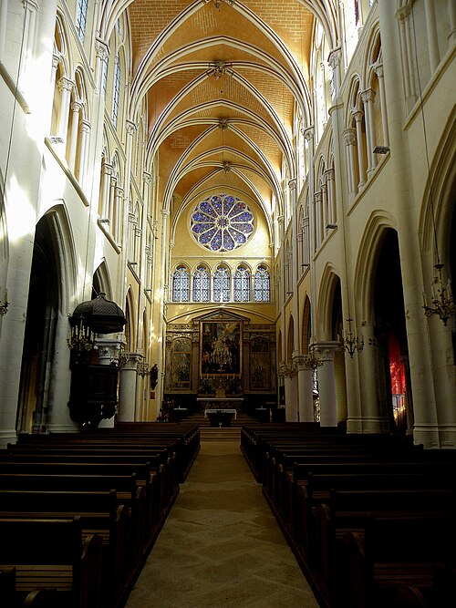 Orientée légèrement vers le nord‑est au chevet, l'église présente un plan essentiellement symétrique sans transept ni déambulatoire, avec un chevet plat, une nef de six travées, deux bas‑côtés et un chœur de deux travées ; la dernière travée nord supporte la base du clocher. L'ensemble du vaisseau central, voûté d'ogives, offre une largeur et une hauteur uniformes sur la majeure partie de sa longueur, et les toitures associent un comble à deux pans pour la nef et des appentis pour les bas‑côtés. Le chevet s'organise sur trois niveaux et se distingue par une claire‑voie à cinq arcades trilobées et une grande rosace d'origine comparée à celle de Notre‑Dame de Paris, dont les vitraux conservent des tonalités remarquables. La base du clocher, percée d'une arcade à triple rouleau et dotée d'une ancienne tribune transformée en faux triforium, présente des dispositions particulières liées au démarrage du chantier par ce massif nord. Les grandes arcades du chœur et du début de la nef retombent sur des piliers monocylindriques et des faisceaux de colonnettes ; le triforium, d'une facture légère proche du gothique rayonnant, dialogue avec des fenêtres hautes qui conservent des dispositions plus anciennes. Dans les deux premières travées ouest, des reprises de la Renaissance ont modifié les supports et les voûtes, avec des chapiteaux corinthiens et des remplages en plein cintre qui contrastent avec les travées orientales. Les bas‑côtés, homogènes dans leurs supports, conservent des lancettes simples profondément ébrasées là où aucune chapelle n'a été ouverte, tandis que certaines chapelles présentent des voûtements en berceau ou des réseaux flamboyants.