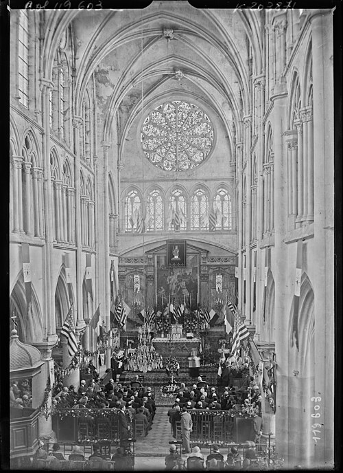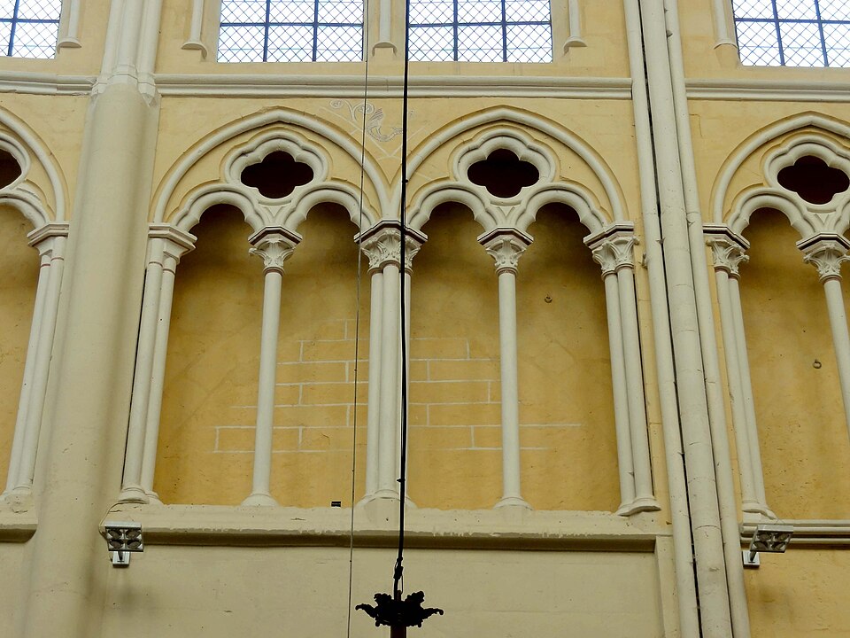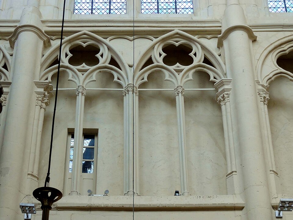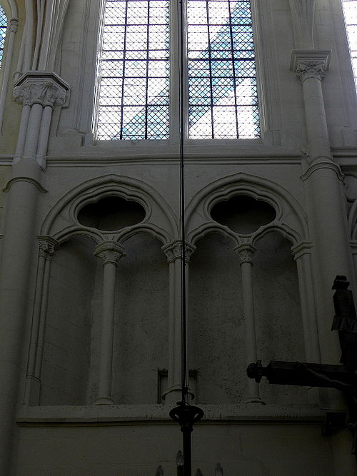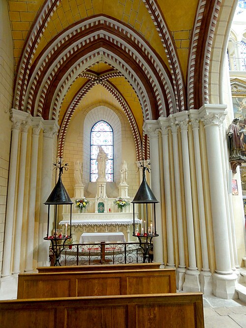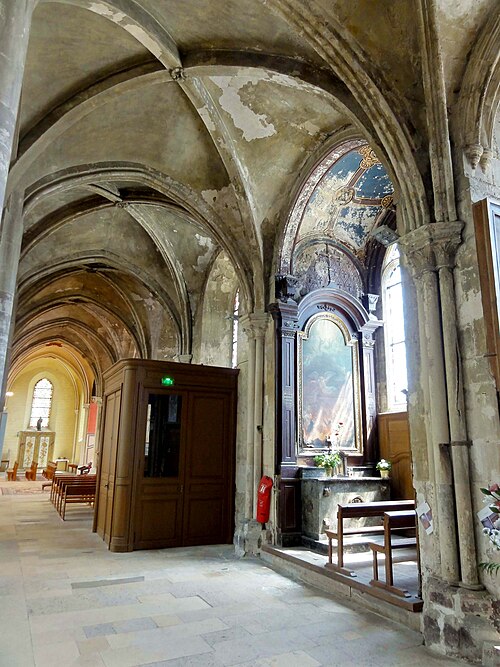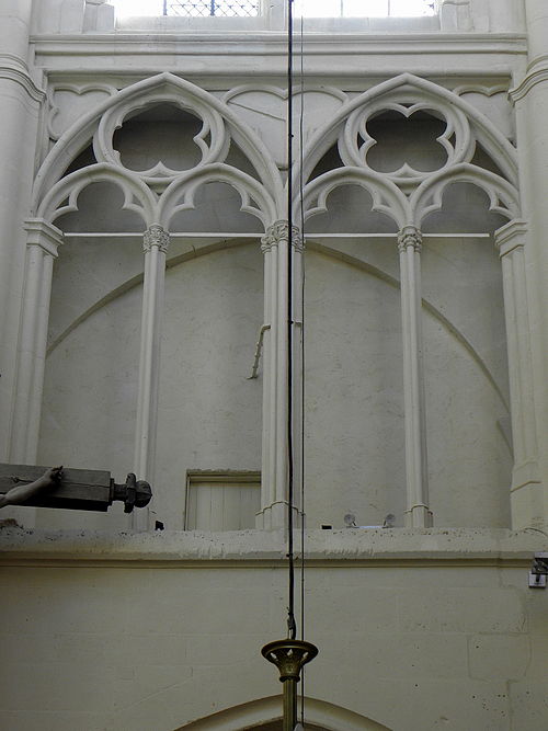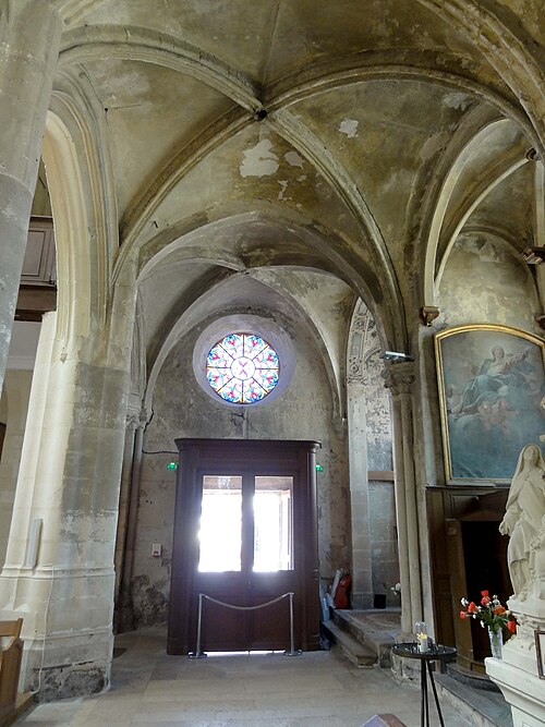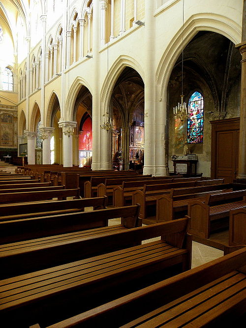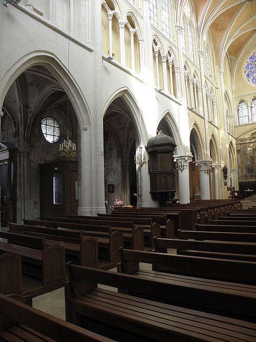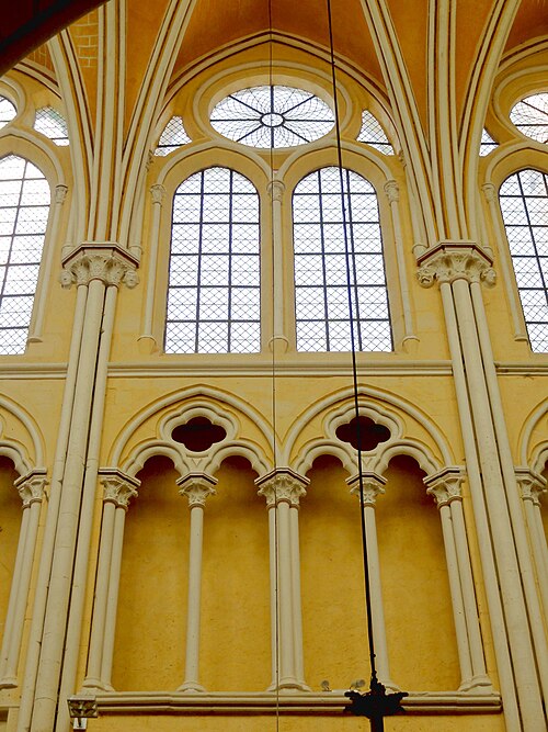 Orientée légèrement vers le nord‑est au chevet, l'église présente un plan essentiellement symétrique sans transept ni déambulatoire, avec un chevet plat, une nef de six travées, deux bas‑côtés et un chœur de deux travées ; la dernière travée nord supporte la base du clocher. L'ensemble du vaisseau central, voûté d'ogives, offre une largeur et une hauteur uniformes sur la majeure partie de sa longueur, et les toitures associent un comble à deux pans pour la nef et des appentis pour les bas‑côtés. Le chevet s'organise sur trois niveaux et se distingue par une claire‑voie à cinq arcades trilobées et une grande rosace d'origine comparée à celle de Notre‑Dame de Paris, dont les vitraux conservent des tonalités remarquables. La base du clocher, percée d'une arcade à triple rouleau et dotée d'une ancienne tribune transformée en faux triforium, présente des dispositions particulières liées au démarrage du chantier par ce massif nord. Les grandes arcades du chœur et du début de la nef retombent sur des piliers monocylindriques et des faisceaux de colonnettes ; le triforium, d'une facture légère proche du gothique rayonnant, dialogue avec des fenêtres hautes qui conservent des dispositions plus anciennes. Dans les deux premières travées ouest, des reprises de la Renaissance ont modifié les supports et les voûtes, avec des chapiteaux corinthiens et des remplages en plein cintre qui contrastent avec les travées orientales. Les bas‑côtés, homogènes dans leurs supports, conservent des lancettes simples profondément ébrasées là où aucune chapelle n'a été ouverte, tandis que certaines chapelles présentent des voûtements en berceau ou des réseaux flamboyants.