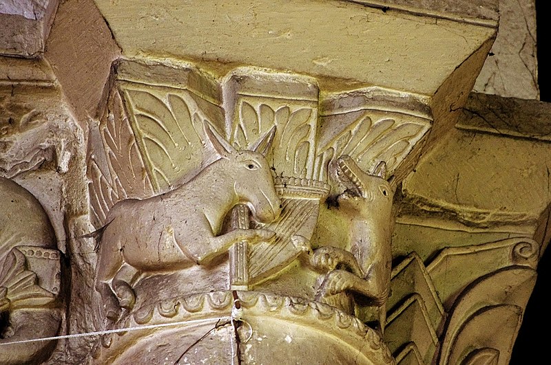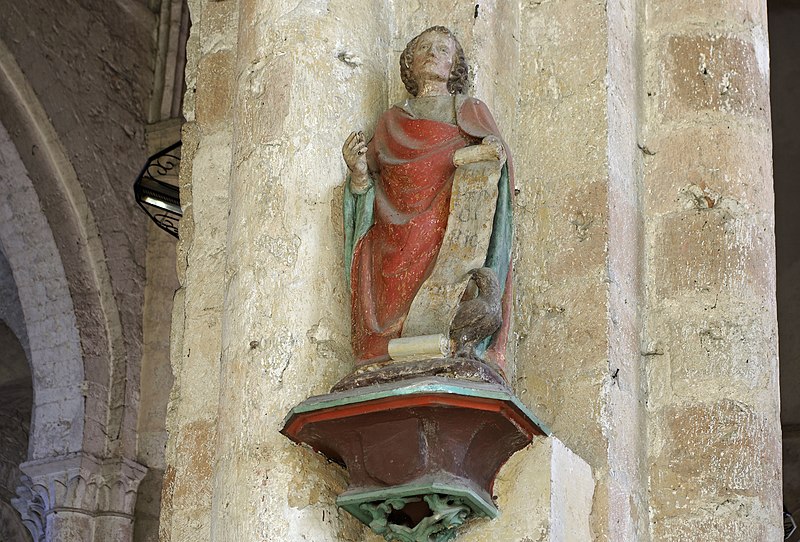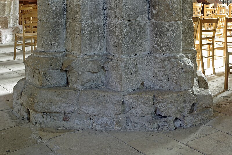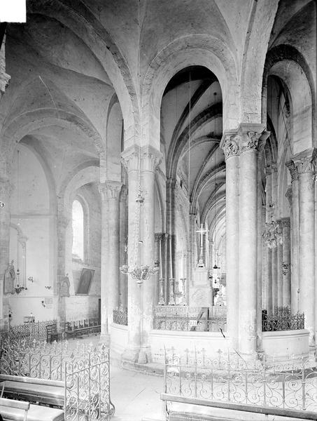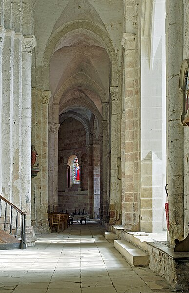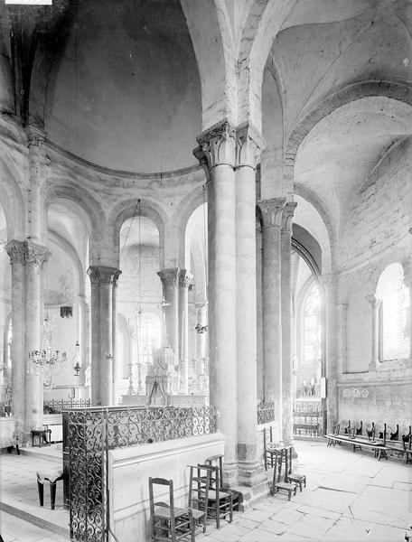 Les chapiteaux, richement sculptés de monstres et de feuillages, présentent une iconographie voisine de celle de Saint-Pierre de Chauvigny et comportent des motifs plus exotiques, comme un éléphant sculpté sur l'une des dernières piles de la nef. Ils racontent des scènes bibliques et morales — mariage mystique de la Vierge, Daniel dans la fosse aux lions, l'âne à la lyre, l'éléphant et le dromadaire, la parole enseignante et la médisance — et les voûtes du rond-point et des absidioles sont en cul-de-four. Les murs du déambulatoire sont renforcés d'arcatures hautes percées de fenêtres en plein cintre ; seules deux des trois chapelles du XIIe subsistent : la chapelle sud dédiée à saint Pierre et la chapelle nord dite de la Trinité, de l'Ecce Homo ou des Tailleurs d'habit, qui abrite la statue de sainte Solange, patronne du Berry.