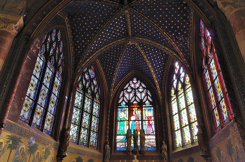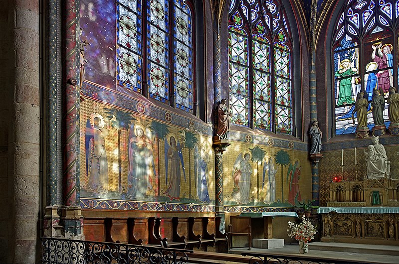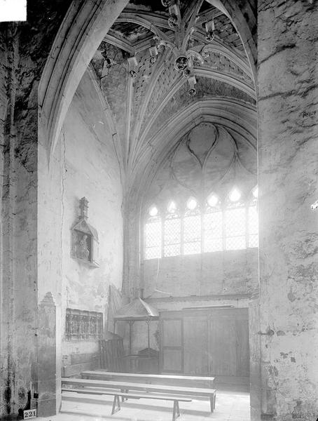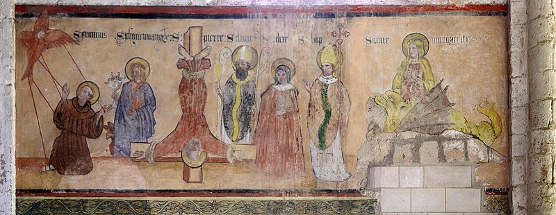 La chapelle axiale a été refaite au XVe siècle ; ses peintures, réalisées en 1864 à la cire par l'abbé Monseigneur de Busseroles aidé de son frère vicaire, représentent notamment les cinq vierges sages tenant des lampes d'or et une statue de sainte Lucie. Sur le mur sud du chœur figurent une fresque de saint Pierre crucifié tête en bas et une autre représentant saint François recevant les stigmates ; cette dernière a été grossièrement reprise au XXe siècle. Le jubé qui séparait autrefois le chœur de la nef a été abattu en 1737, de même que les grilles, le tabernacle et les gradins qui l'entouraient ; le carrelage du chœur date de la même période.