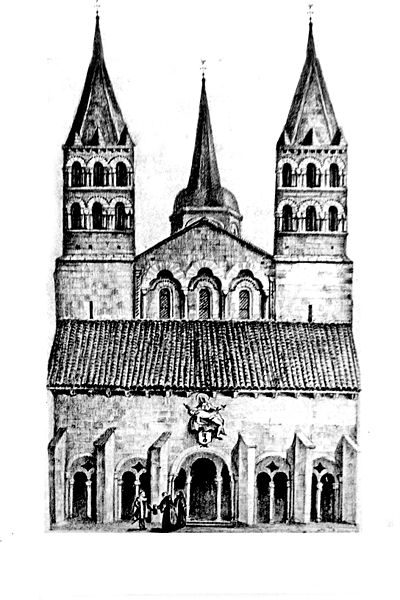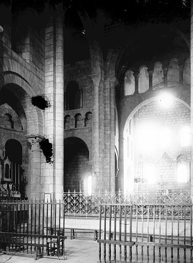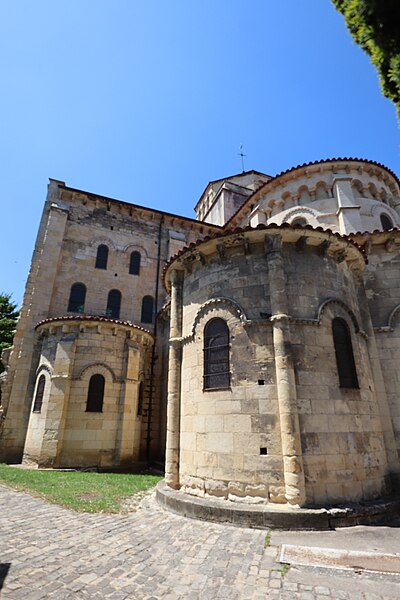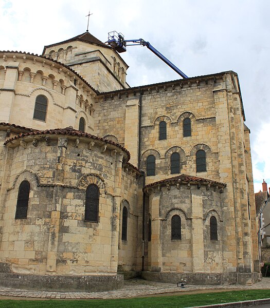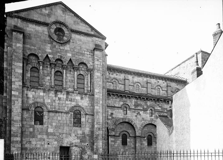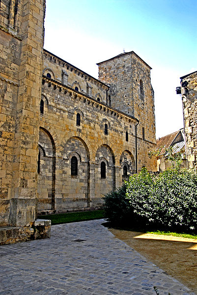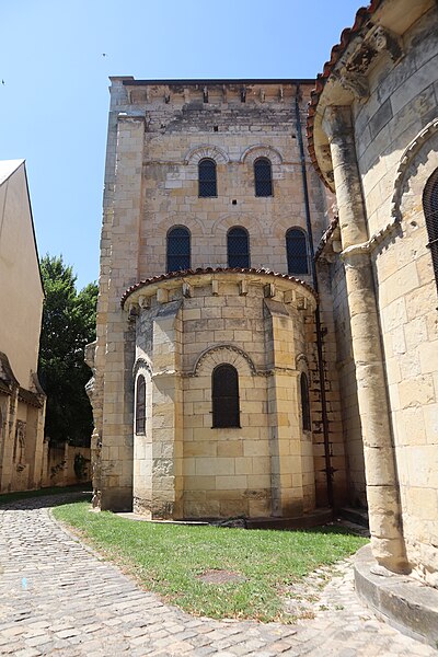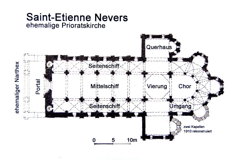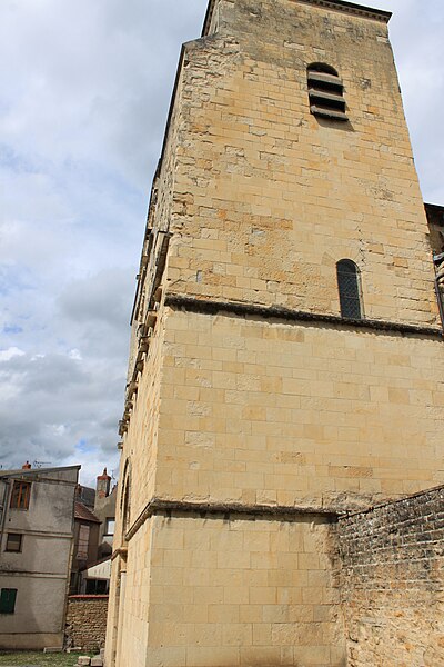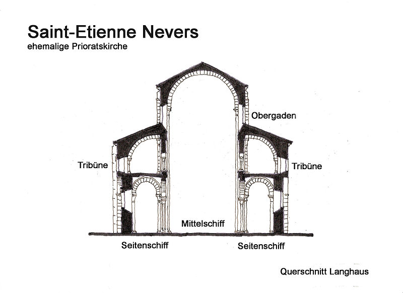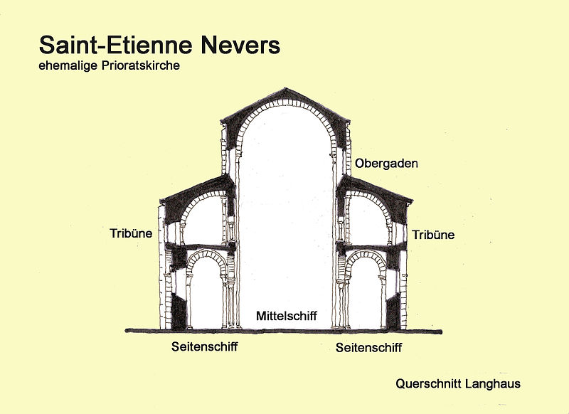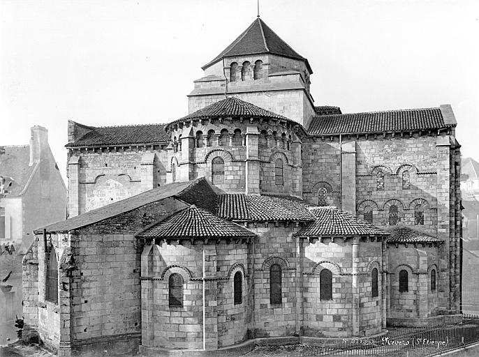 L’église Saint-Étienne de Nevers est un édifice roman de la seconde moitié du XIe siècle situé dans la Nièvre. Le site accueille une communauté religieuse dès le début du VIIe siècle, fondée sous la règle de saint Colomban et dédiée à plusieurs saints, dont saint Étienne et la Vierge. Après des dégradations et une période d’oubli, des chanoines de Saint‑Sylvestre s’y installent brièvement en 1063 avant d’être remplacés par des moines bénédictins. Le prieuré, fondé par le comte Guillaume Ier de Nevers et placé sous l’autorité de Cluny, fait l’objet d’une reconstruction importante de 1063 à 1097, époque à laquelle l’abbé de Cluny Hugues de Semur lance des projets qui influencent l’architecture clunisienne. La charte de 1097 accorde au prieuré d’importantes donations et crée le bourg franc de Saint‑Étienne ; le comte abandonne ses droits aux Clunisiens, qui deviennent seigneurs du bourg jouissant de privilèges et d’un droit d’asile. Le bourg est ceint de remparts élevés par Pierre de Courtenay au XIIe siècle, et ces privilèges ne sont réunis à la ville de Nevers qu’en 1585. Un incendie détruit les bâtiments monastiques en 1420 ; ils sont partiellement reconstruits au XVIIIe siècle. Lors de la Révolution, l’église est désaffectée et transformée en grange, ses trois clochers romans et le narthex sont détruits en 1792 ; elle redevient église paroissiale en 1798 et est classée monument historique en 1840. Des campagnes de restauration ont lieu aux XIXe et XXe siècles, notamment de 1846 à 1851, de 1892 à 1902 pour la façade, en 1905 pour la voûte de la nef et en 1910 pour le croisillon nord et la chapelle rayonnante, tandis que des travaux municipaux démarrés en 1846 dégagent et assainissent l’édifice. Les fouilles de 1974 ont mis au jour la substruction de l’église antérieure avec une abside profonde, au moins une absidiole au nord, quelques sarcophages et une mosaïque représentant saint Colomban. Extérieurement, l’église présente un aspect massif en pierres de taille soigneusement équarries, agrémenté de corniches à modillons, de cordons de billettes et de petites arcatures aveugles. Le plan en croix latine conserve sa composition romane : une nef de six travées à trois niveaux avec tribunes, des collatéraux voûtés d’arêtes surmontés de tribunes, un transept saillant avec absidioles et un chœur en hémicycle entouré d’un déambulatoire ouvrant sur trois chapelles rayonnantes. L’élévation à trois niveaux — arcades, tribune, fenêtres hautes — et la présence de tribunes voûtées en demi‑berceau témoignent de l’influence clunisienne et de l’audace technique de la fin du XIe siècle ; le voûtement en berceau de la nef, soutenu par de puissants doubleaux, représente une réalisation remarquable. La nef, haute de 18 mètres sous la voûte, s’appuie sur de grandes arcades en plein cintre retombant sur des piliers carrés flanqués de colonnes engagées ; la plupart des chapiteaux sont nus, à l’exception de deux à palmes et à feuilles d’acanthe. Le transept demeure saillant, voûté en berceau et couvert à la croisée par une coupole octogonale sur trompes ; ses écrans intérieurs composés de cinq arcatures sur colonnettes sont singuliers en Bourgogne. Le chœur, d’élévation également tripartite, présente un triforium aveugle et cinq baies hautes ; le déambulatoire voûté d’arêtes et les chapelles rayonnantes conservent quelques chapiteaux décorés et plusieurs sarcophages mérovingiens. Parmi les éléments sculptés, les modillons du chevet offrent une riche diversité de motifs — rosaces, chevrons, animaux et figures fantastiques — tandis que le portail, en grande partie restauré, conserve colonnes, voussures et chapiteaux d’origine et témoignait autrefois d’un tympan et d’un linteau sculptés. La façade ouest actuelle diffère de la composition romane originelle : le narthex roman et les étages supérieurs des clochers ont été détruits en 1792, ne laissant que des souches massives ; néanmoins subsistent trois baies trilobées et le grand portail. La toiture est couverte de tuiles romaines et les murs sont en moyen appareil à joints fins. Le cloître conserve une galerie de quatre travées voûtées sur croisées d’ogives retombant sur des masques et des motifs végétaux, et les vestiges du cloître s’accrochent au bas‑côté sud de l’église. Parmi les objets d’art classés figurent une statue en marbre de saint Jean‑Baptiste et une statue polychrome de saint Fiacre, toutes deux datées du XVe siècle et classées monuments historiques. Les vestiges conventuels au sud de l’église rappellent l’incendie de 1420 et les reprises ultérieures. Enfin, les dimensions connues de l’édifice sont une longueur totale de 50,70 mètres, une longueur de transept de 33,45 mètres, une largeur de nef de 7,80 mètres et une largeur des collatéraux de 3,10 mètres.