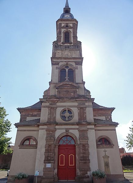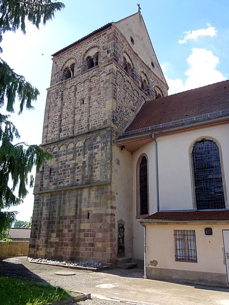 L'église catholique Saint-Étienne est située rue de l'Église à Réguisheim, dans le département du Haut-Rhin. Elle est classée au titre des monuments historiques depuis 1988. La tour, attribuée à la limite des XIe et XIIe siècles d'après des travaux historiques, constitue le dernier vestige de l'édifice médiéval. L'église la plus ancienne connue sur le site remonte au XIIe siècle, probablement vers 1160, et s'inspirait du style ottonien avec des massifs occidental et de chœur. Vers la fin du XIIIe siècle ou au début du XIVe siècle, un incendie provoqua l'effondrement d'une partie du massif occidental. L'édifice fut reconstruit au plus tôt en 1313, puis rasé au XVIIIe siècle et remplacé par un bâtiment néoclassique ; le chœur et la nef datent de 1778. La date portée sur le portail, 1888, correspond à la construction du clocher. La tour romane, dernier vestige de l'église du XIIe siècle, se distingue par un aspect massif nuancé par une riche ornementation. Elle mesure 7,35 m de longueur sur 11,05 m de largeur et se développe en élévation sur quatre niveaux coiffés d'une toiture en bâtière, chaque étage étant légèrement en retrait. Les deux premiers niveaux sont en grand appareil, les suivants en moyen appareil ; la façade est animée de lésènes et de frises d'arcatures retombant sur des colonnettes engagées. Le traitement des façades est inégal : la façade sud est peu ornée tandis que les façades nord et ouest étaient plus décorées, la façade ouest ayant été presque entièrement détruite par l'incendie médiéval et rebâtie de façon sommaire en briques enduites. À l'origine, la tour formait un massif occidental dérivé du plan à chœurs opposés des églises ottoniennes mais, au XIIe siècle, elle ne disposait pas de chœur et servait de porche — ce que Louis Grodecki qualifie de massif-porche. Elle était alors ouverte à l'ouest par une arcade et communiquait avec la nef par un portail monumental en plein cintre ; l'espace intérieur était voûté d'arêtes et ne mettait pas en communication les étages. Ce porche couvert a pu, peut-être, servir aussi à des inhumations ou à des baptêmes, mais l'absence de sources ne permet pas de l'affirmer formellement.
