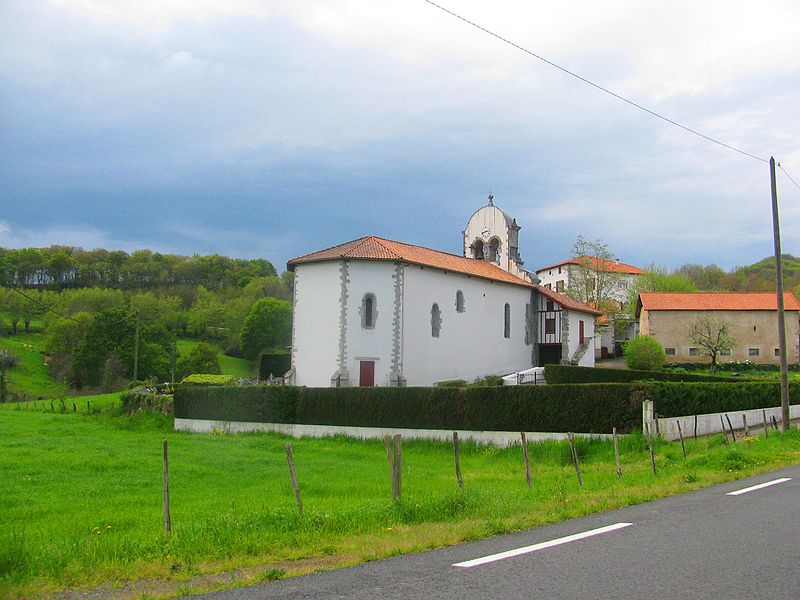 La paroisse de Saint-Esteben est mentionnée dès 1320. L'église actuelle semble toutefois dater du XVIIe siècle : elle a probablement été reconstruite ou fortement remaniée au cours de ce siècle après les destructions causées par les guerres de religion. Le mur de façade ouest, dans lequel s'ouvre une porte surmontée de la date 1692, est postérieur aux murs de la nef. On peut donc avancer l'hypothèse d'une reconstruction dans la première moitié du XVIIe siècle, postérieure à 1620 (mise au pas des huguenots), puis d'une reprise de la façade en 1692. Au XVIIIe siècle, le presbytère adossé à la façade a été construit et l'intérieur de l'église a été aménagé, avec notamment tribunes et chœur, auxquels le XIXe siècle a ajouté le garde-corps du chœur. L'édifice constitue un bon exemple d'église traditionnelle basque : nef unique, plafond lambrissé, double niveau de tribunes et mobilier de chœur très riche. La mairie a pris place dans l'ancien presbytère du XVIIIe siècle.