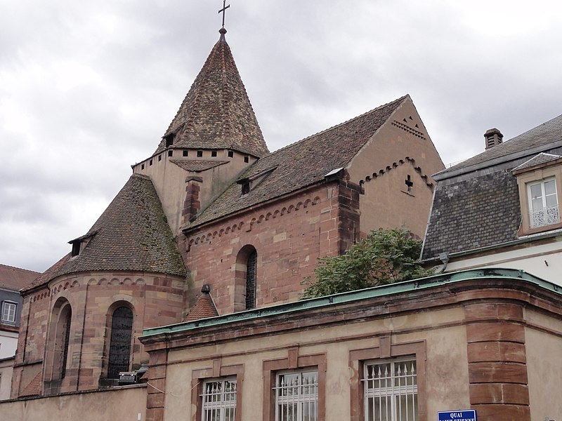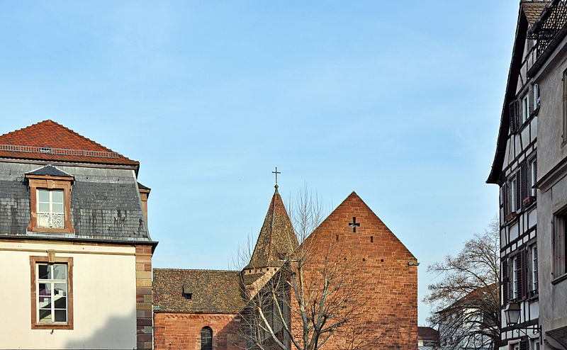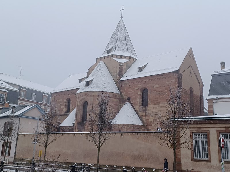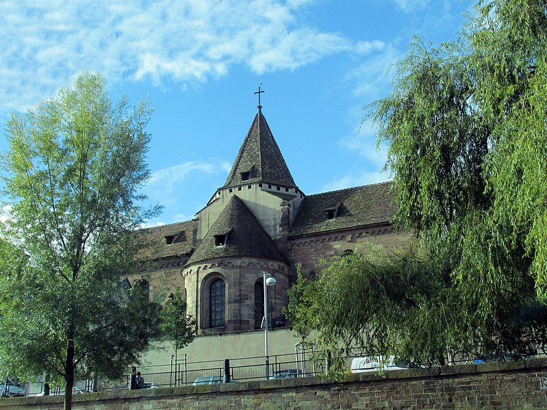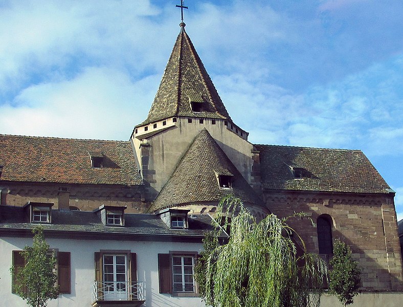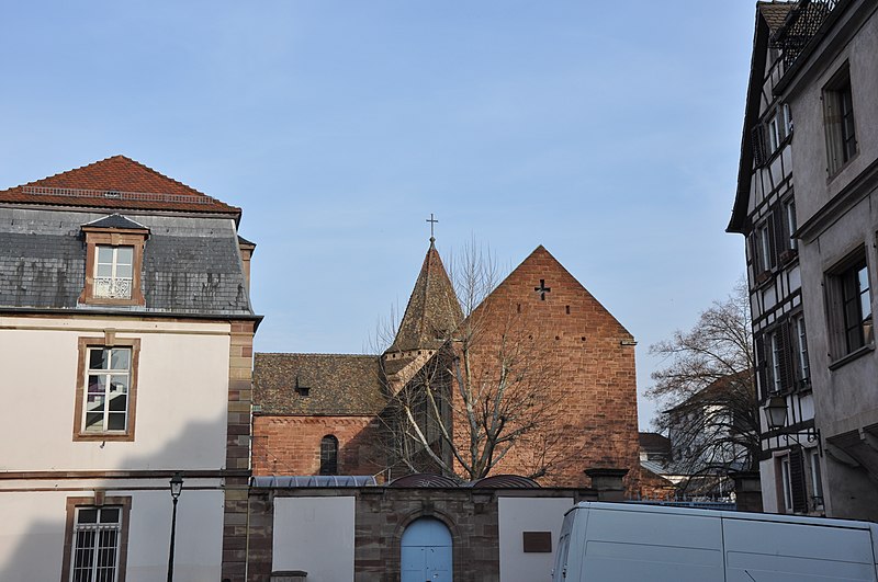 L’église Saint‑Étienne de Strasbourg se situe place Saint‑Étienne, dans l’enceinte du collège épiscopal du même nom, au cœur du centre historique, et elle est classée au titre des monuments historiques depuis 1862. Le site a d’abord accueilli un sanctuaire romain dédié à Mercure, réutilisé par les chrétiens dès le IVe siècle, puis une basilique y fut édifiée au Ve siècle dont la crypte conserve des vestiges. Au VIIe siècle, l’évêque Arbogast y fit construire la première cathédrale de la ville. L’abbaye de bénédictines Saint‑Étienne a été fondée par le duc Adalbert d’Alsace ; Sainte Attale, sa fille, en fut la première abbesse. Une charte de Lothaire de 845 mentionne une fondation en 722 mais Jean‑Jacques Hatt signale que cette charte paraît falsifiée, la situant près d’un bras de la Bruche. Selon la tradition rapportée dans la Strassburgische Cronica de Königshofen, l’église aurait été élevée sur les ruines du palais fortifié du comes romain, et une abside mérovingienne a été découverte sous les fondations de l’ancienne tour en 1956. L’église abbatiale fut reconstruite en 1220 dans un style romano‑gothique, et le monastère se transforma au XIe siècle en chapitre de chanoinesses séculières. En 1541 les chanoinesses se révoltèrent contre l’évêque et adoptèrent la Réforme protestante. Lors du siège de Strasbourg par les armées de Louis XIV en septembre 1681, la ville capitula le 30 septembre ; l’abbaye fut rendue au culte catholique en 1687, occupée d’abord par des Antonins puis, à partir de 1702, par des Visitandines qui ouvrirent en 1718 un pensionnat pour les jeunes filles de la noblesse. Les religieuses furent expulsées en 1792. Au XIXe siècle, l’église perdit son clocher en 1802, fut transformée en théâtre municipal en 1805 et accueillit un petit séminaire entre 1821 et 1874. Durant la Seconde Guerre mondiale, Adolf Hitler interdit tout culte à la cathédrale de Strasbourg et les paroissiens durent se rendre à la chapelle du collège Saint‑Étienne, où l’archiprêtre Eugène Fischer fut installé en 1942. Les bombardements alliés du 25 septembre 1944 détruisirent une grande partie de l’édifice : la toiture s’effondra en détruisant la chaire, l’autel, l’orgue, des tableaux, des statues et des bancs ; seuls le chœur et la nef restèrent debout. De l’édifice d’origine, il ne subsiste aujourd’hui que le large transept voûté avec sa triple abside ; en 1961 une nouvelle nef aux piliers élancés et à charpente apparente fut reconstruite et un mur en bossage assure la fonction de façade. En 2018 ont été célébrés les 1 300 ans de la fondation de l’abbaye Saint‑Étienne. L’église conserve le reliquaire de la main de sainte Attale, morte en 741, fille du duc d’Alsace Adalbert et nièce de sainte Odile. En 2016, l’ancien orgue du conservatoire de Strasbourg, construit en 1963 par Curt Schwenkedel et inutilisé depuis le déménagement du conservatoire en 1995, a été installé dans la nef.